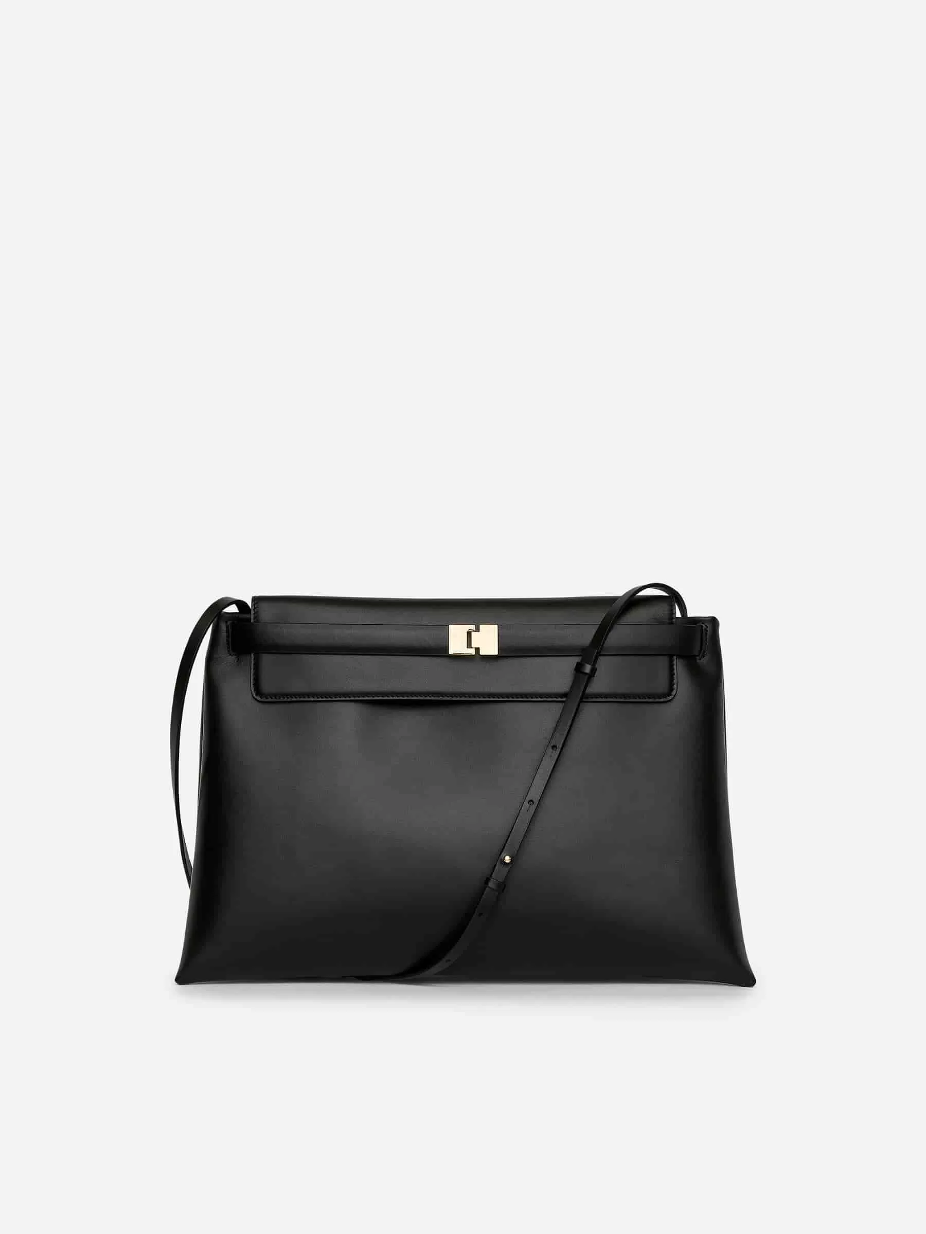 Bag crafted from chrome-free leather. Styled with a detachable belt with a gold-plated buckle around top flap. Removable shoulder strap and zip closure. The bag can be worn as a clutch or on the shoulder. Measurements 39 x 25,5 cm.