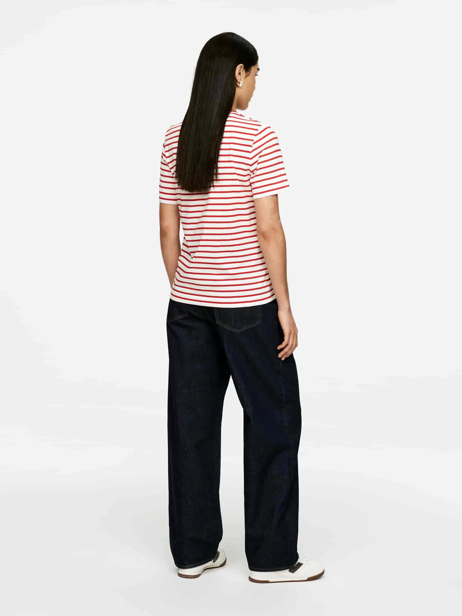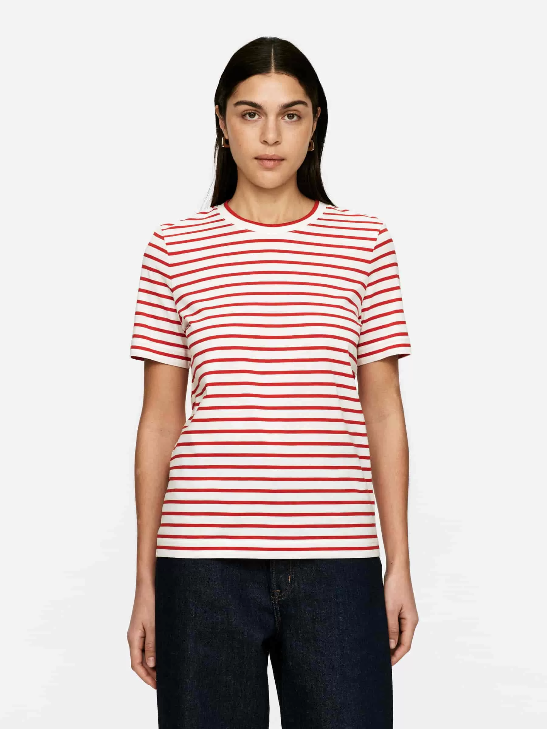 T-shirt knit from a smooth, compact long-staple cotton. Designed with a regular fit of single jersey with a ribbed piping around the crew-neck.