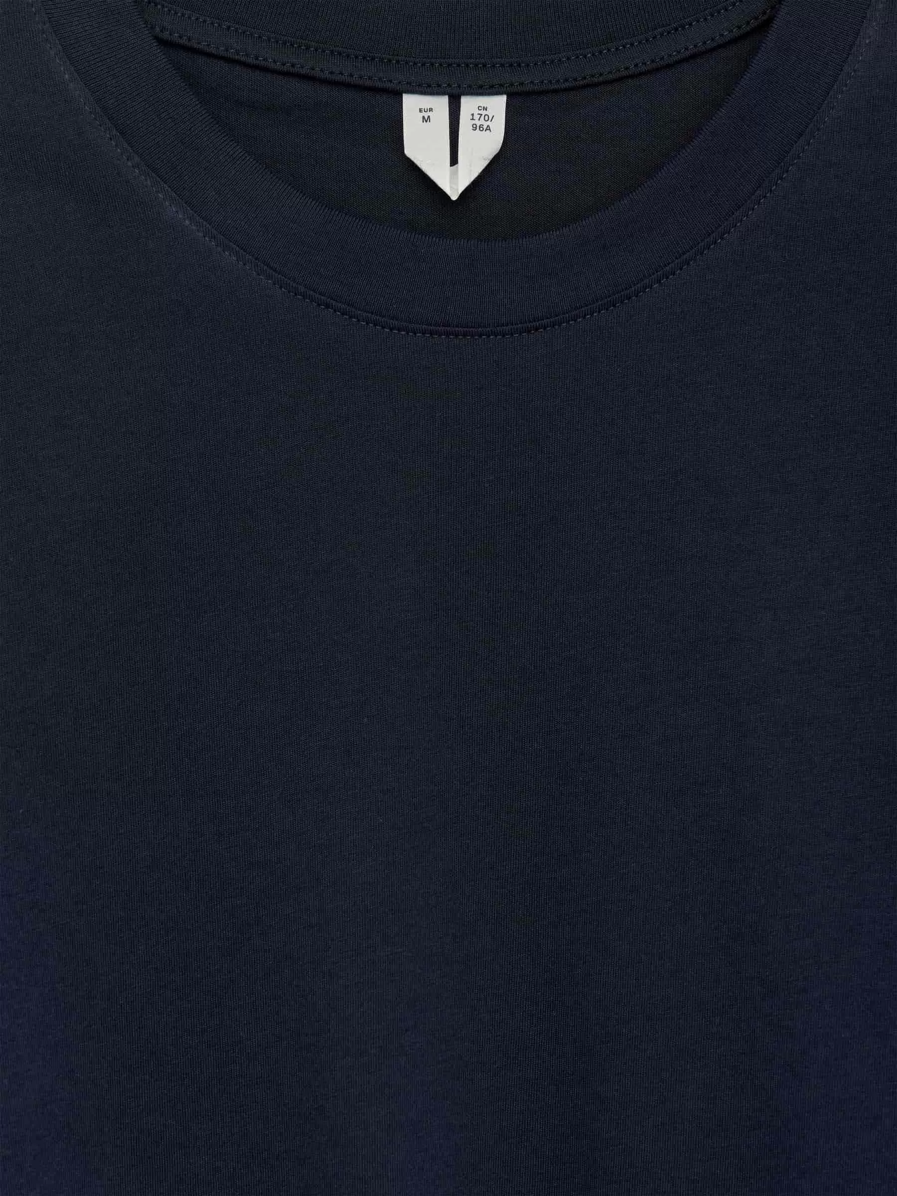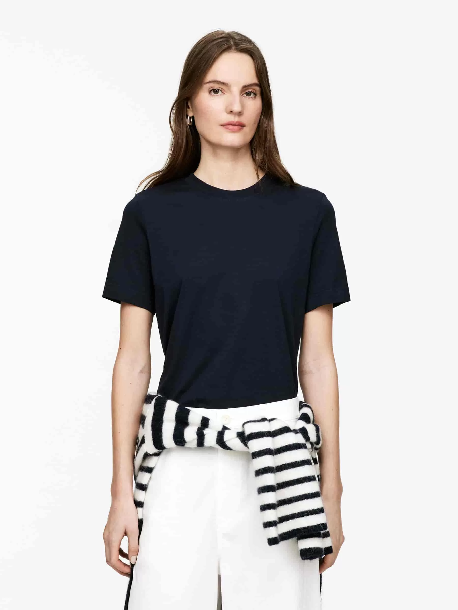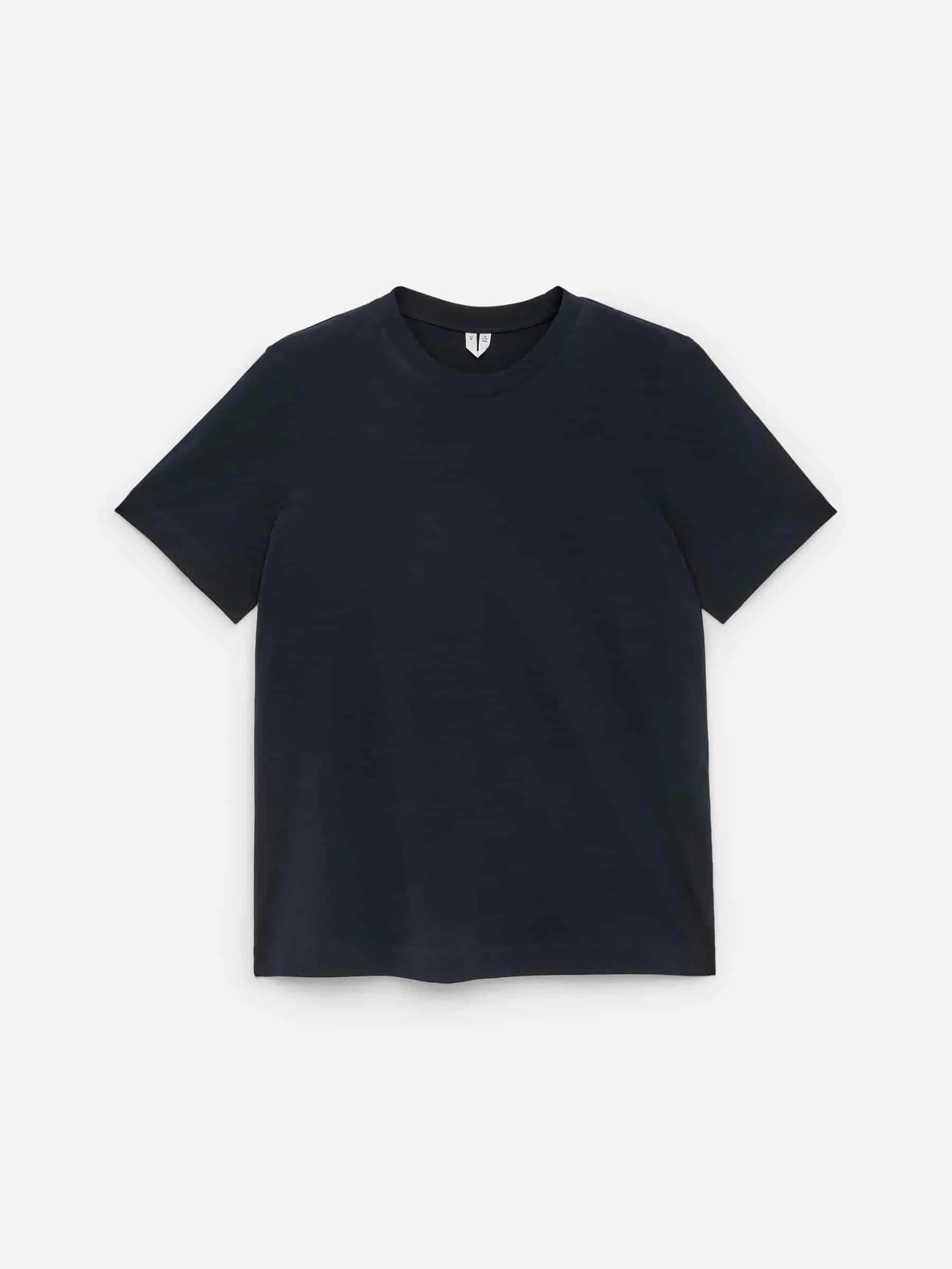 T-shirt knit from a smooth, compact long-staple cotton. Designed with a regular fit of single jersey with a ribbed piping around the crew-neck.