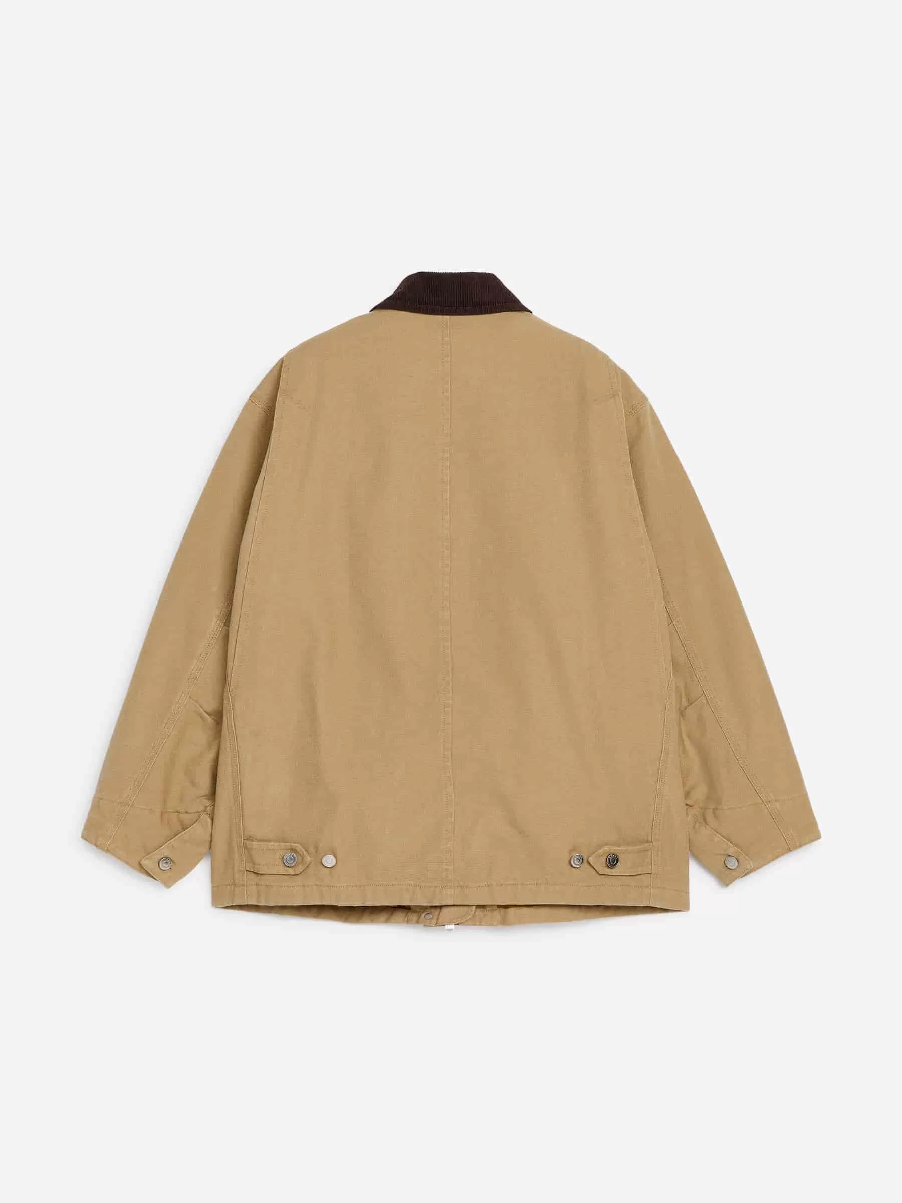 Workwear-inspired jacket in a stone-washed canvas fabric. This is a padded style with a corduroy collar, a two-way metal zip at front and patch pockets with shank buttons.