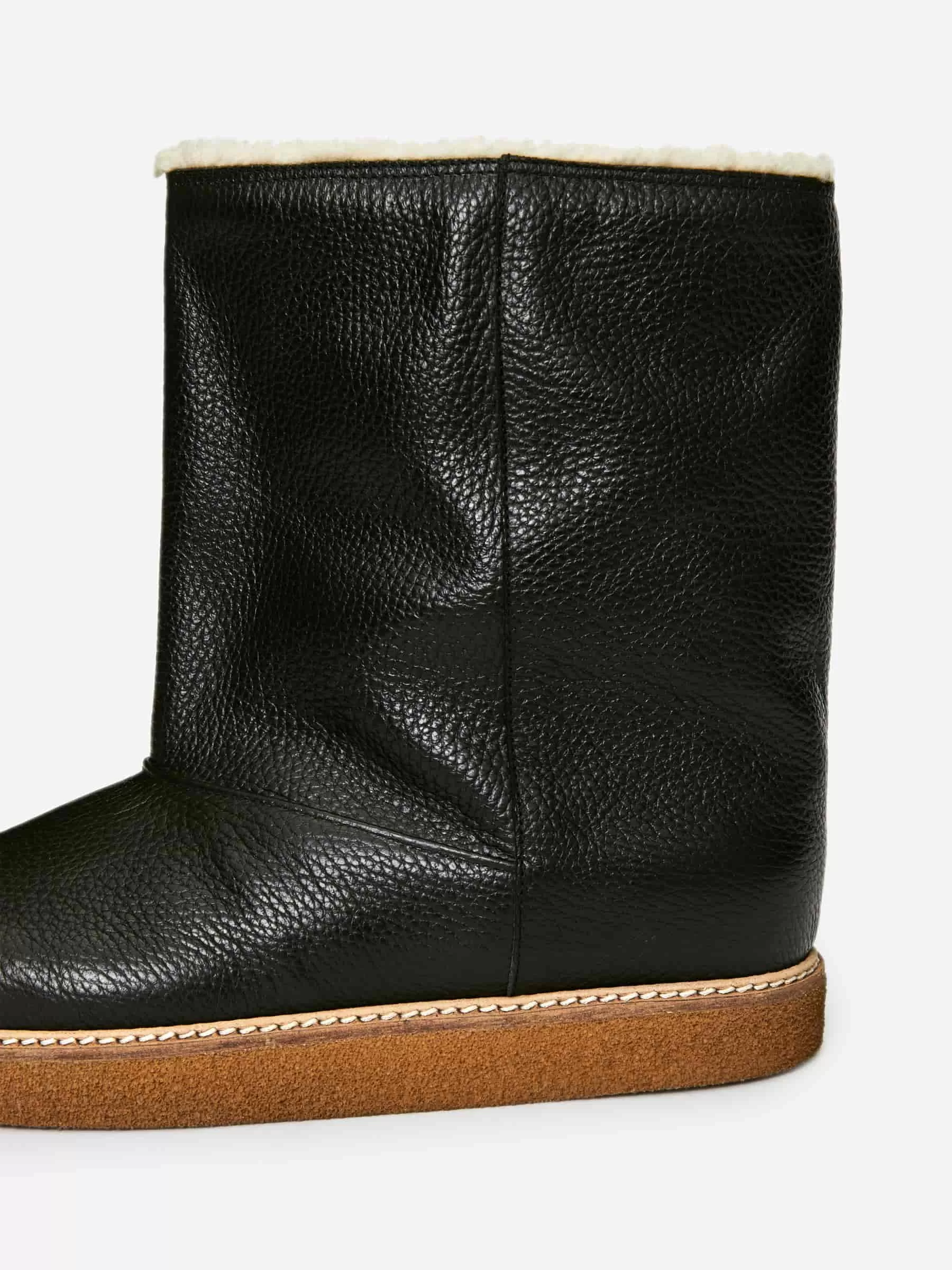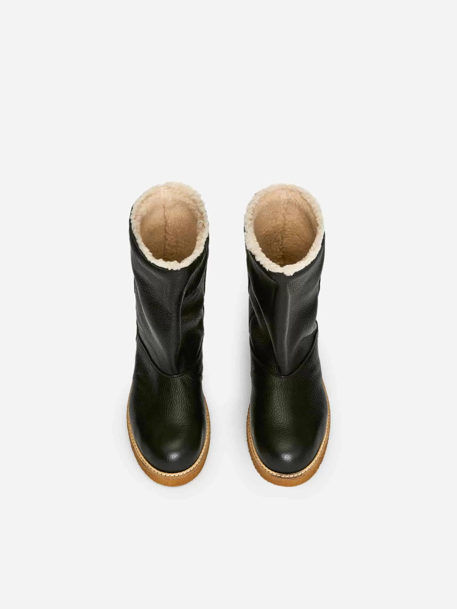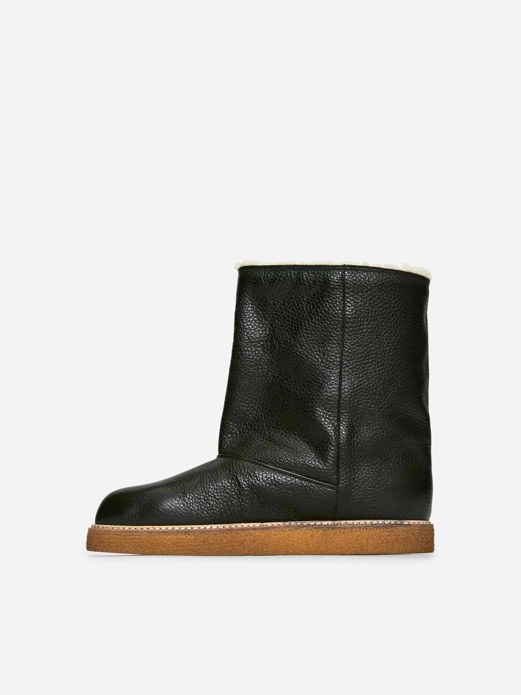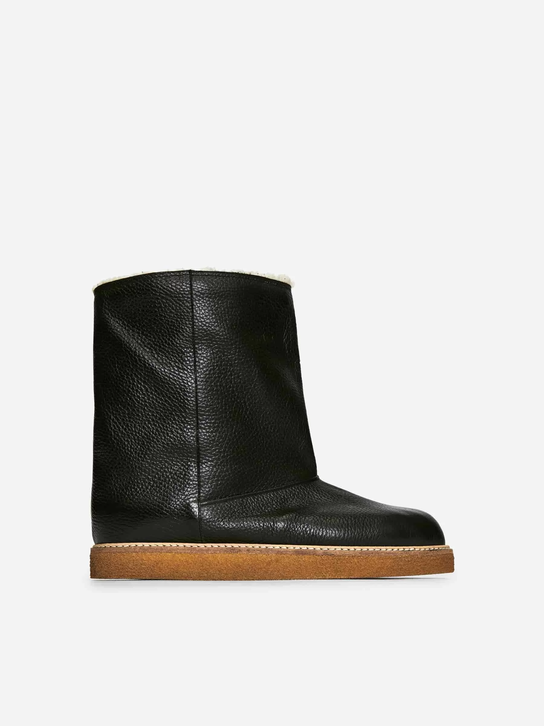 Leather boots with faux shearling lining. A warming style with a welt with decorative stitching details.
