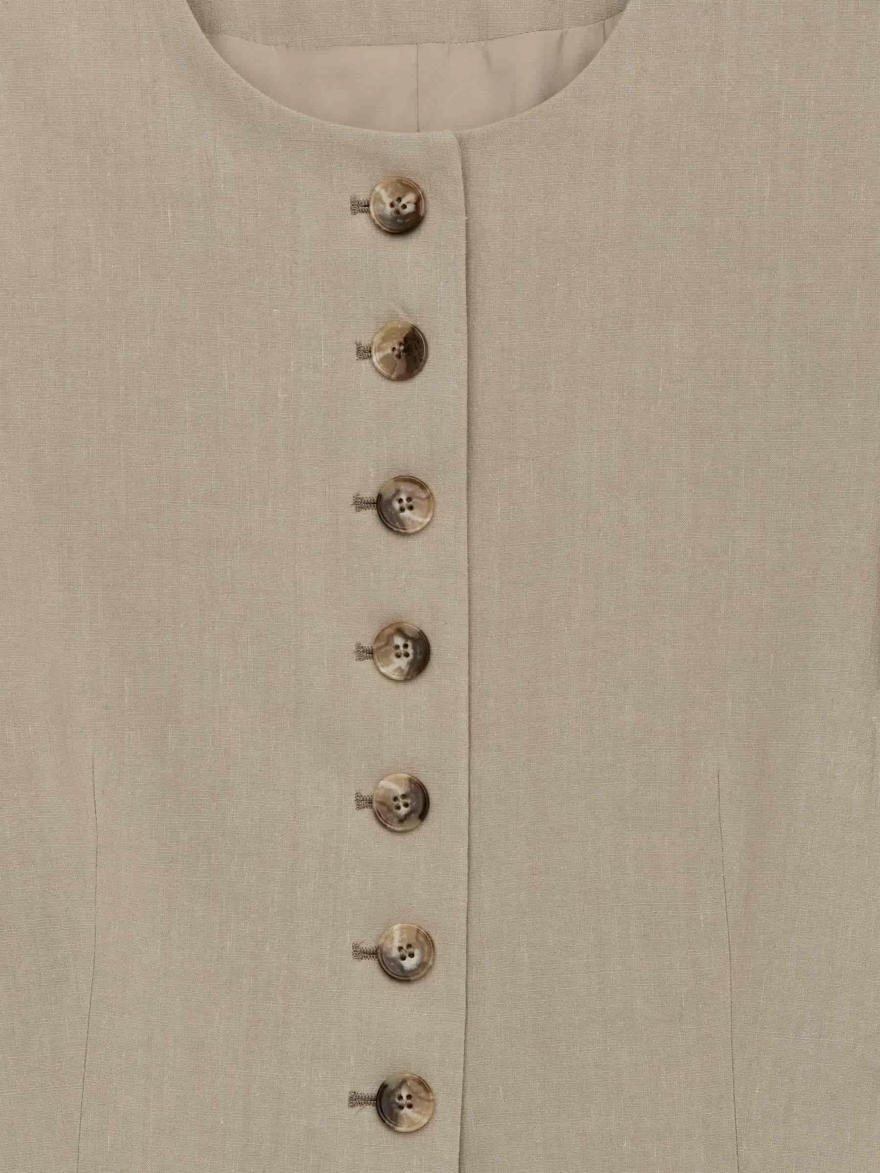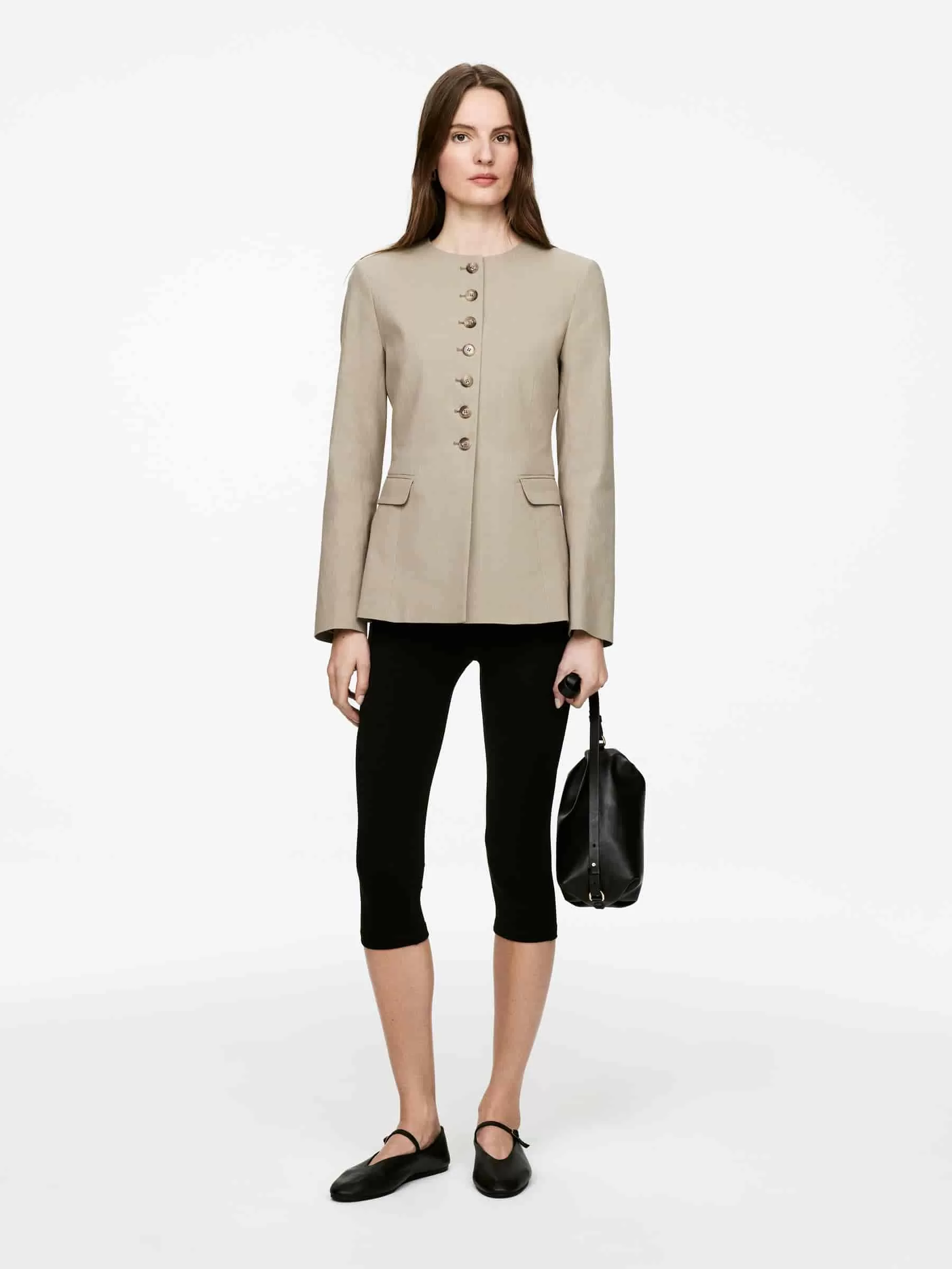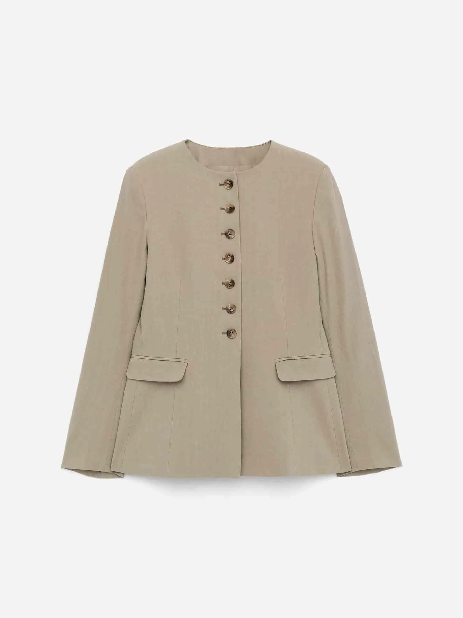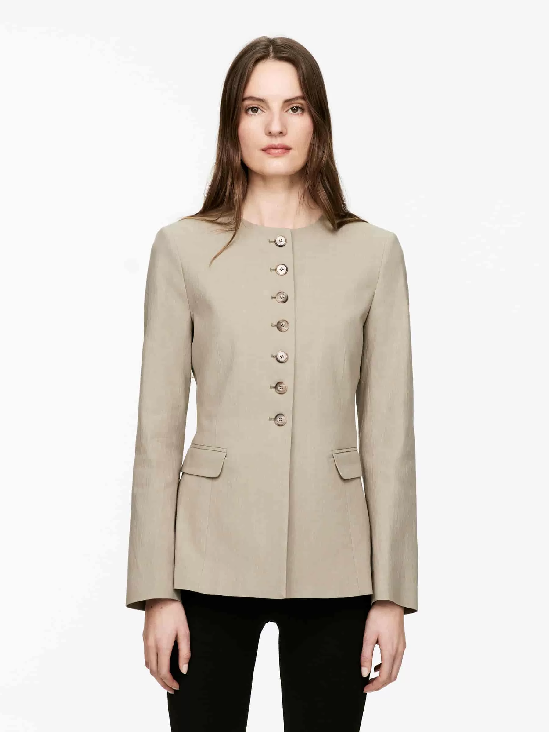 Collarless blazer with button closure, dart detailing, and flap pockets. This lined style is cut for a slim fit.
