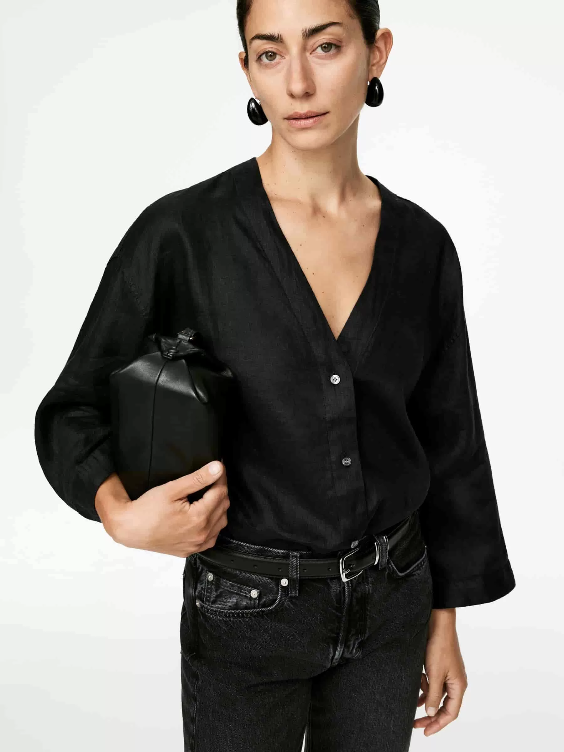 Short-sleeved blouse crafted from linen. Styled with button closure and a loose fit.