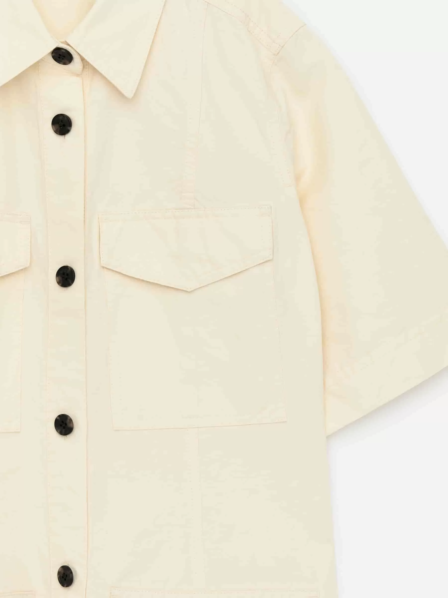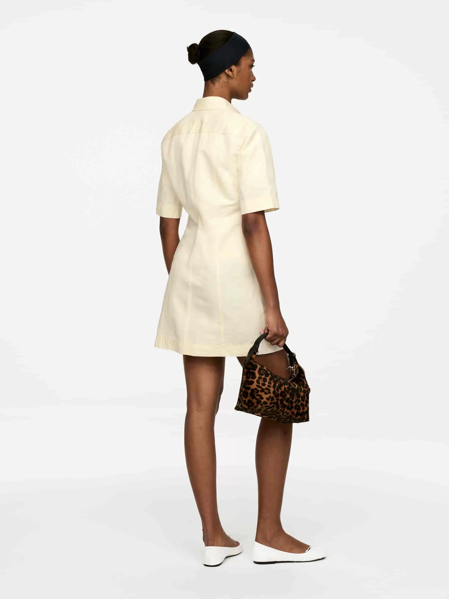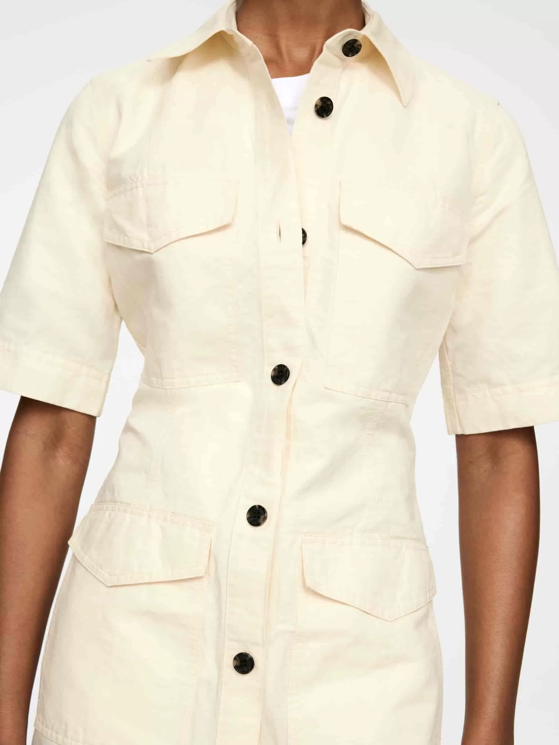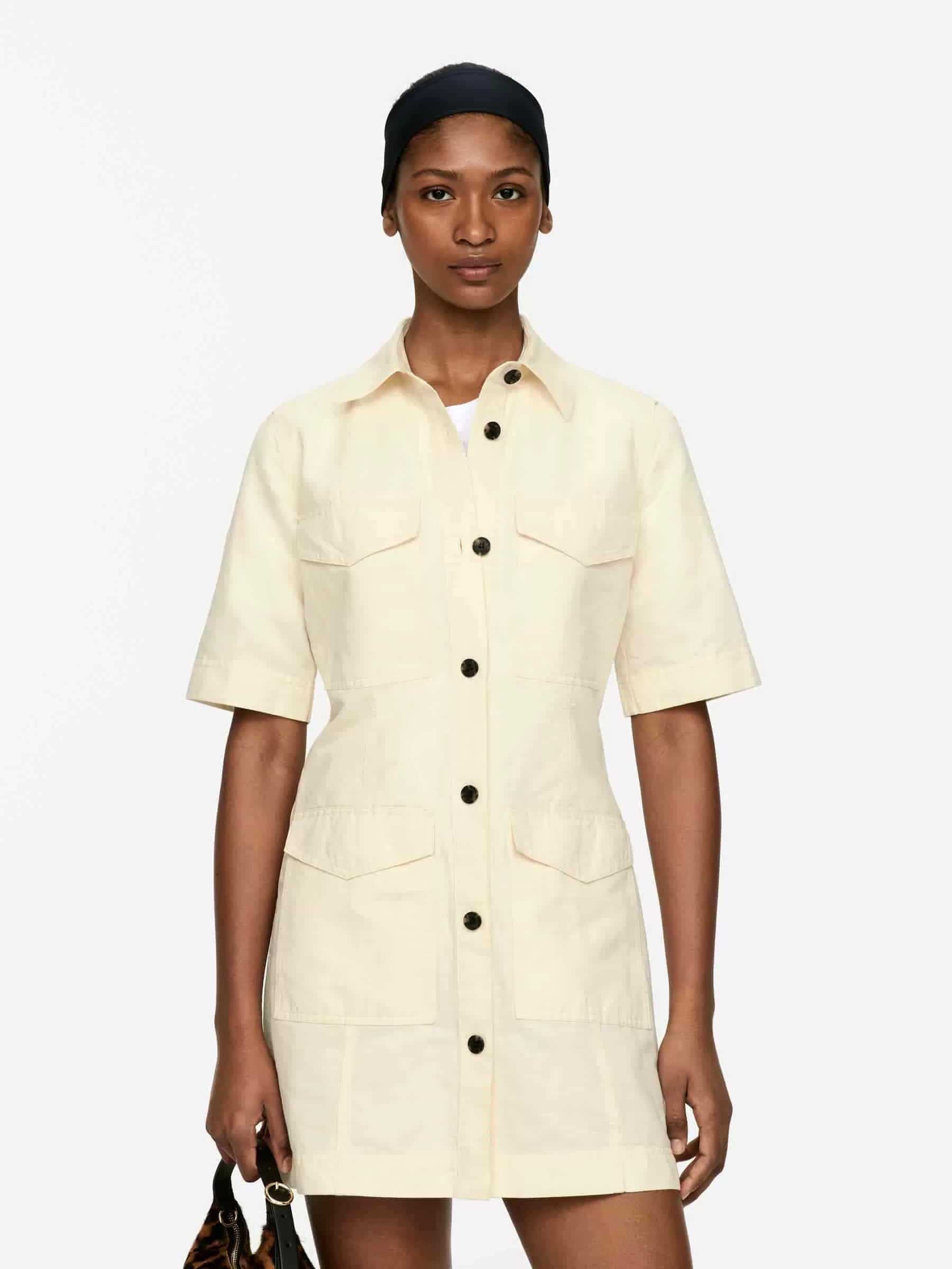 Workwear-inspired mini dress crafted from a blend of linen and cotton. Detailed with button closure and pockets at chest and waist.