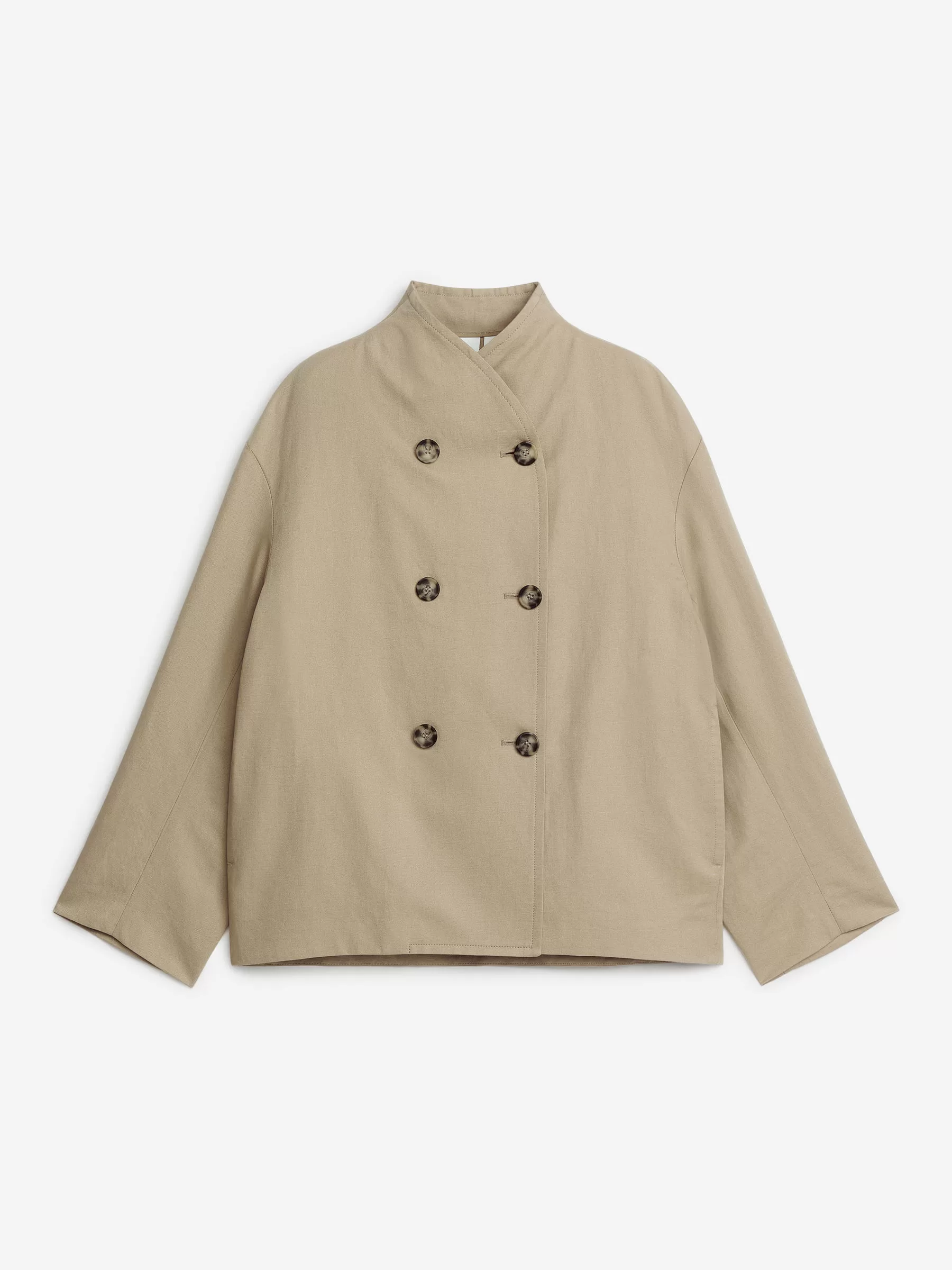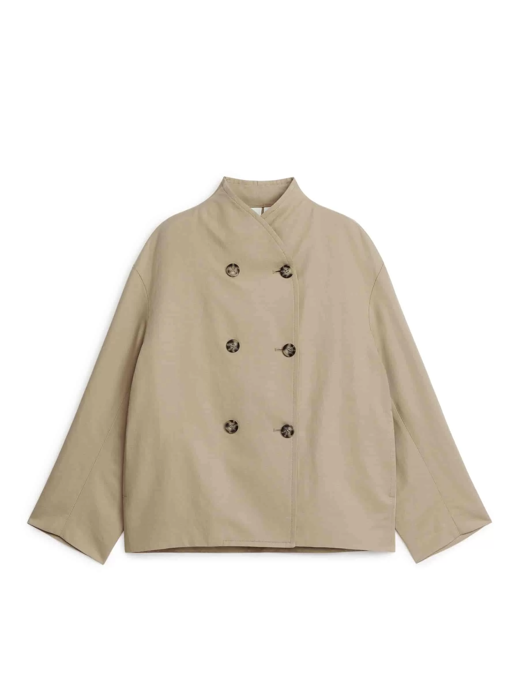 Double-breasted jacket crafted from a woven blend of linen and cotton. Cut for an oversized, slightly rounded silhouette and detailed with a shawl colour. Pockets at side seams. Unlined.