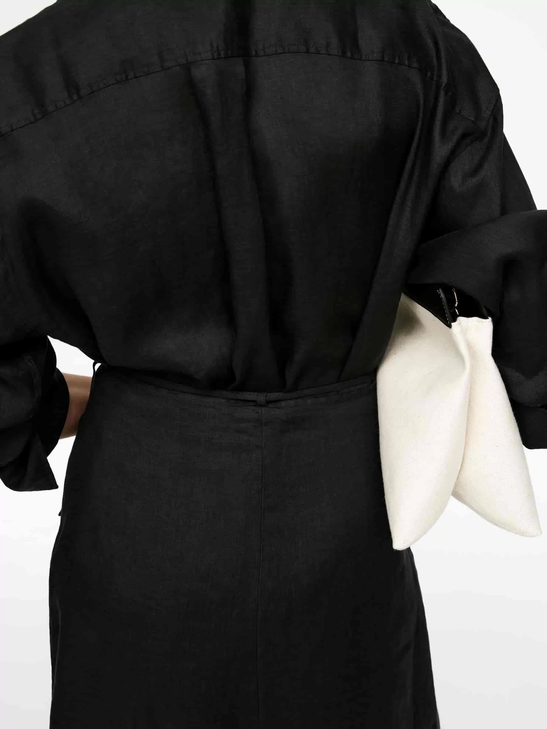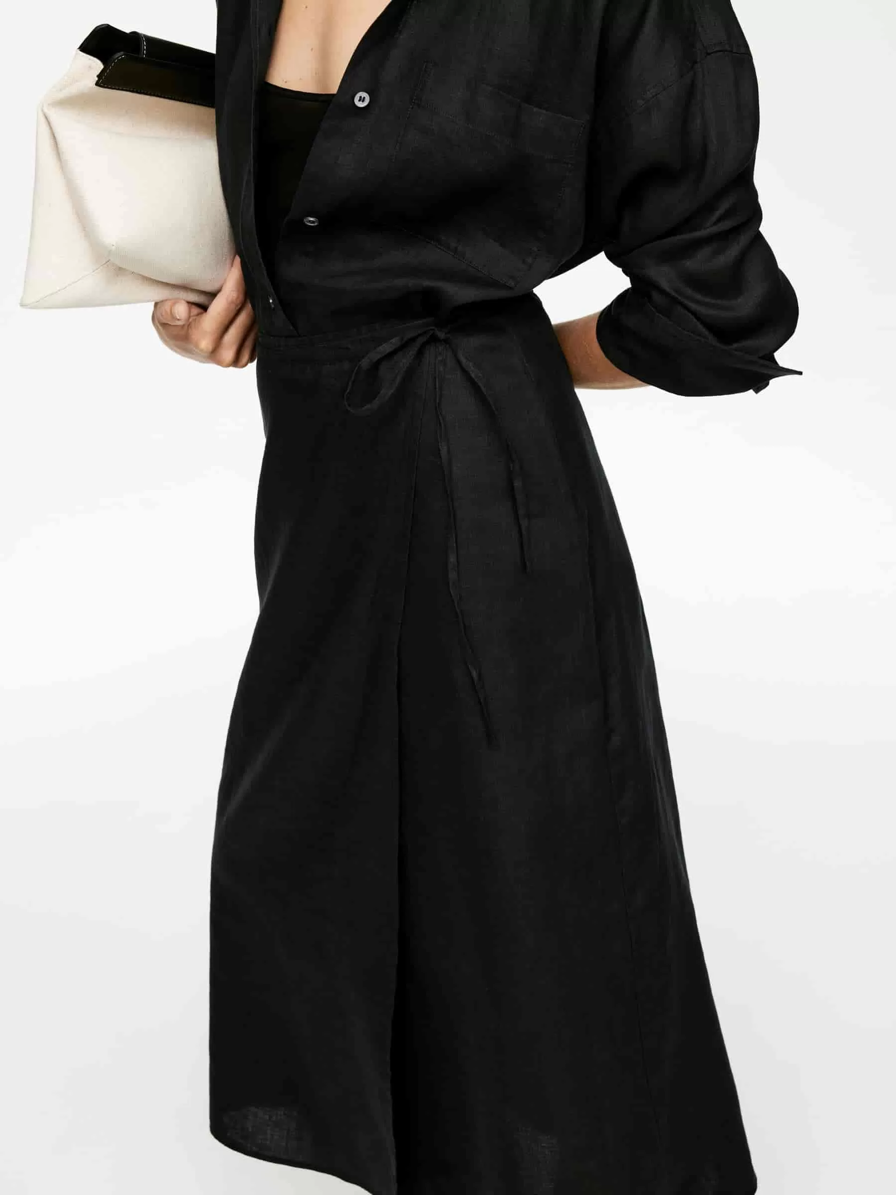 A midi wrap skirt sewn from pure linen. A straight-cut style with a mid-rise waist and tie straps. Unlined.