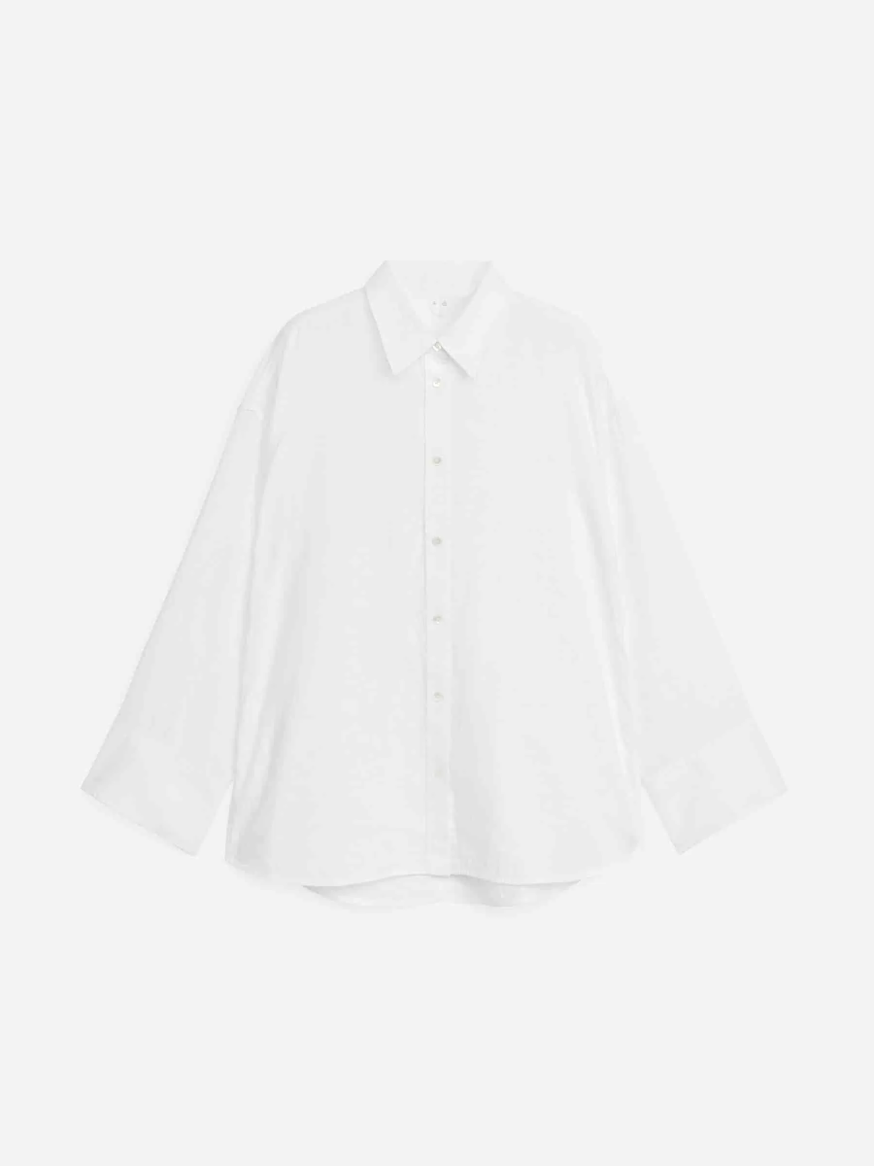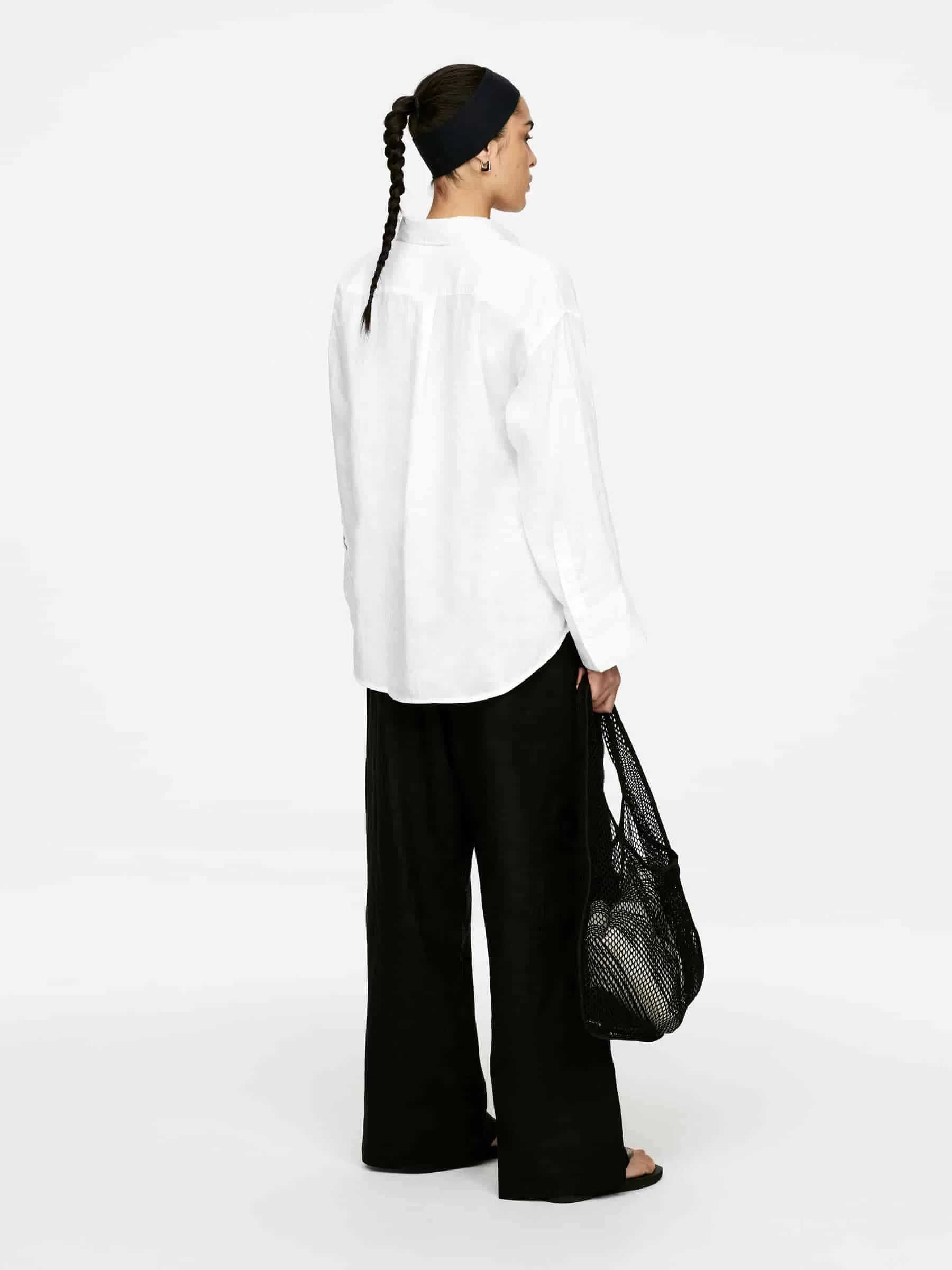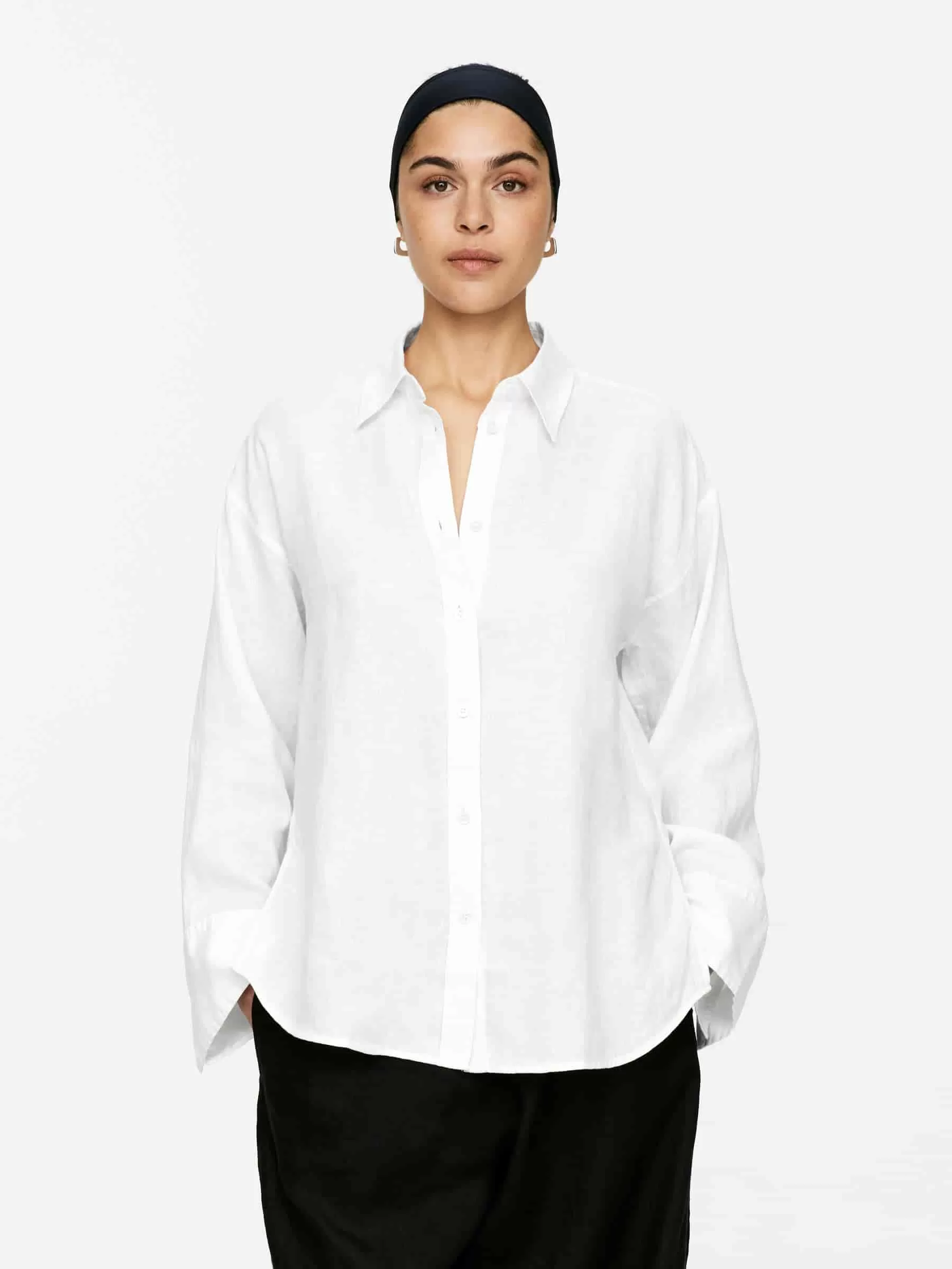 Loose shirt crafted from linen. A button-up style with loose-fit buttoned cuffs and pleat at back yoke.