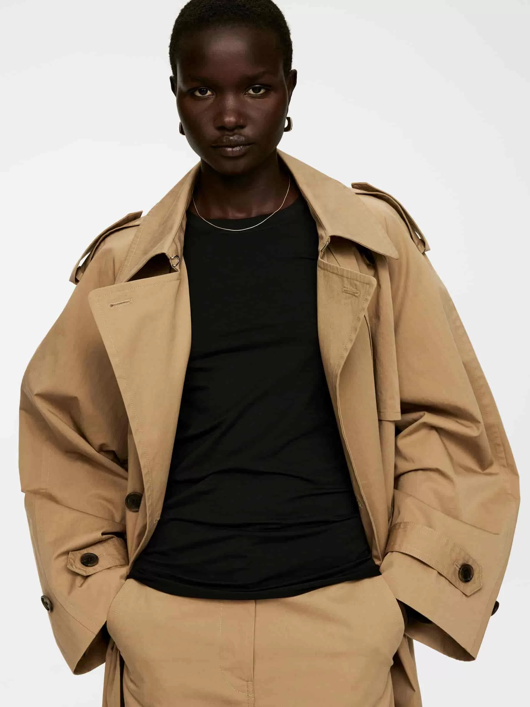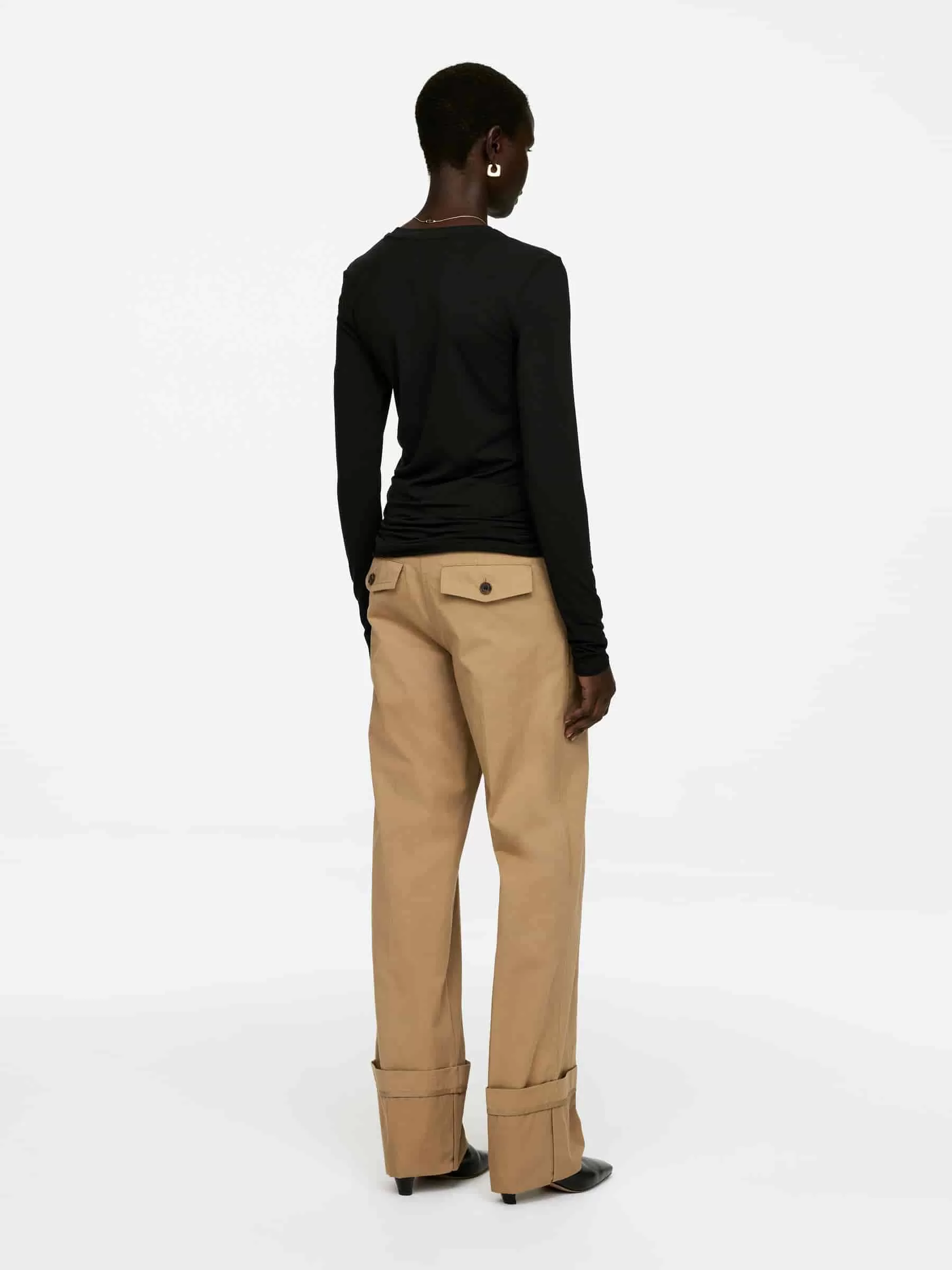 Long-sleeved top with a soft and stretchy feel. A round-neck style with raw edges at bottom hem and at end of sleeves.