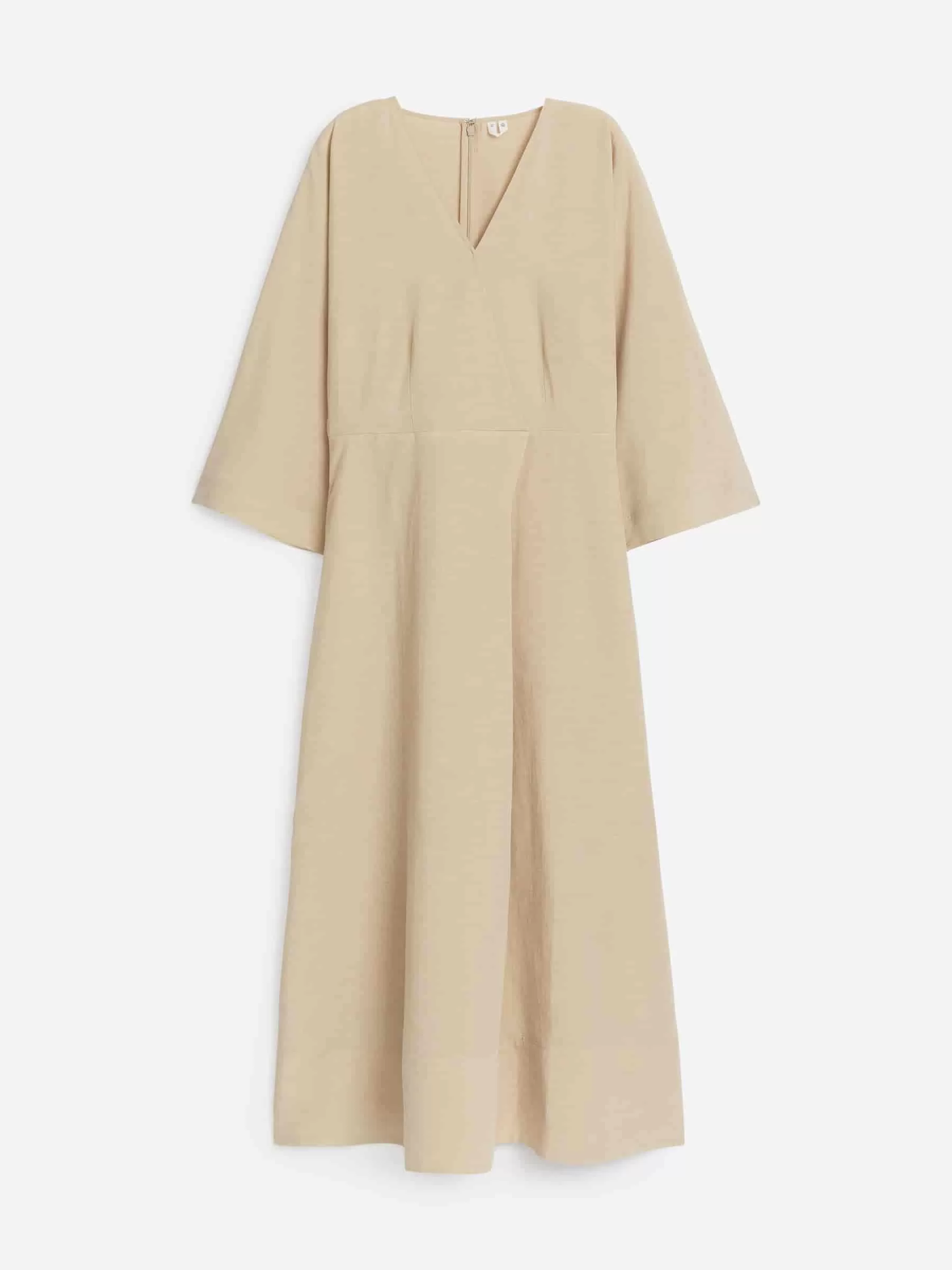 Mid-length dress crafted from a blend of lyocell and linen. Designed with a fit-and-flare silhouette, kimono-shaped sleeves and a fixed wrap detail at front. Hidden zip at centre back. Skirt with slites on both sides. Regular fit.