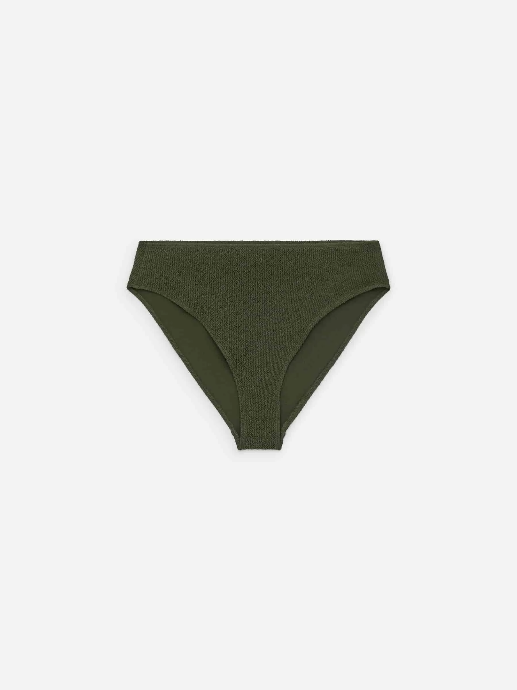 Bikini bottom featuring a stretchy, crinkled surface, cut for a mid-waist fit.