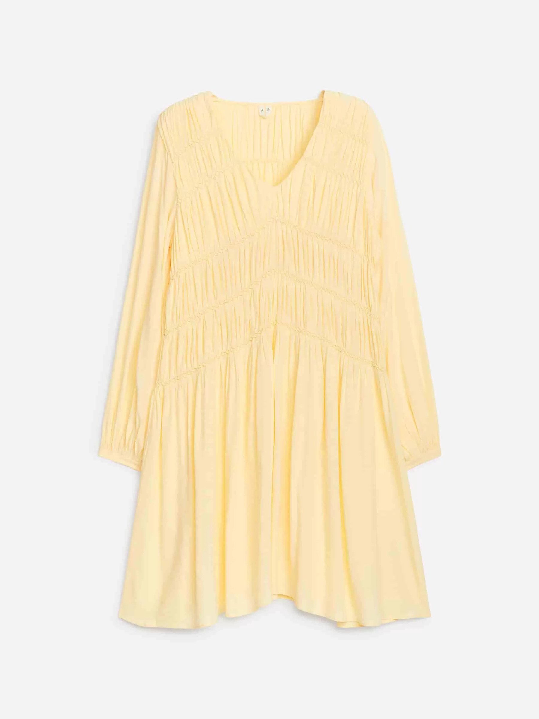 Midi dress made from a fluid viscose fabric. Features a V-neckline, balloon-shaped sleeves and smock details with elastic seams across the body. Pin hem at bottom edge.
