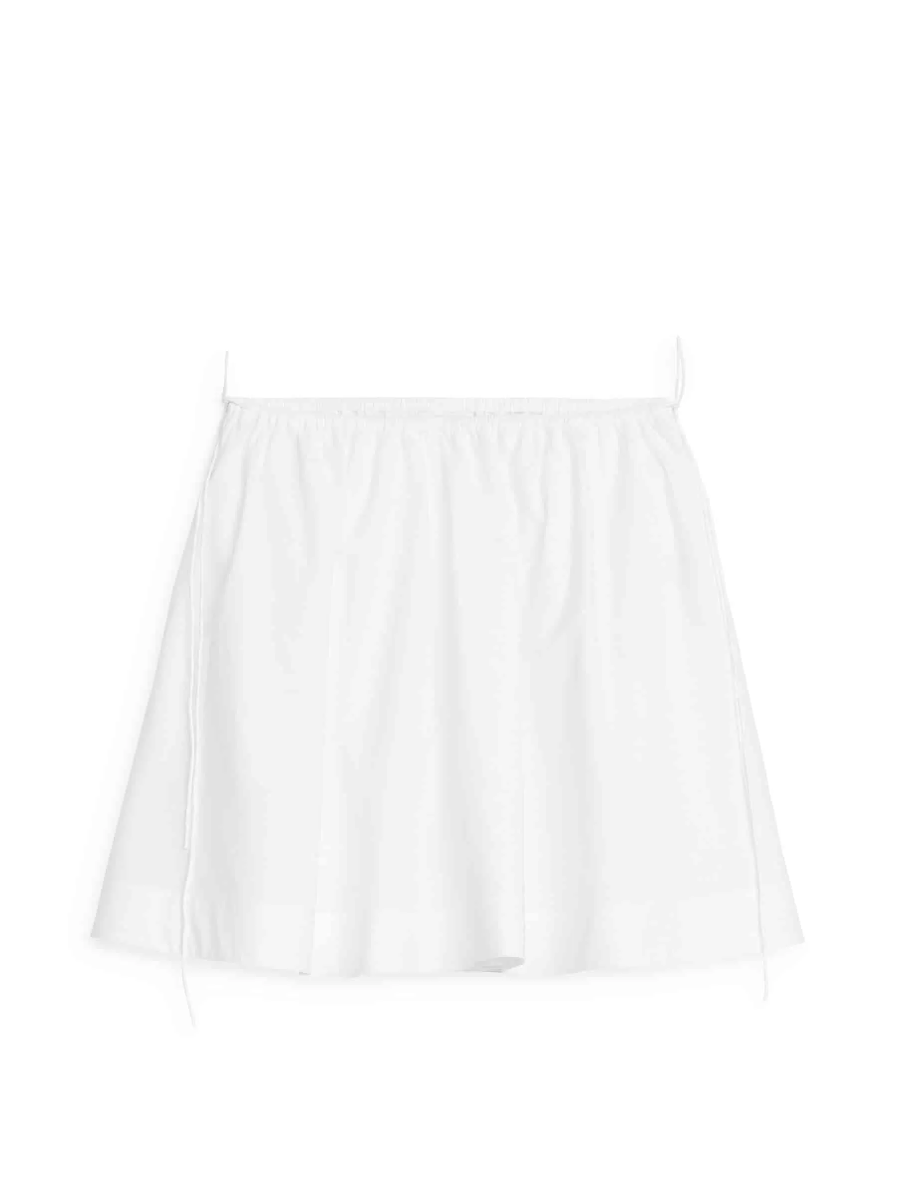 Short A-line skirt with side seam pockets. Styled with soft elastics at waist and fixed rouleau straps at the sides. Fully lined.