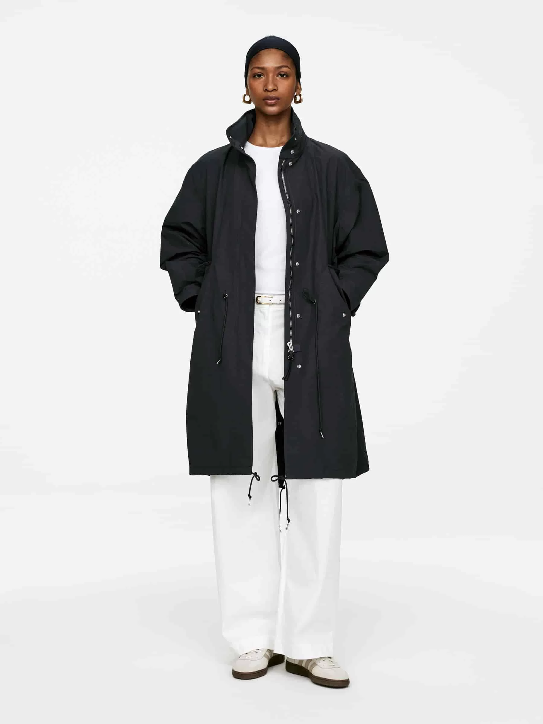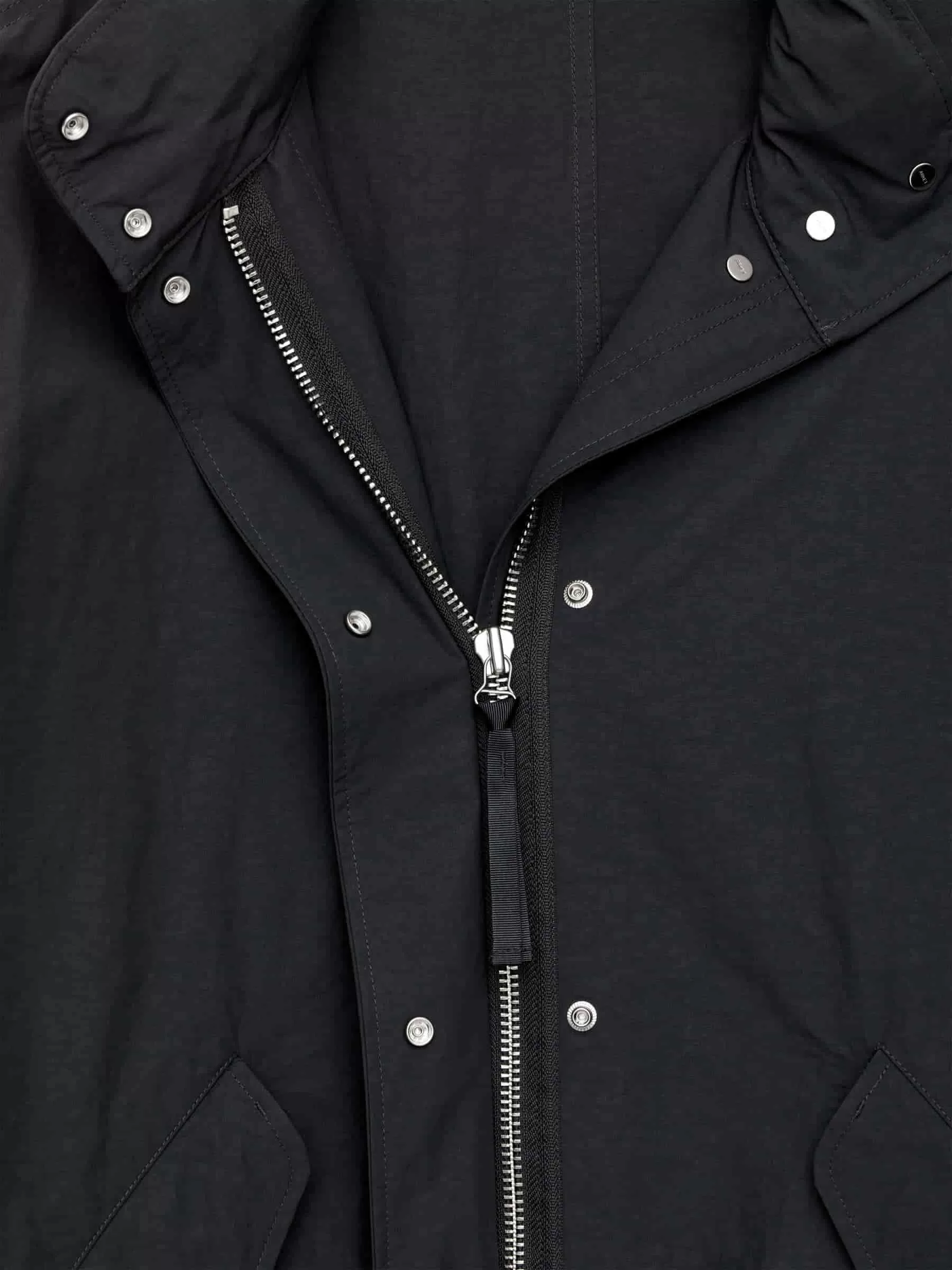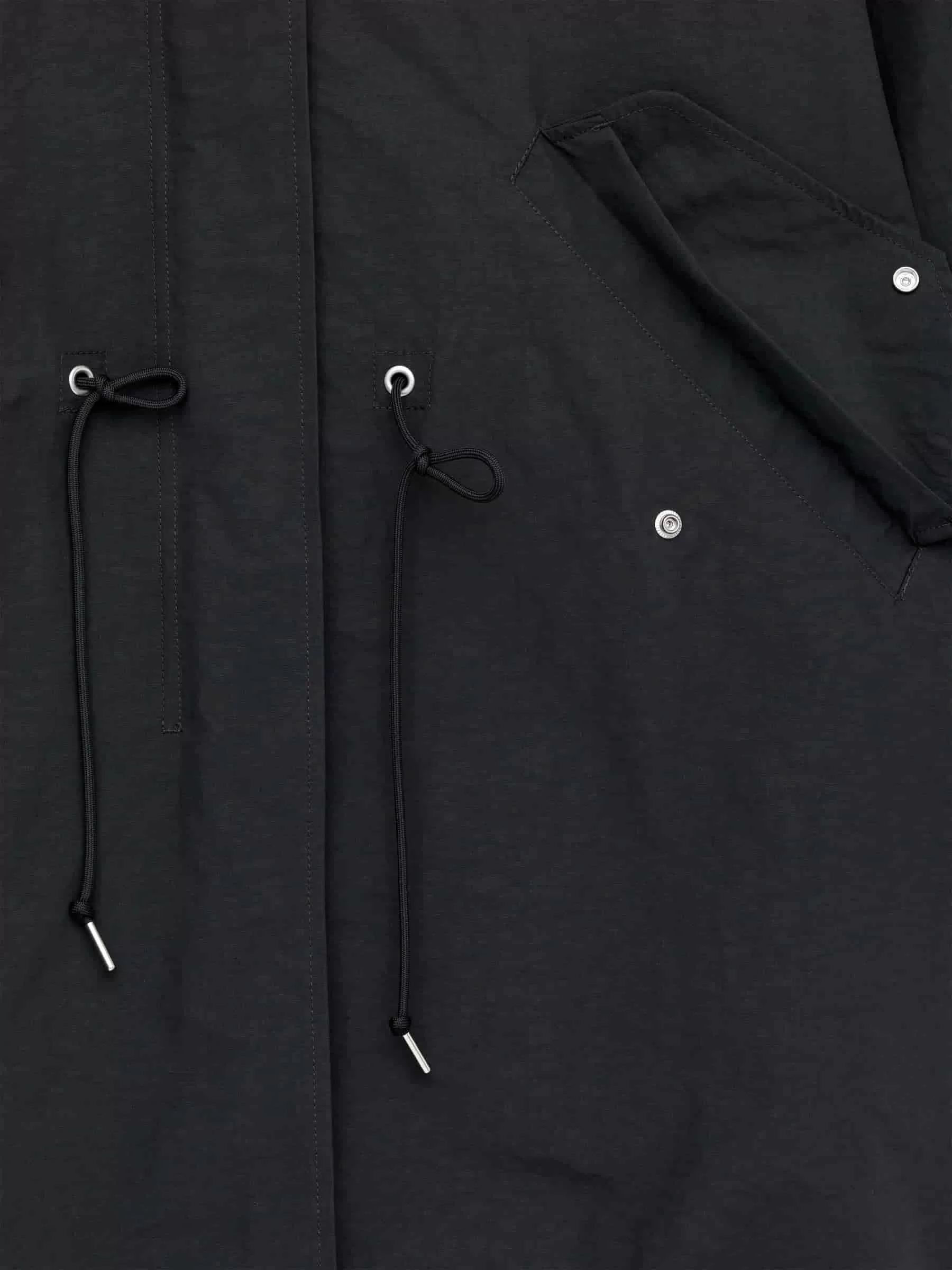 Unlined fishtail parka with a high collar where the hood is tucked away. Front placket with zip an hidden snap buttons. Slanted pockets with hidden snap buttons. Drawstring at waist and bottom hem.