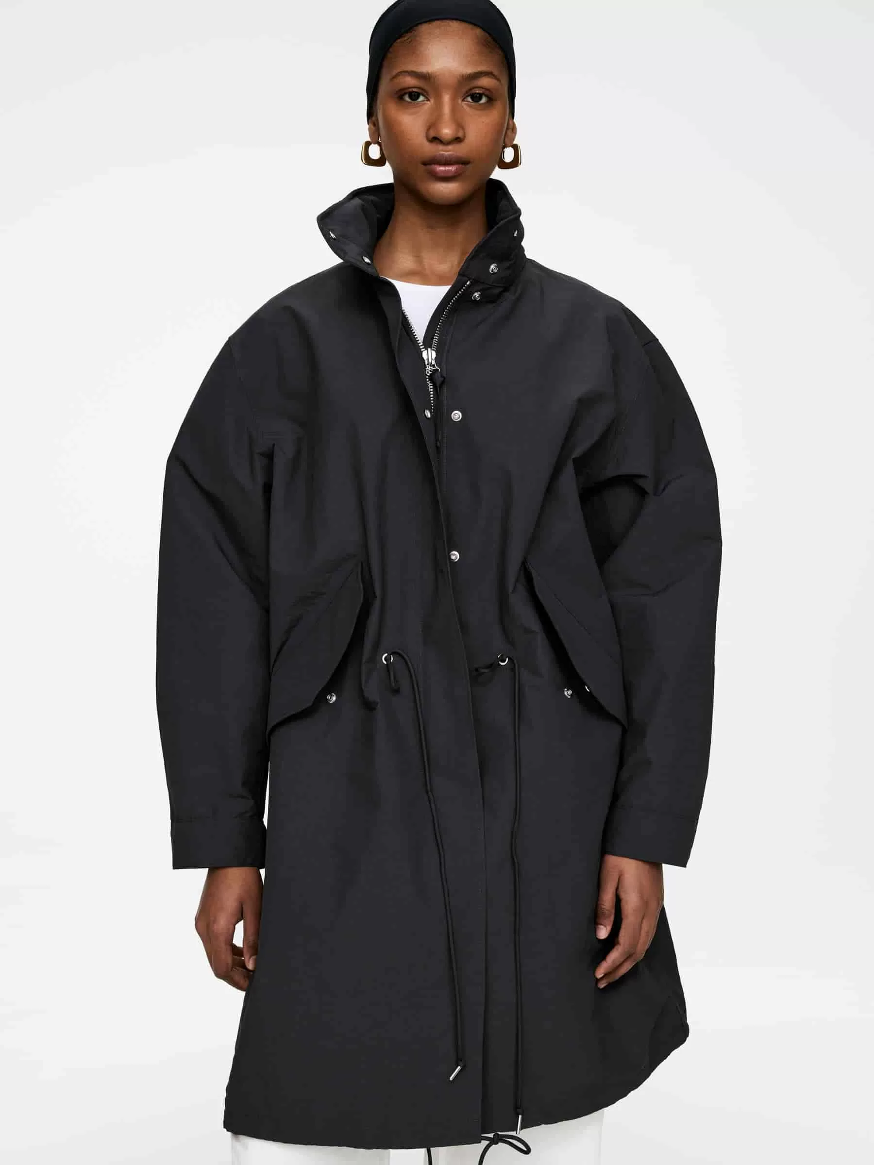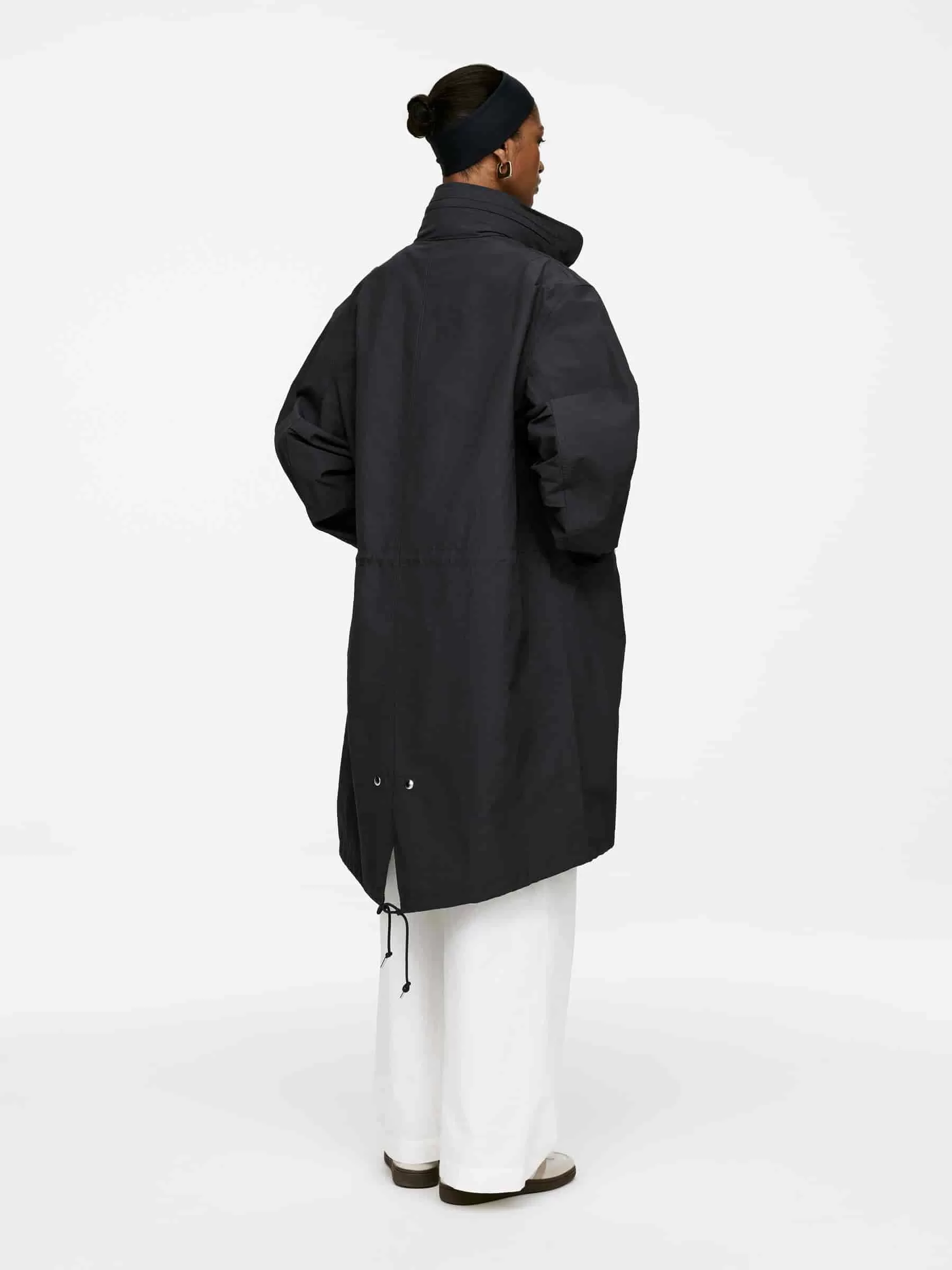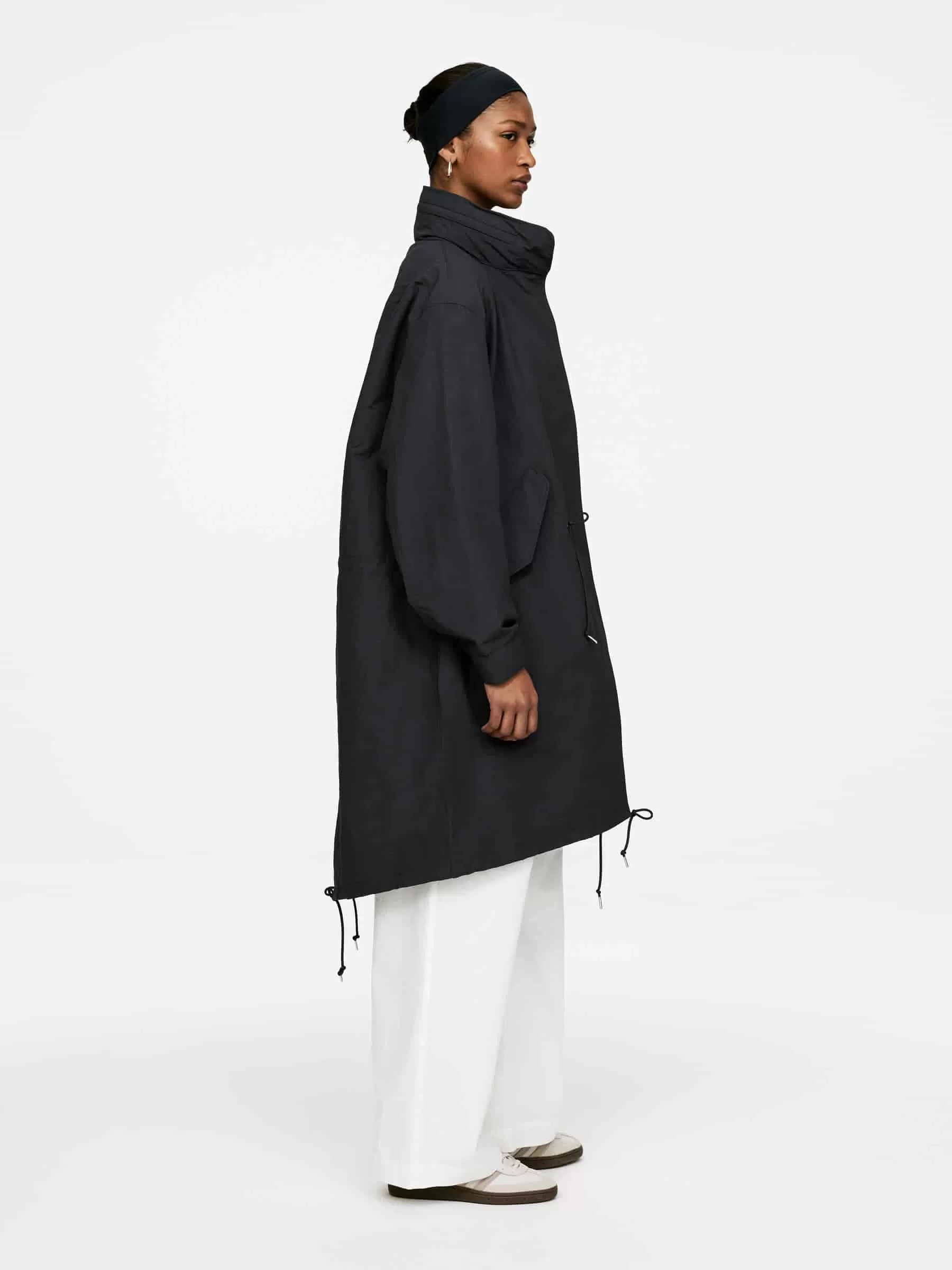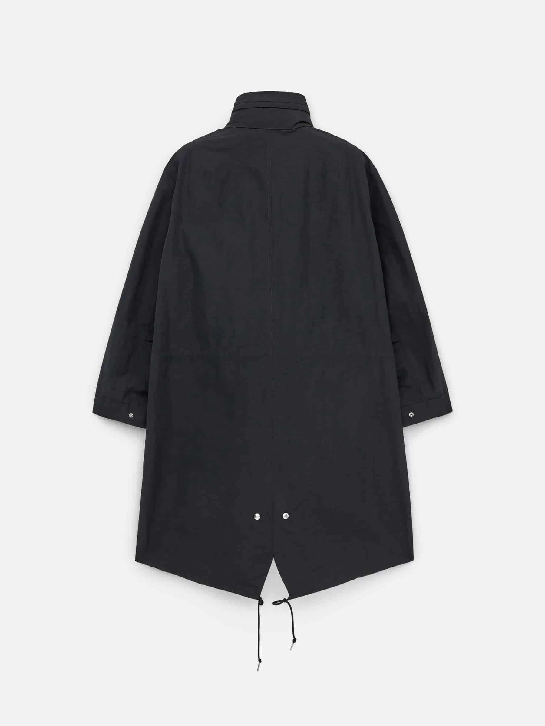 Unlined fishtail parka with a high collar where the hood is tucked away. Front placket with zip an hidden snap buttons. Slanted pockets with hidden snap buttons. Drawstring at waist and bottom hem.