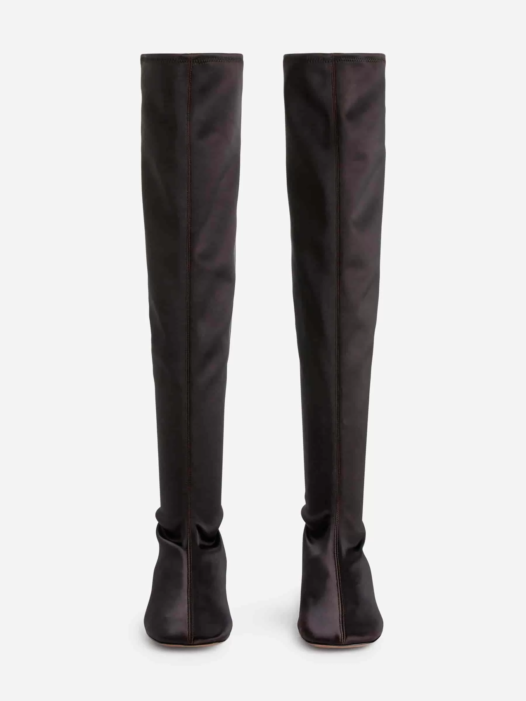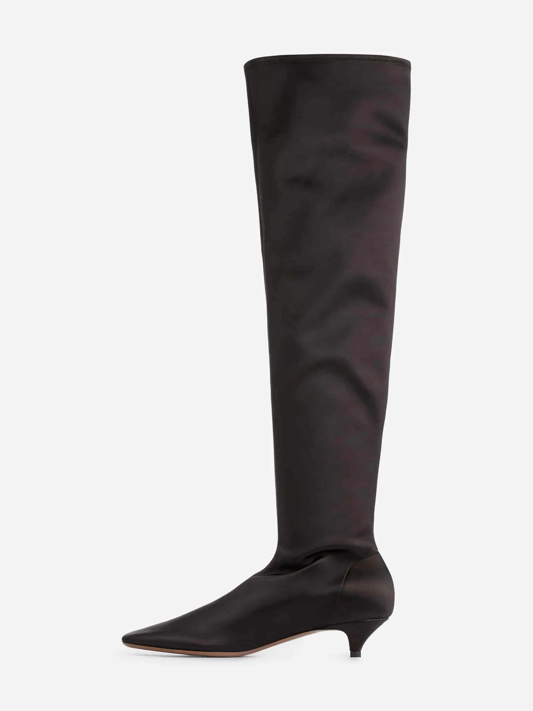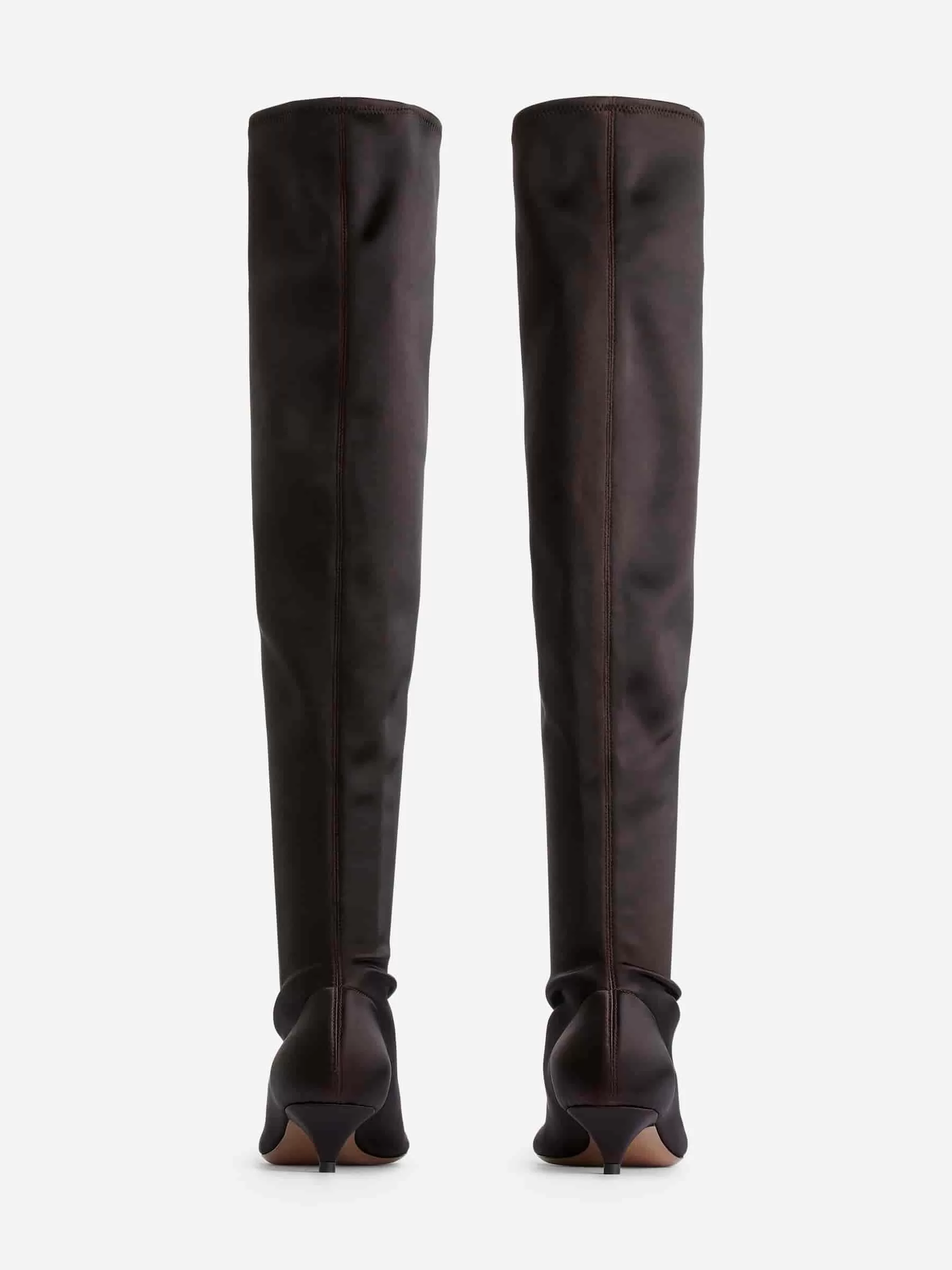 Over-the-knee satin stretch boots. A snug-fitting style featuring a squared toe with rounded corners, a middle seam at front and back and a comfortable kitten heel. Heel height 4 cm.
