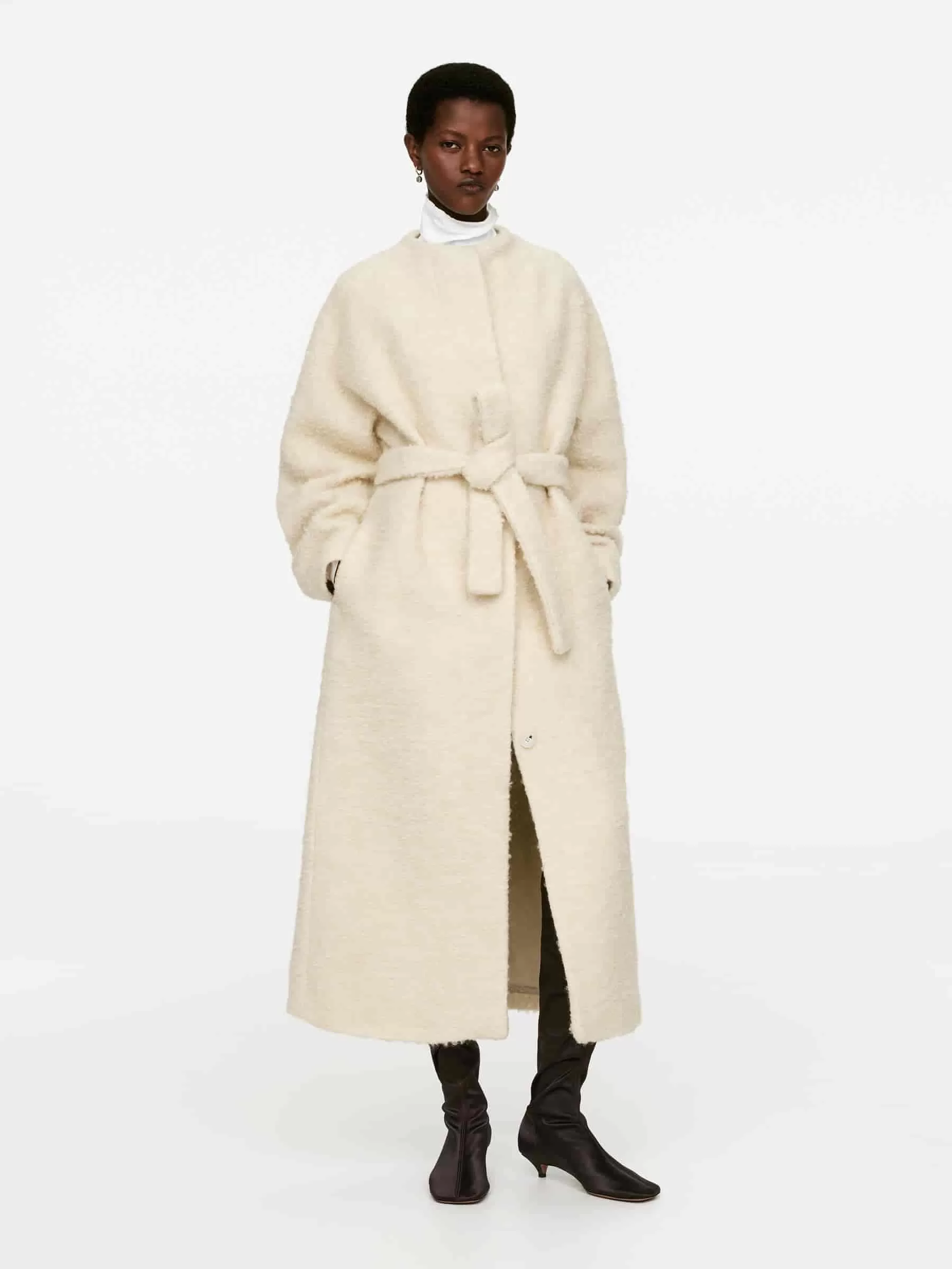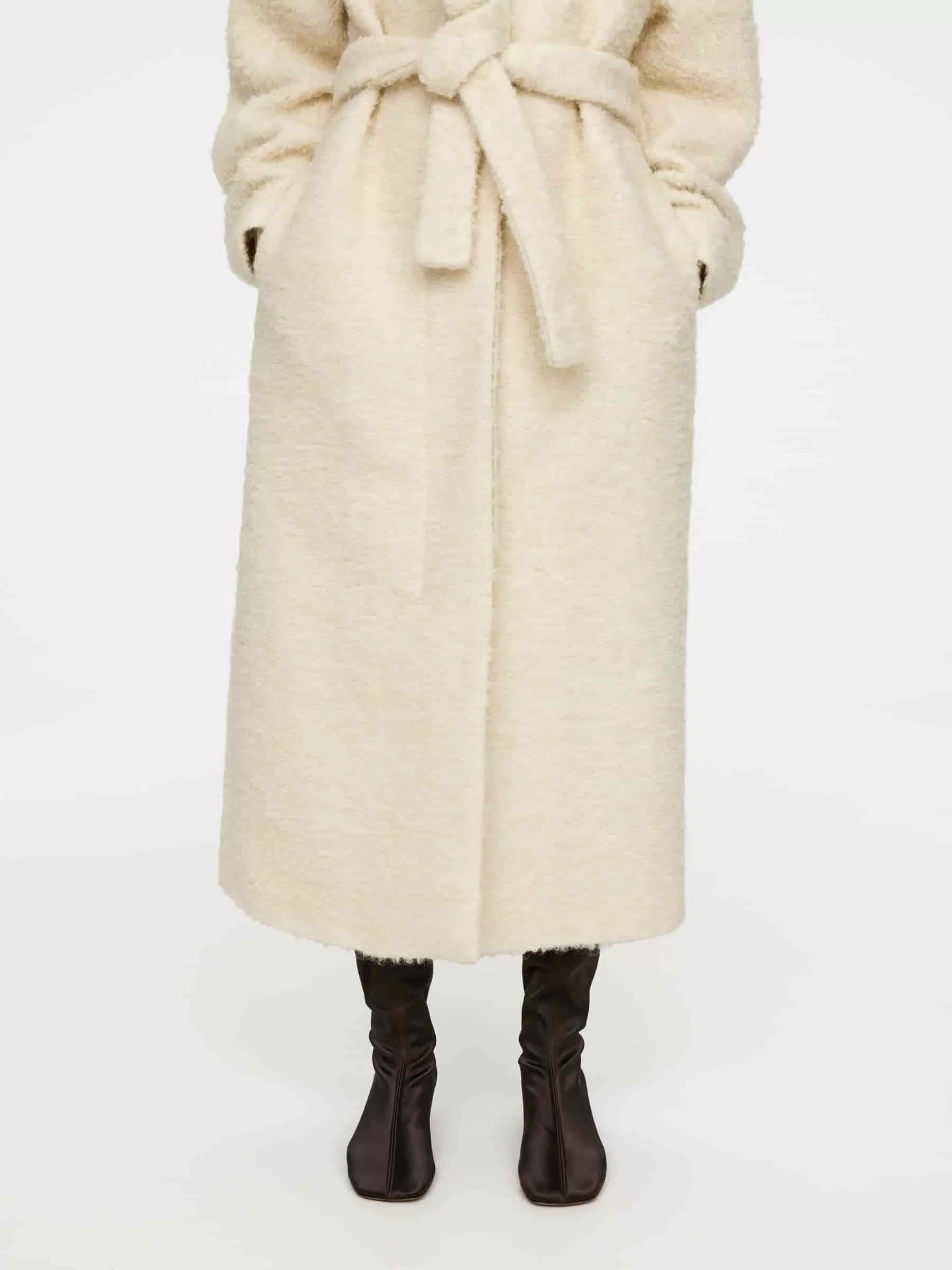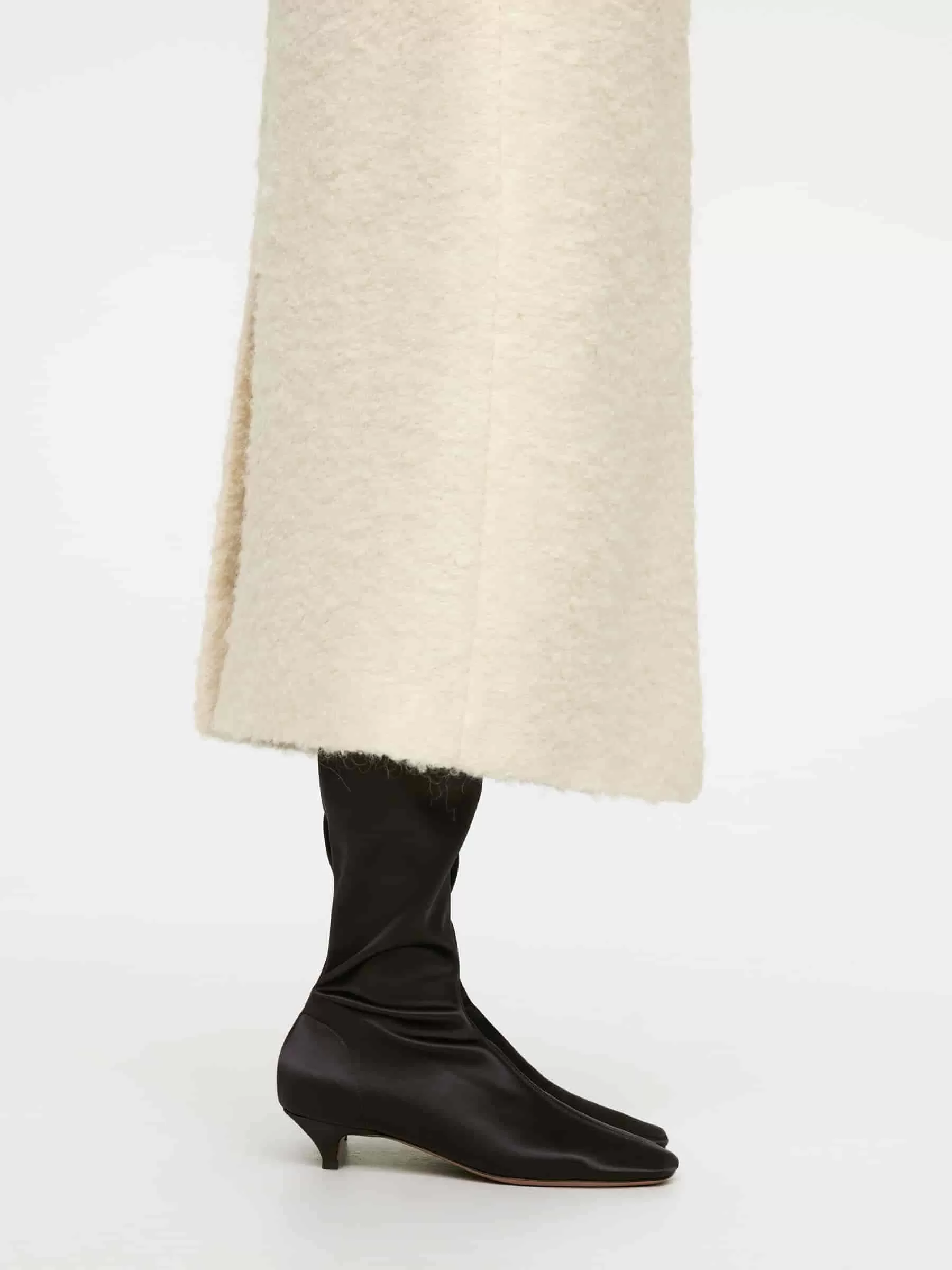 Over-the-knee satin stretch boots. A snug-fitting style featuring a squared toe with rounded corners, a middle seam at front and back and a comfortable kitten heel. Heel height 4 cm.