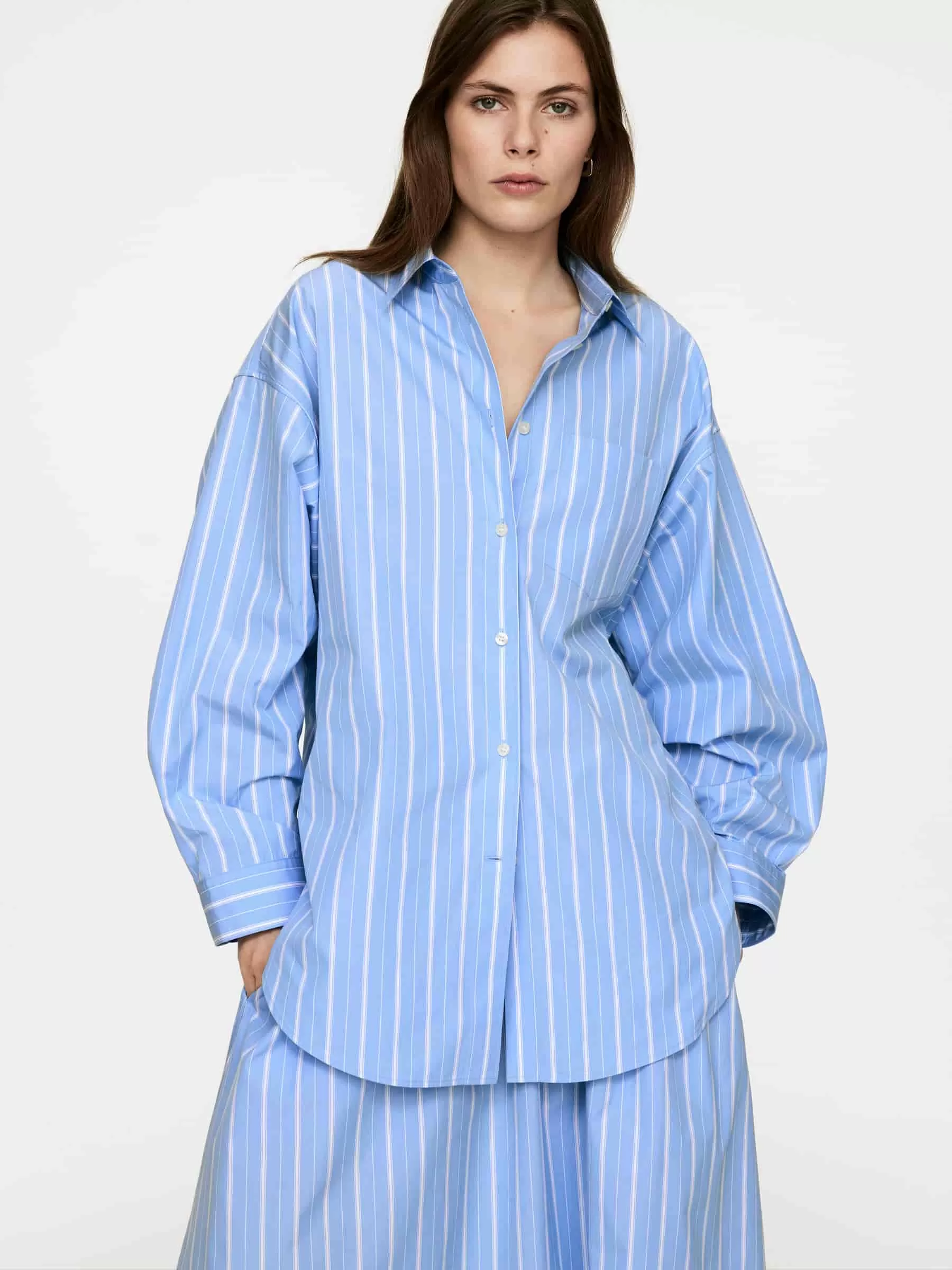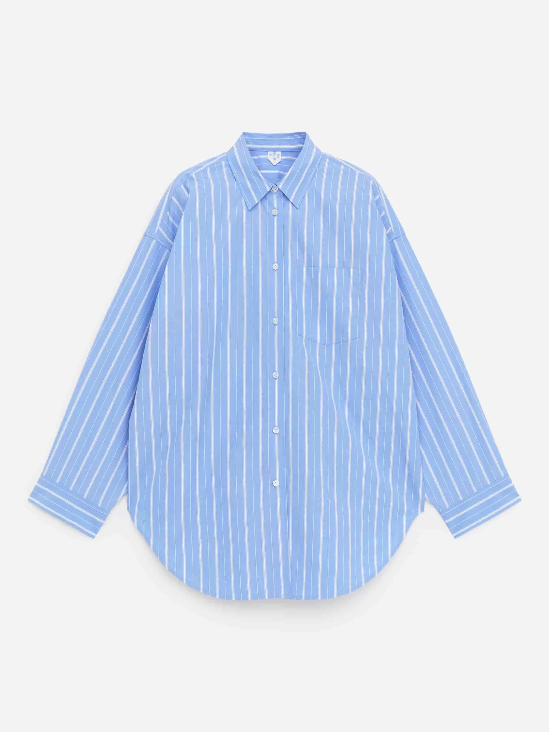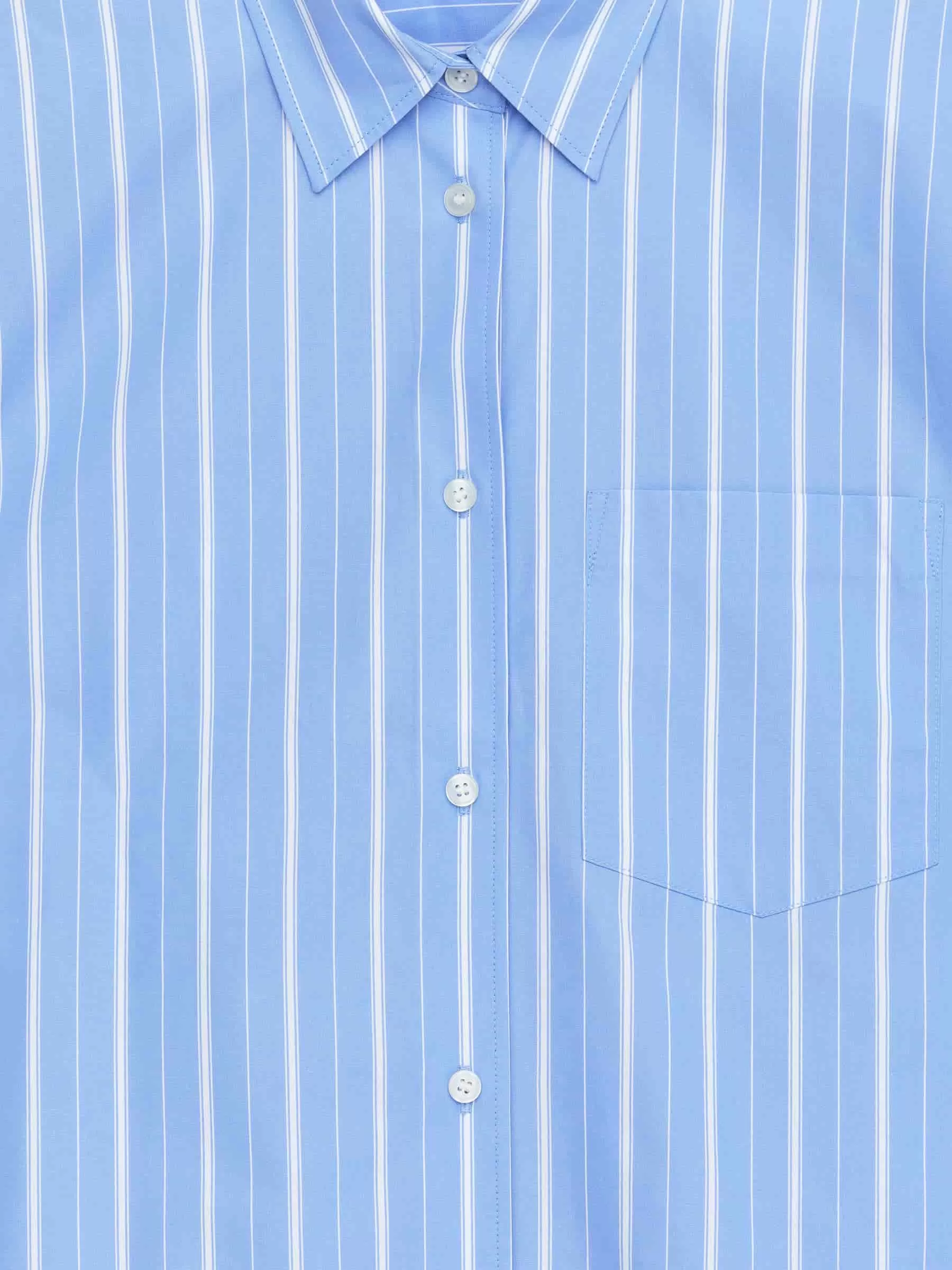 Oversized cotton shirt styled with wide batwing sleeves. The back panel is slightly longer than the front. Styled with a pointed collar, front buttoning, a single chest pocket and buttoned cuffs. A hang loop at the back.