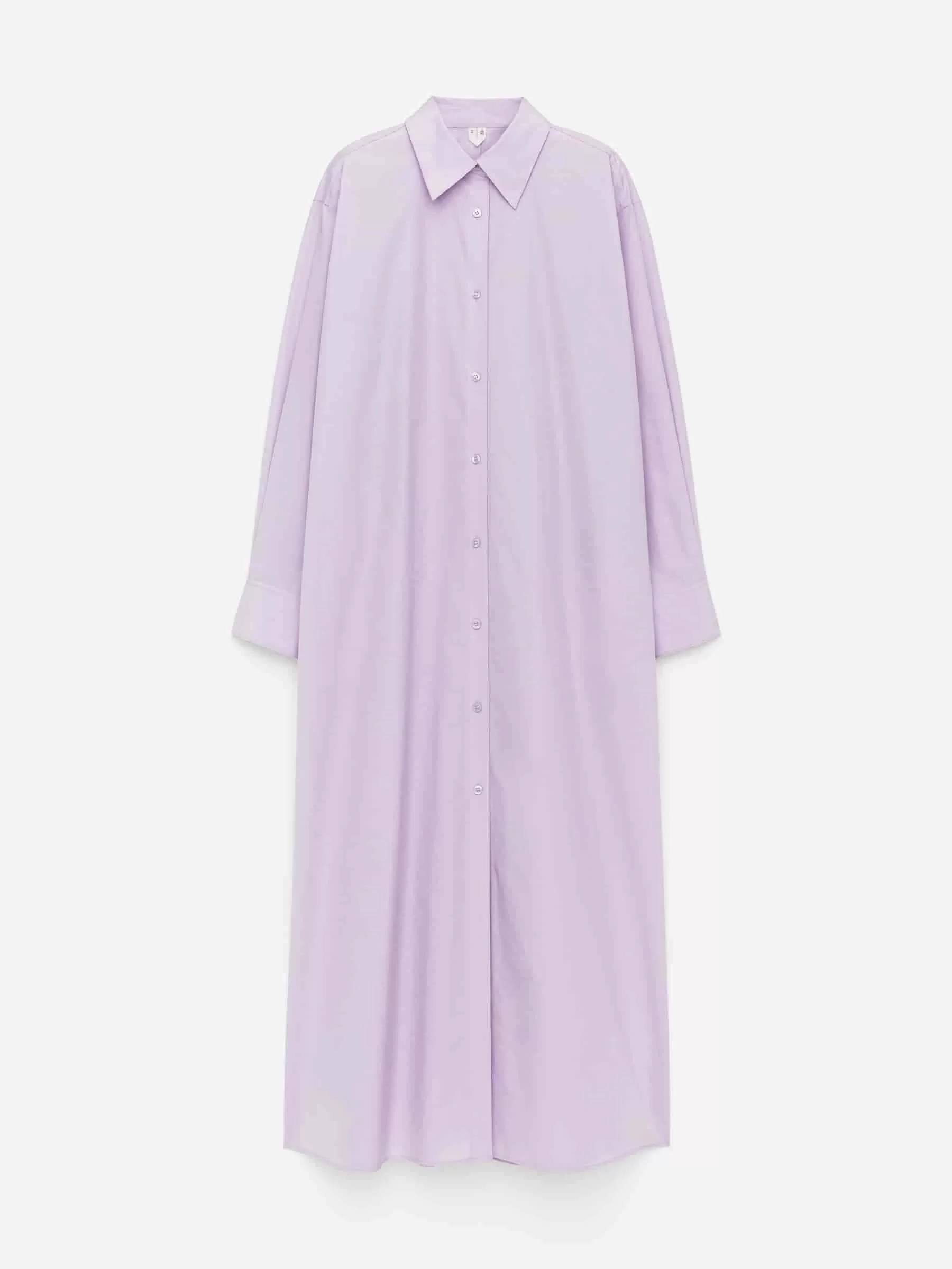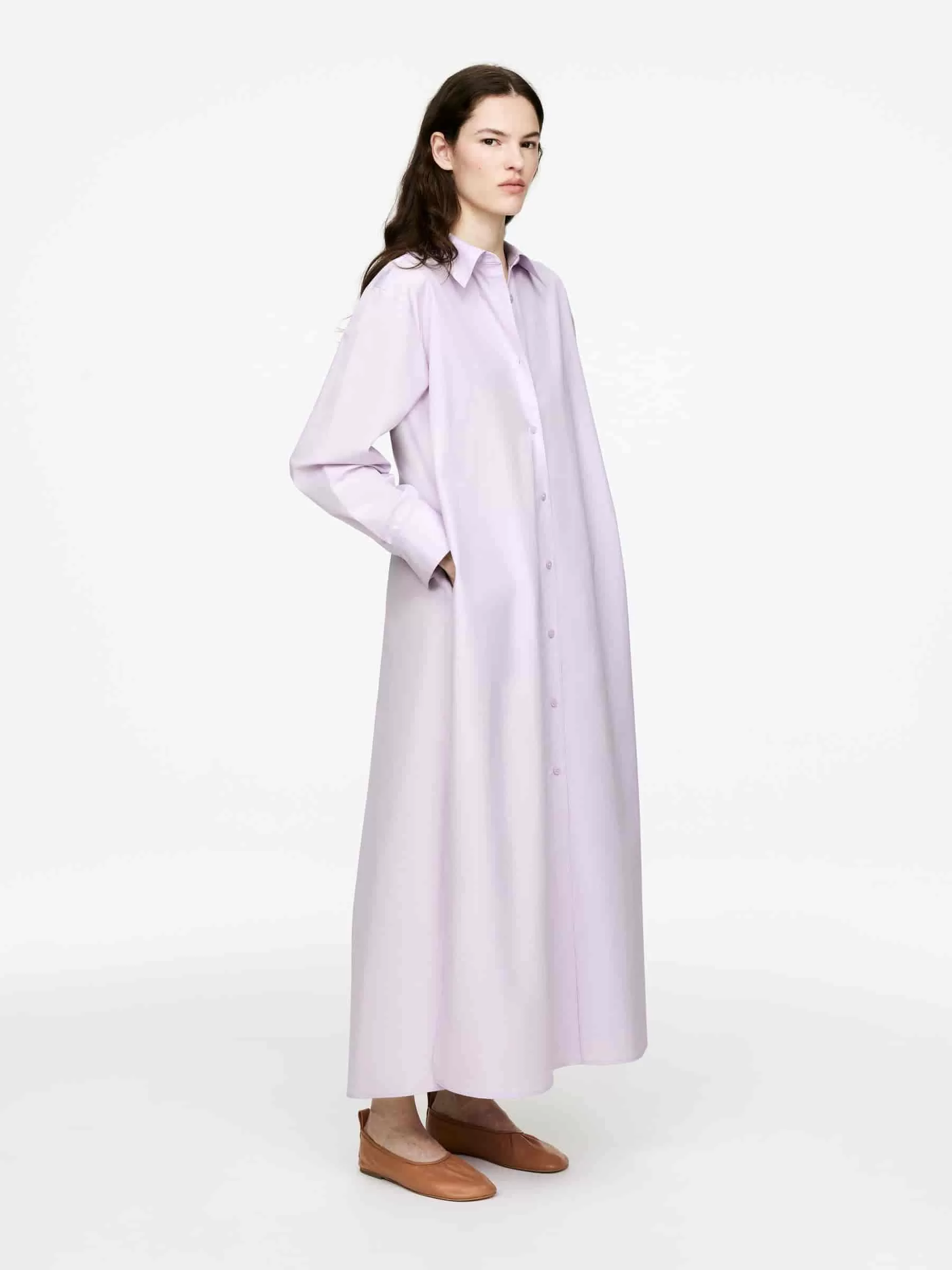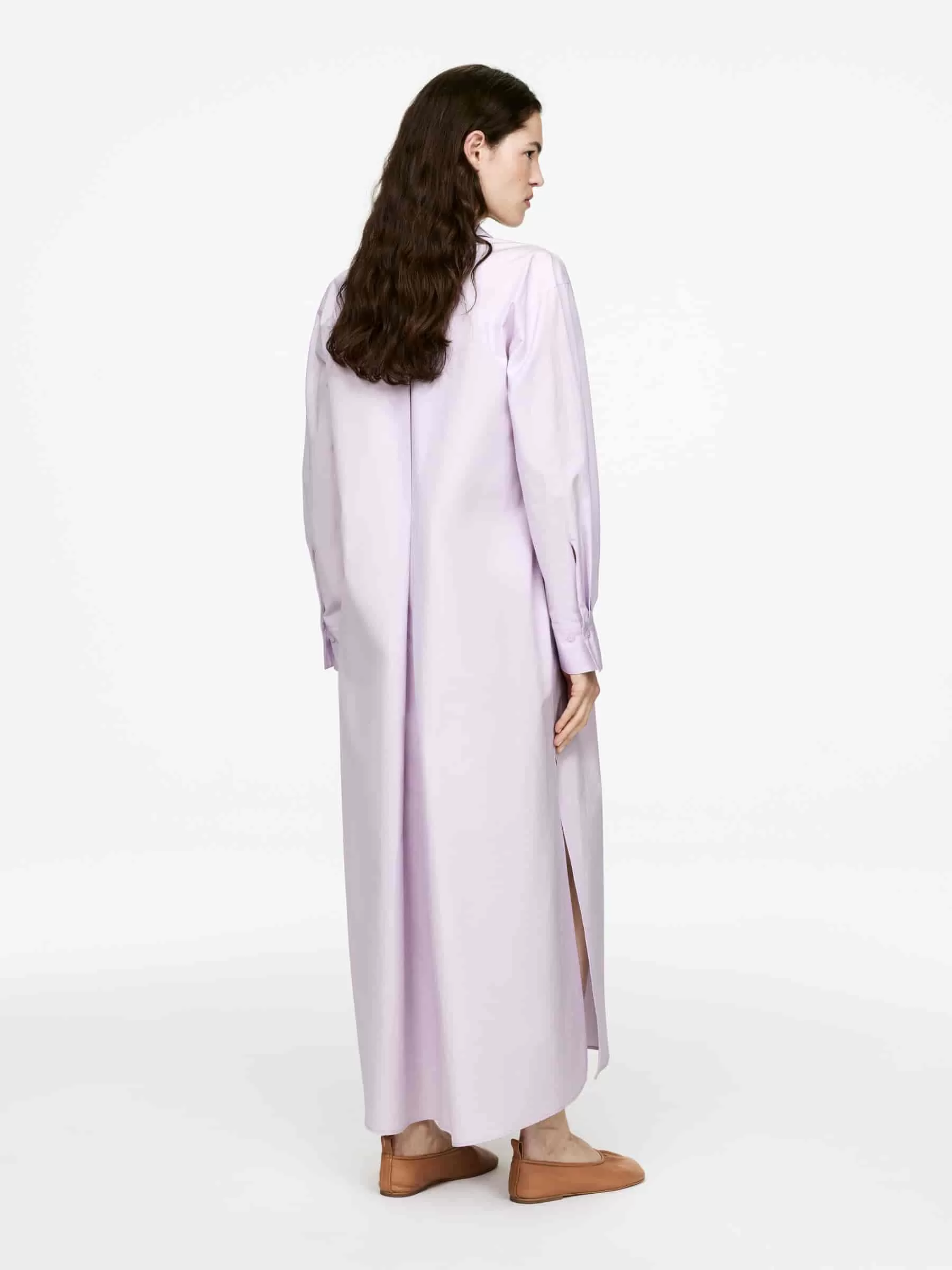 Full-length shirt dress with an oversized fit. This is a button-up style with shirt collar, side seam pockets and slits at the sides. Box pleat at centre back. Sleeves with dropped shoulder seams and buttoned cuffs.