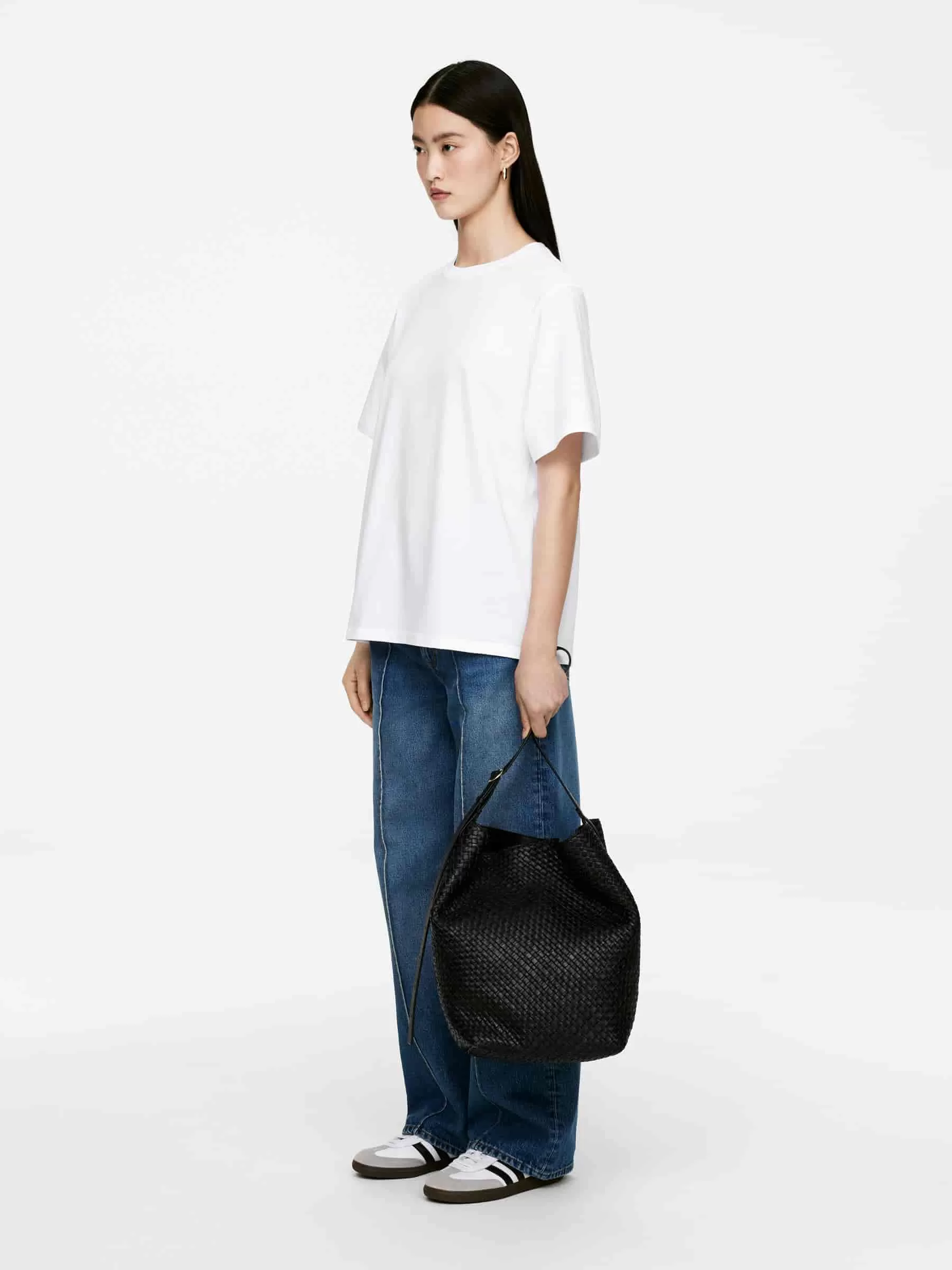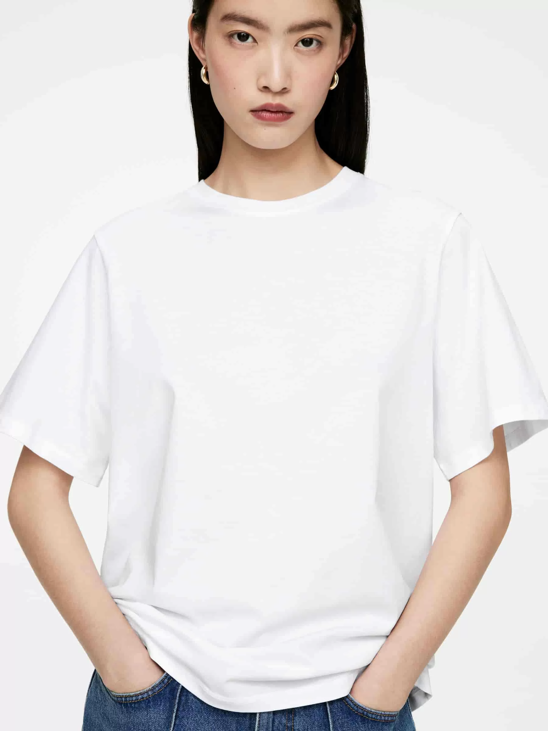 Oversized T-shirt crafted from a soft cotton jersey. Styled with a wider ribbed neck trim and wide sleeves.