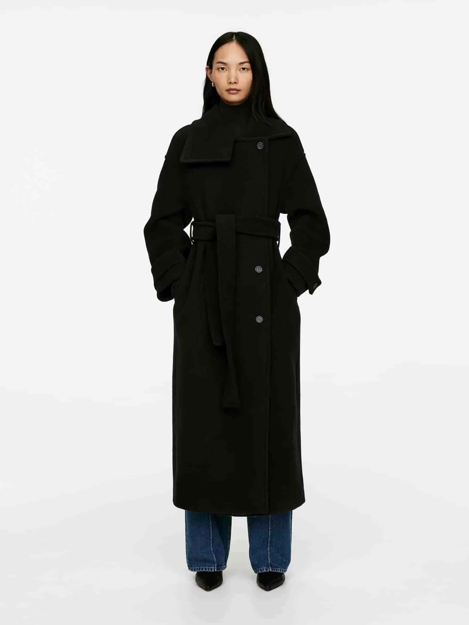 Belted maxi coat crafted from a wool blend. A fully lined, single breasted style with a collar that can be worn folded down or standing. Pockets at side seams sleeve and sleeve tabs with button closure. Oversized fit. The style contains 75% RWS wool (TE-00047206). Products certified to the Responsible Wool Standard (RWS) contain wool fiber from farms independently certified to animal welfare and land management requirements.