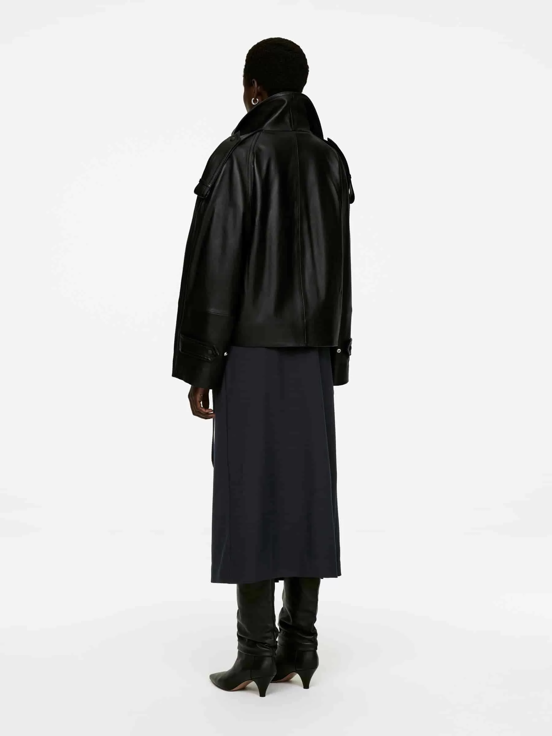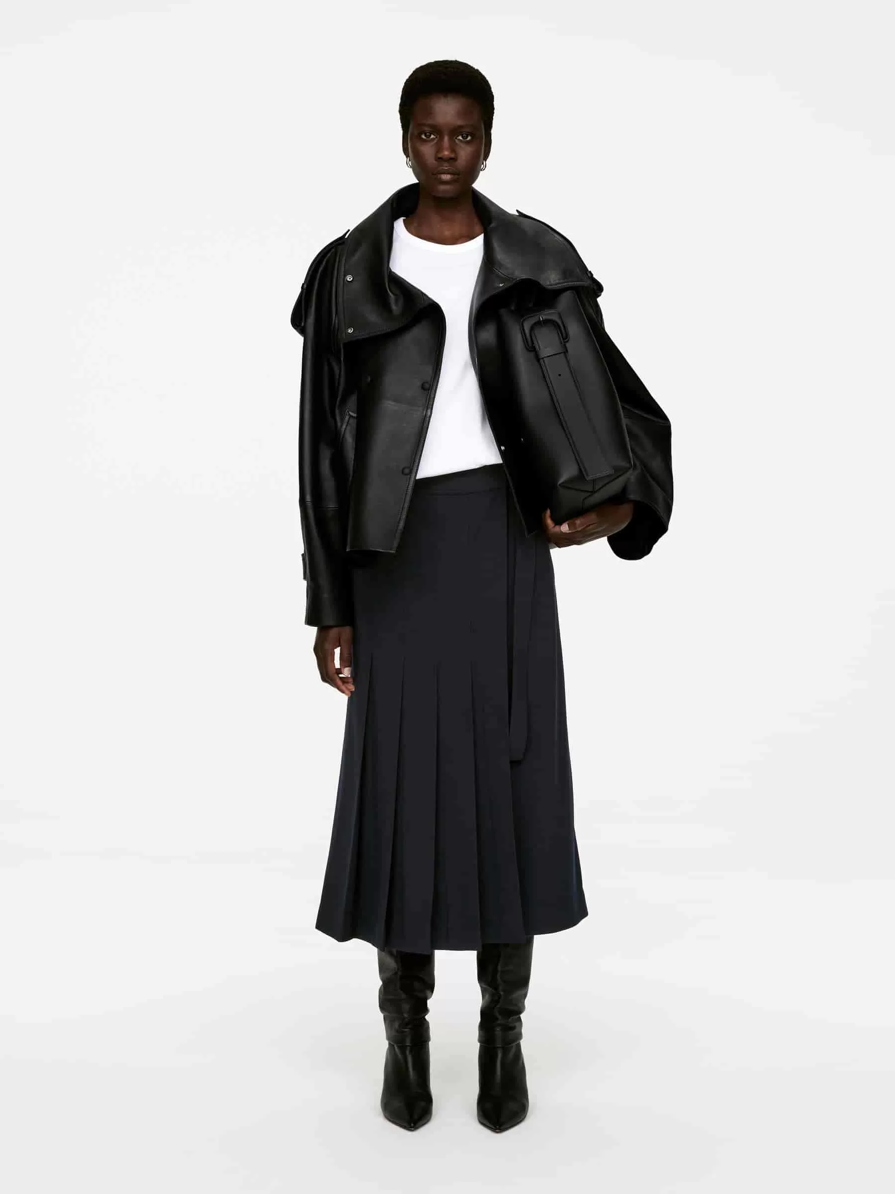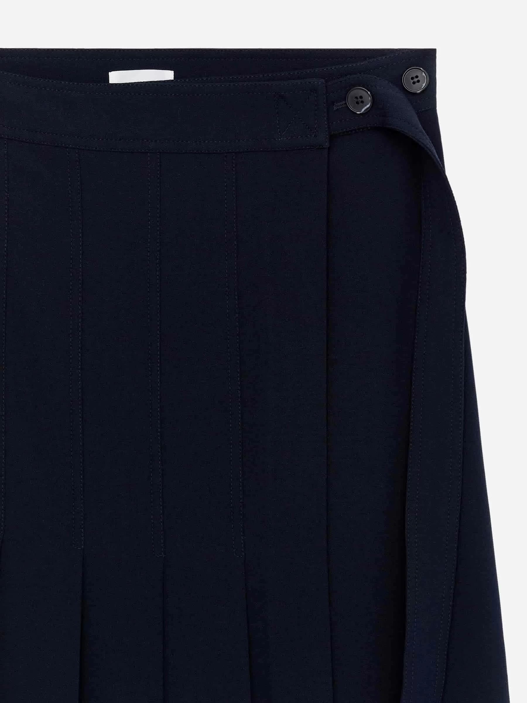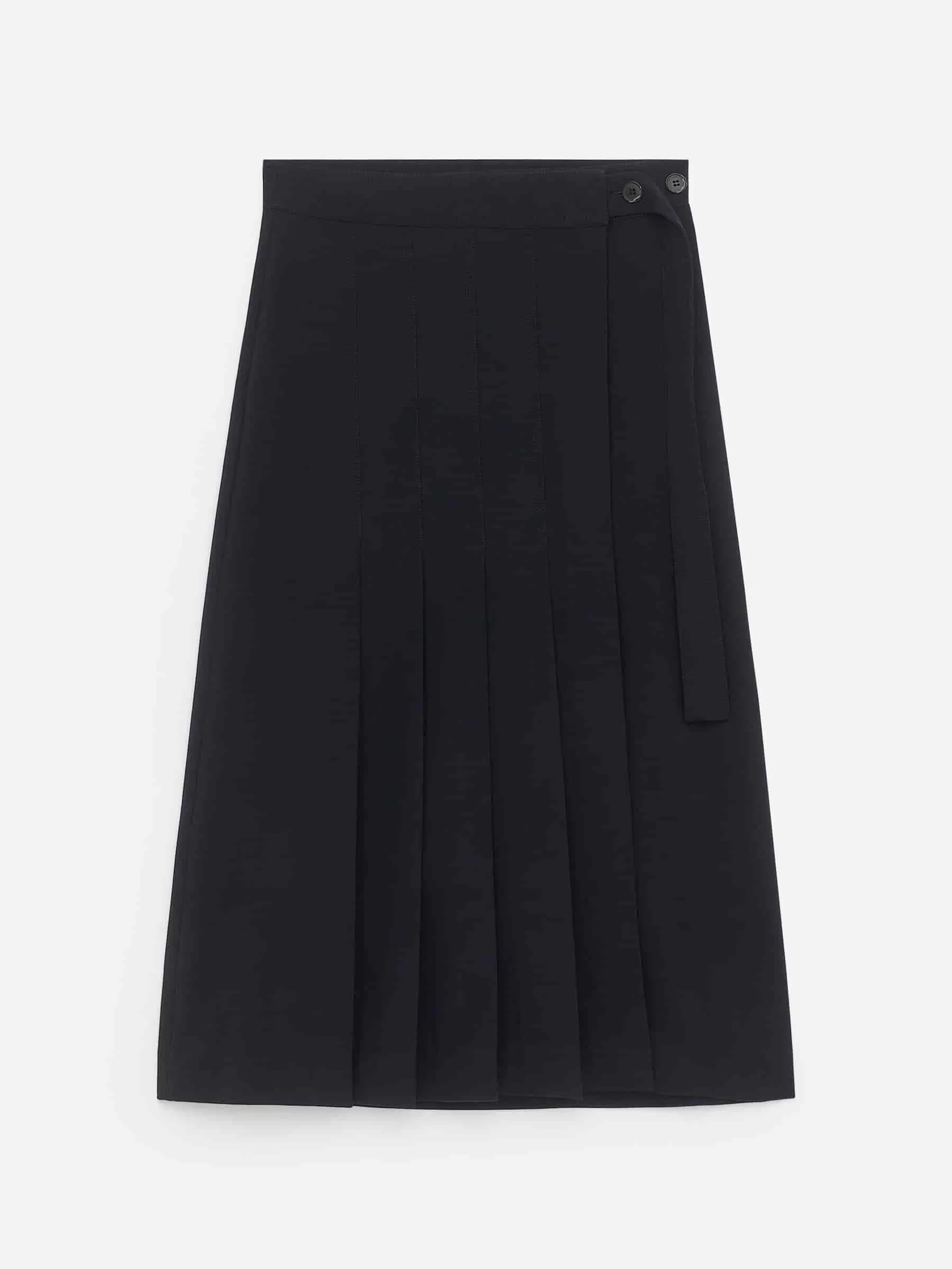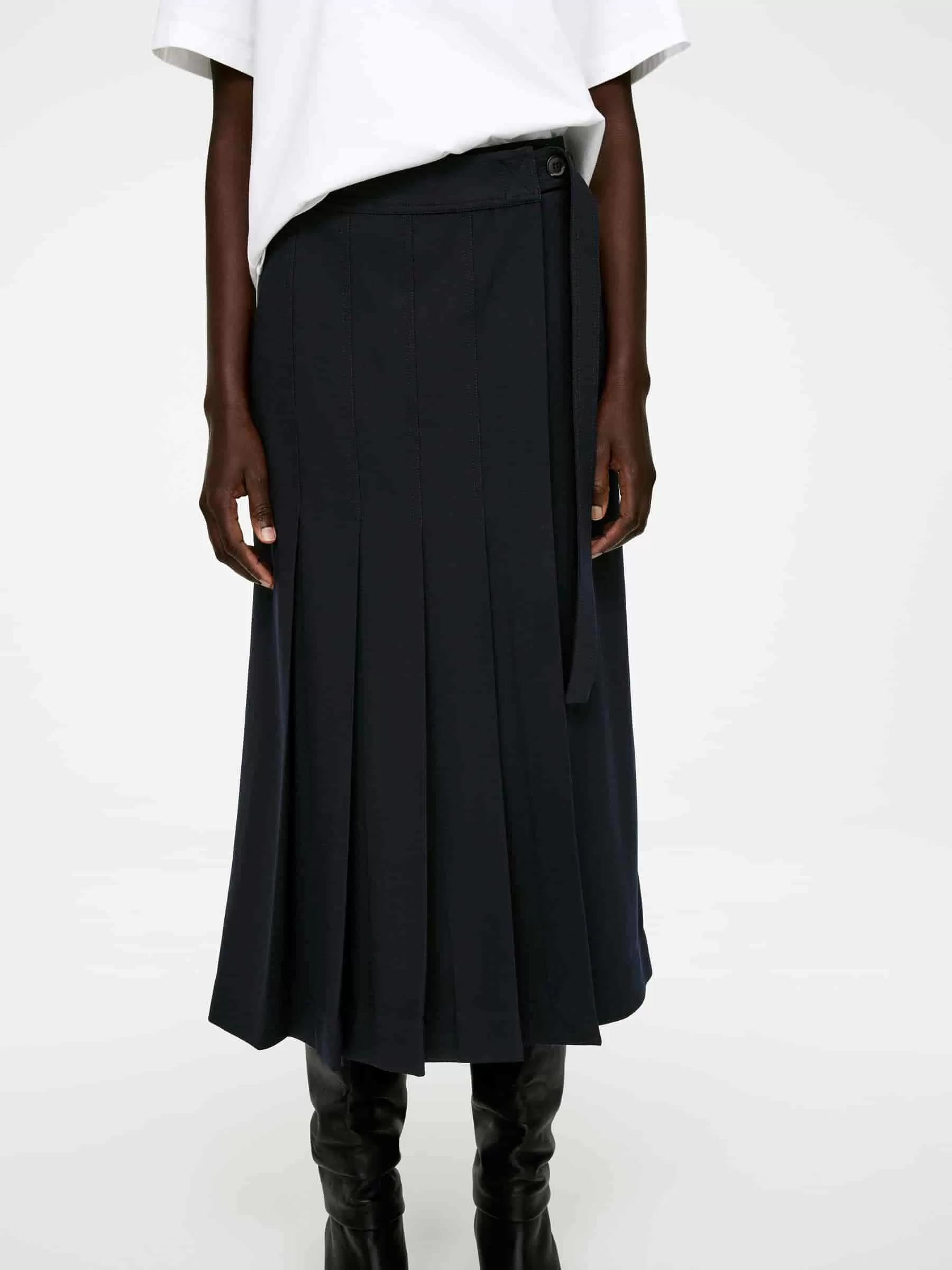 Mid-length skirt with pleated details and a wrap front. This is a straight-cut skirt with a belt detail at waist. The skirt contains 50% RWS wool (TE-00047206). Products certified to the Responsible Wool Standard (RWS) contain wool fiber from farms independently certified to animal welfare and land management requirements.