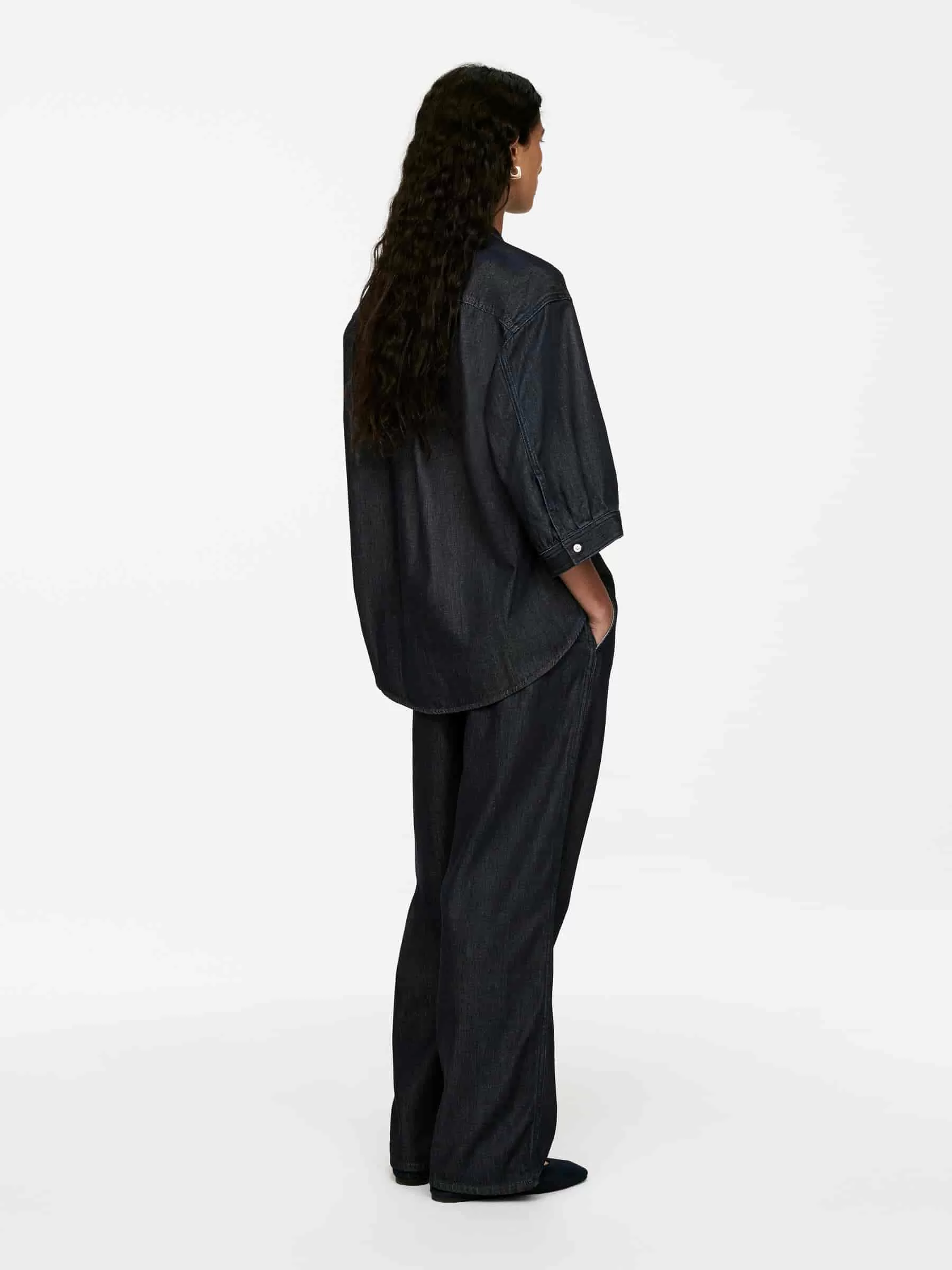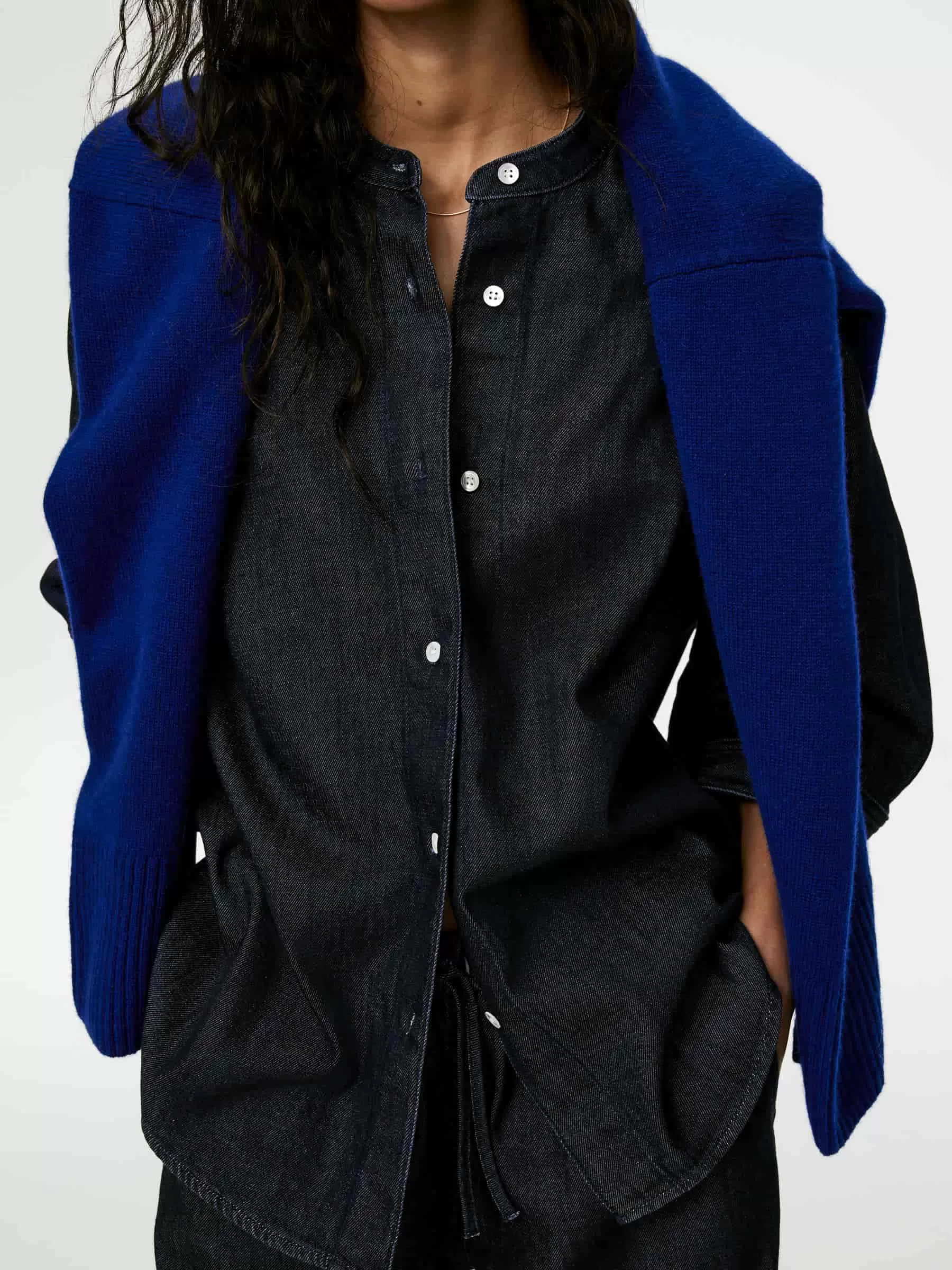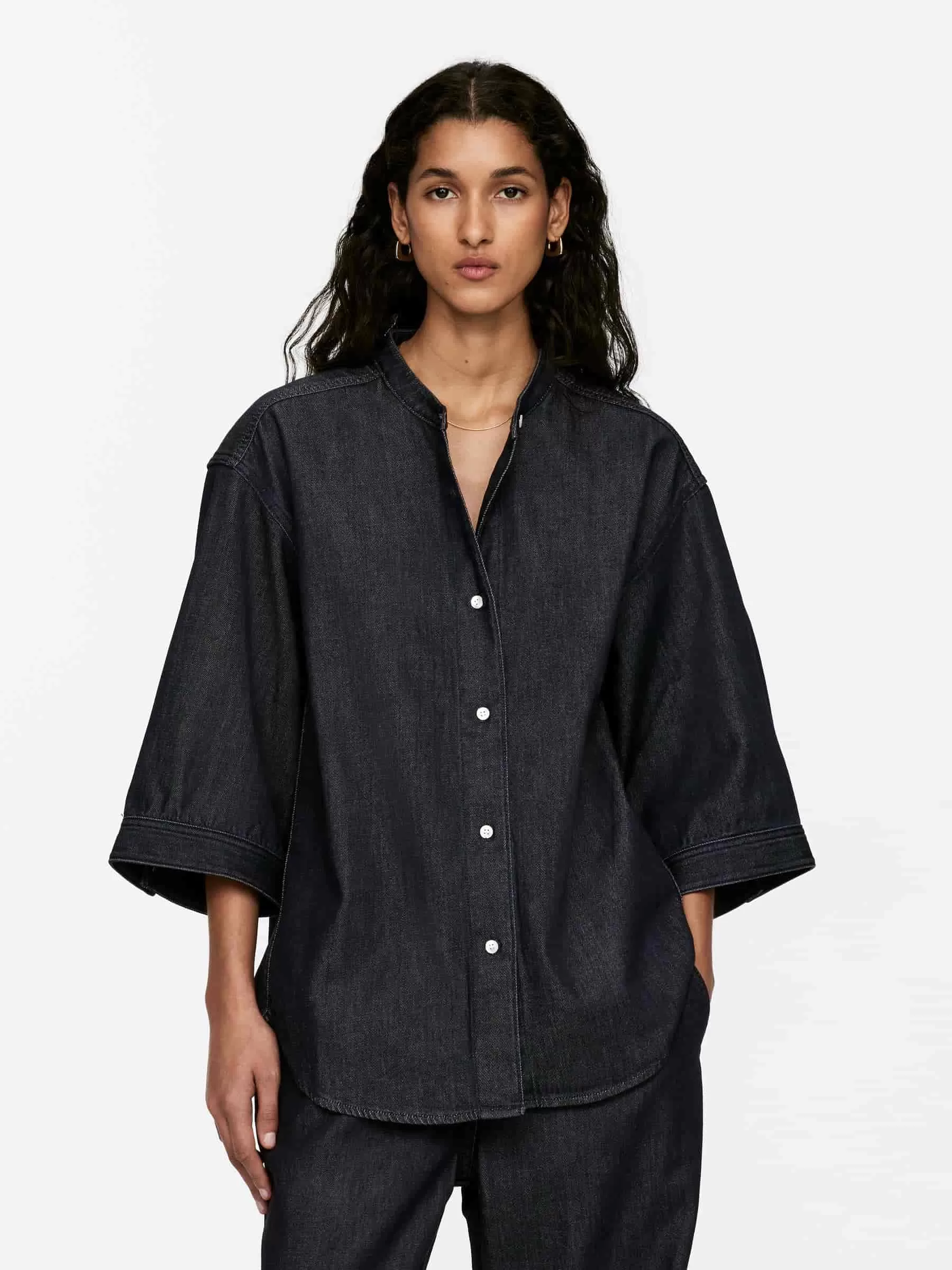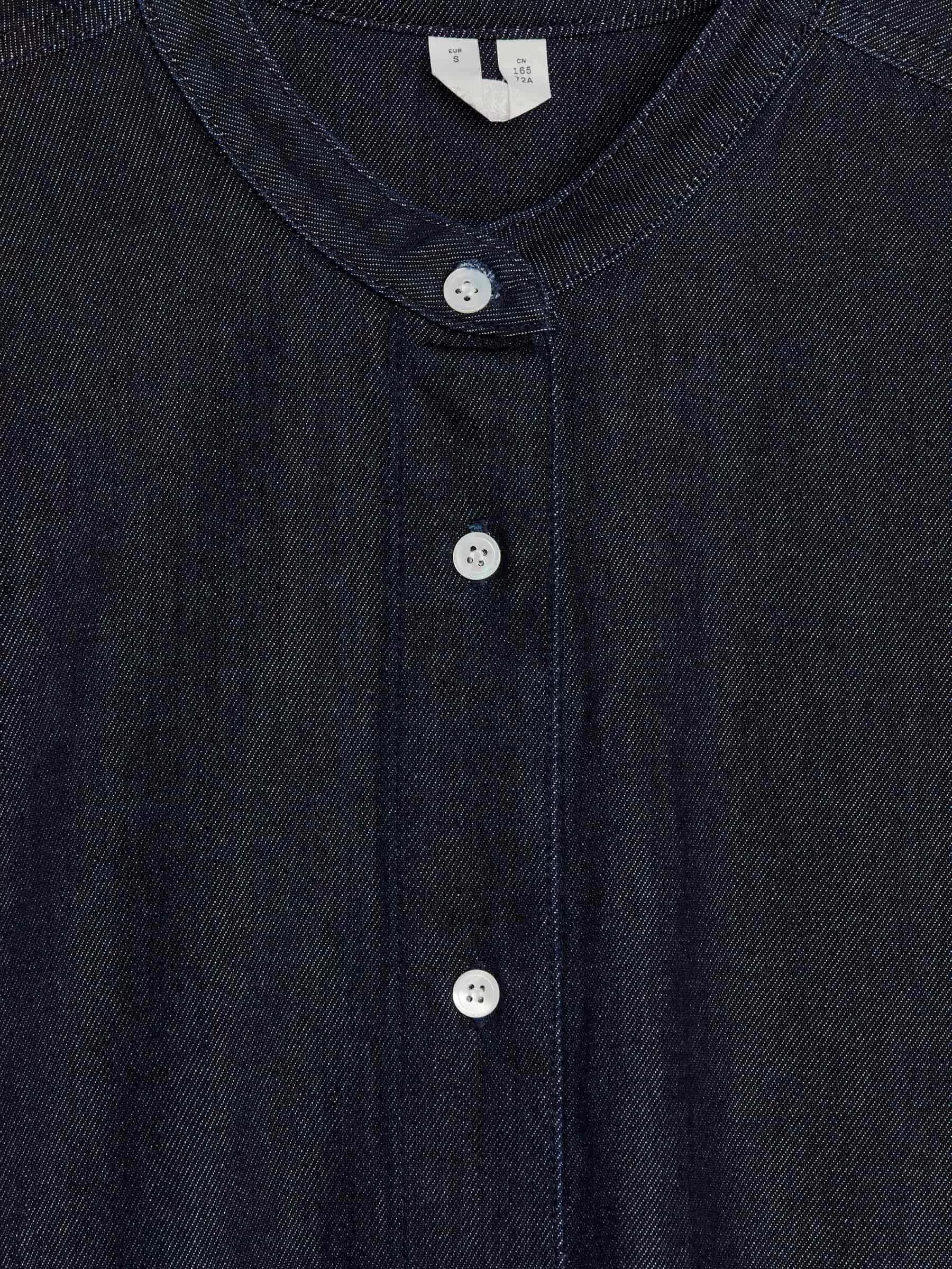 Raw denim shirt crafted from a blend of cotton and lyocell. A collarless style with three-quarter length sleeves and buttoned cuffs. Regular fit.