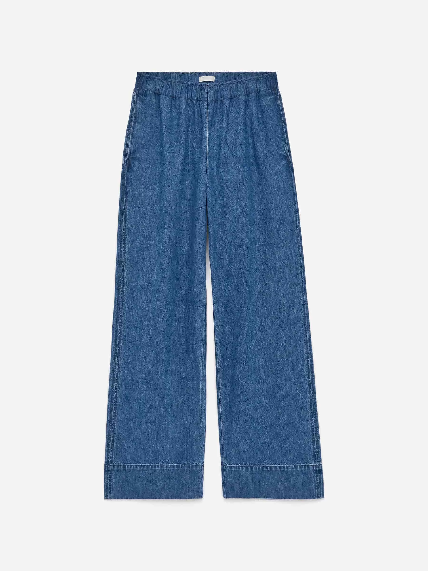 Jeans cut from a soft denim fabric, featuring a mid-rise waist with elastics and side pockets. Relaxed fit.