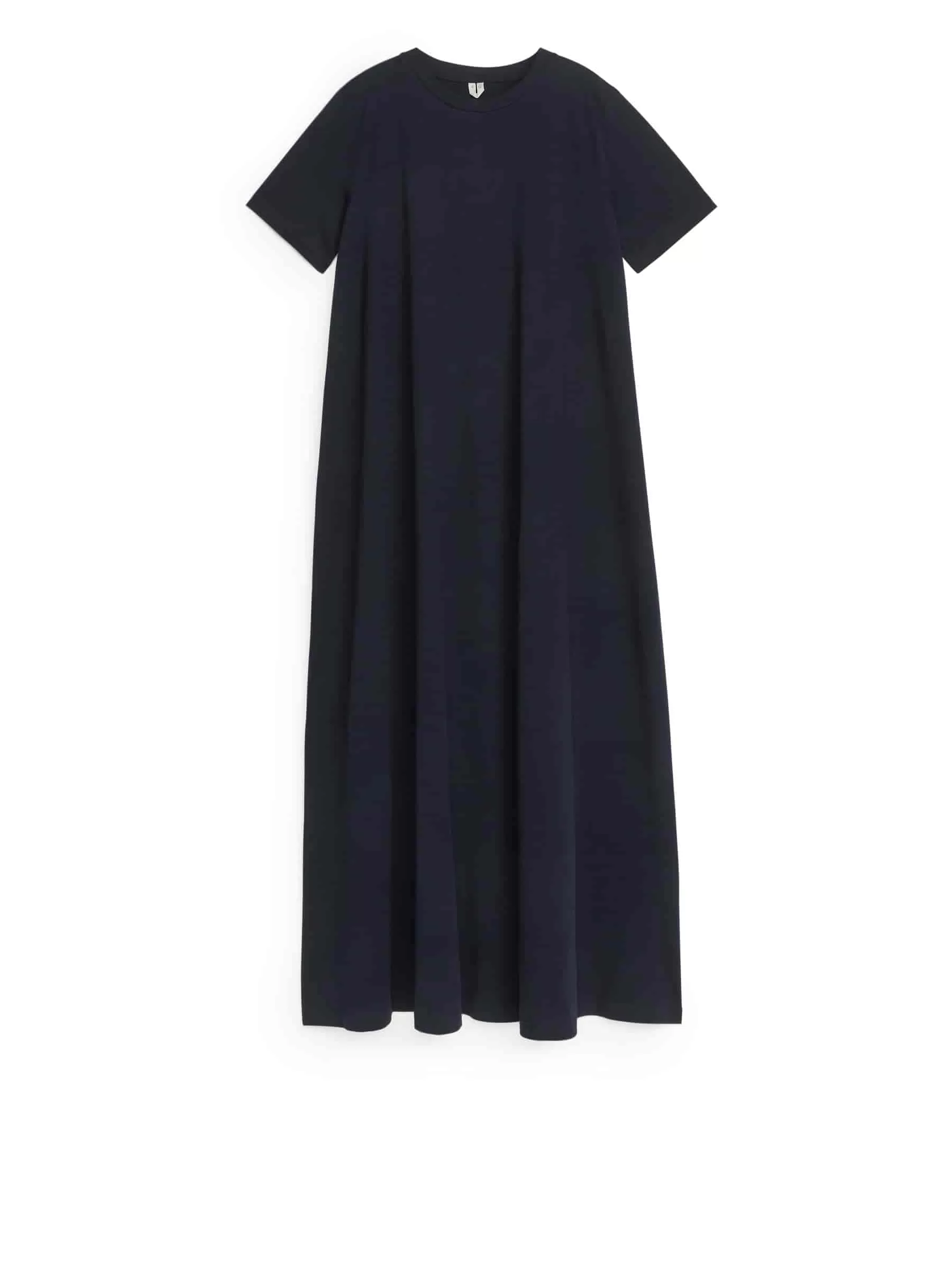 Roomy T-shirt dress cut from a single jersey fabric made of cotton. This is a full-length dress designed with a crew-neck and a cut-seam at centre back.