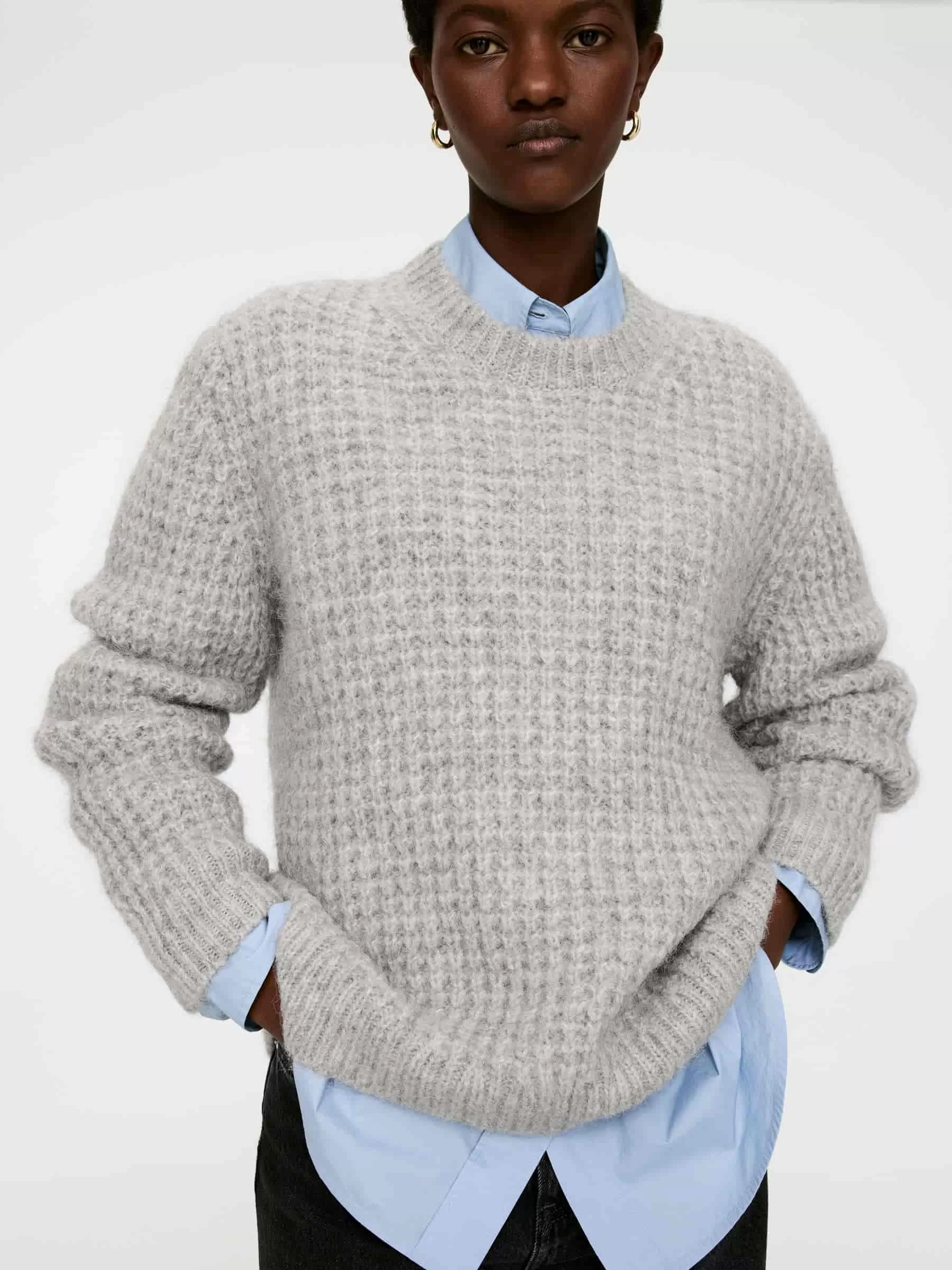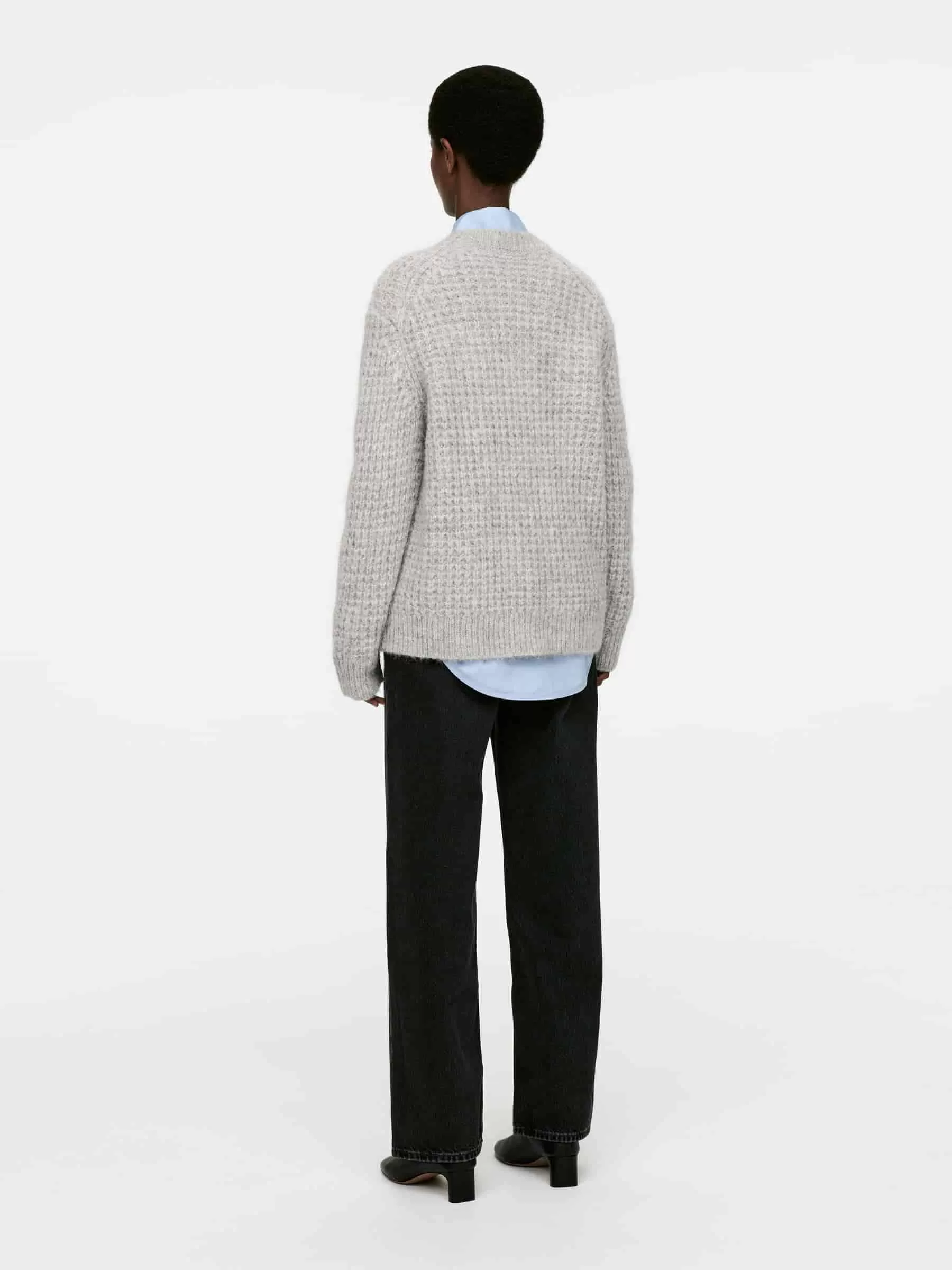 Crew-neck jumper made from a wool-alpaca blend in a half cardigan stitch. Ribbed trims. Relaxed fit. This style contains 44% RAS Alpaca and 56% RWS wool (TE-00047206). Products certified to the Responsible Wool Standard (RWS) and the Responsible Alpaca Standard (RAS) contain wool and alpaca fiber from farms independently certified to animal welfare and land management requirements.