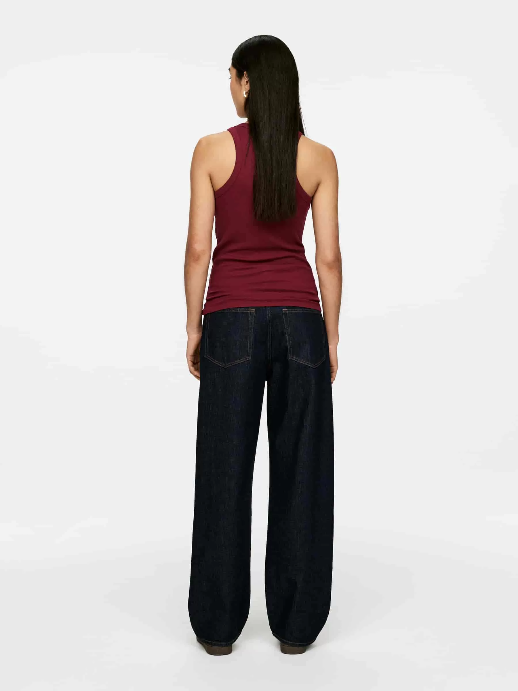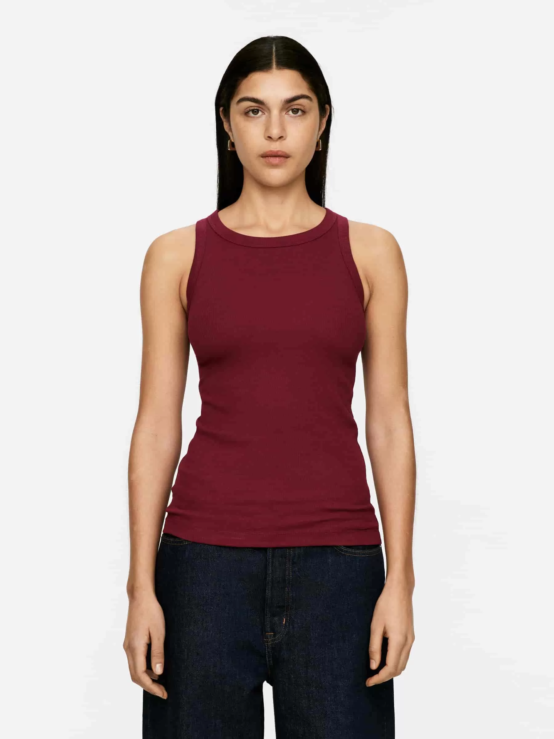 Slim-fit tank top cut from a soft ribbed jersey fabric made from cotton with a hint of elastane. Designed with a flattering racer-shaped neckline and back.