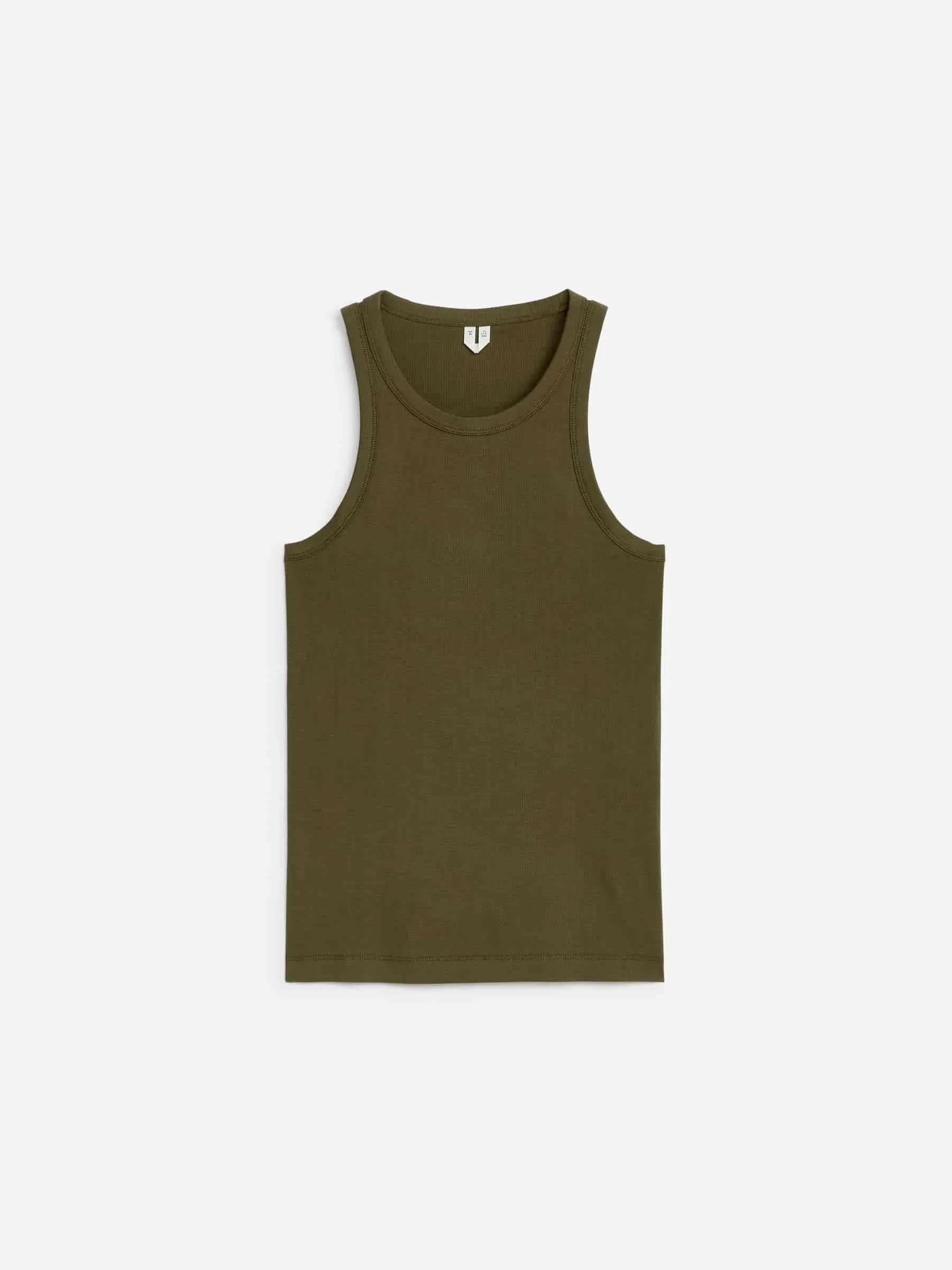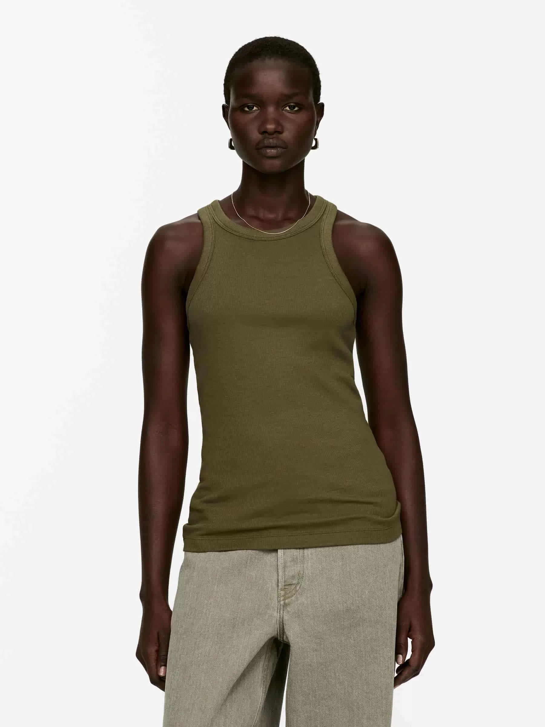 Slim-fit tank top cut from a soft ribbed jersey fabric made from cotton with a hint of elastane. Designed with a flattering racer-shaped neckline and back.