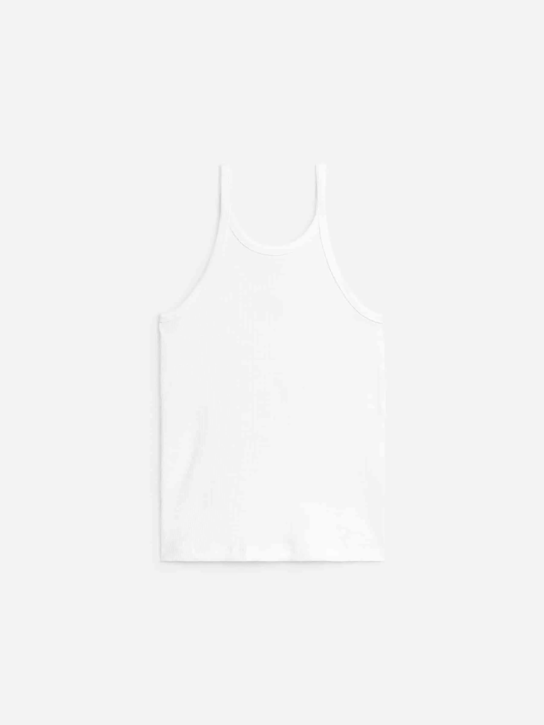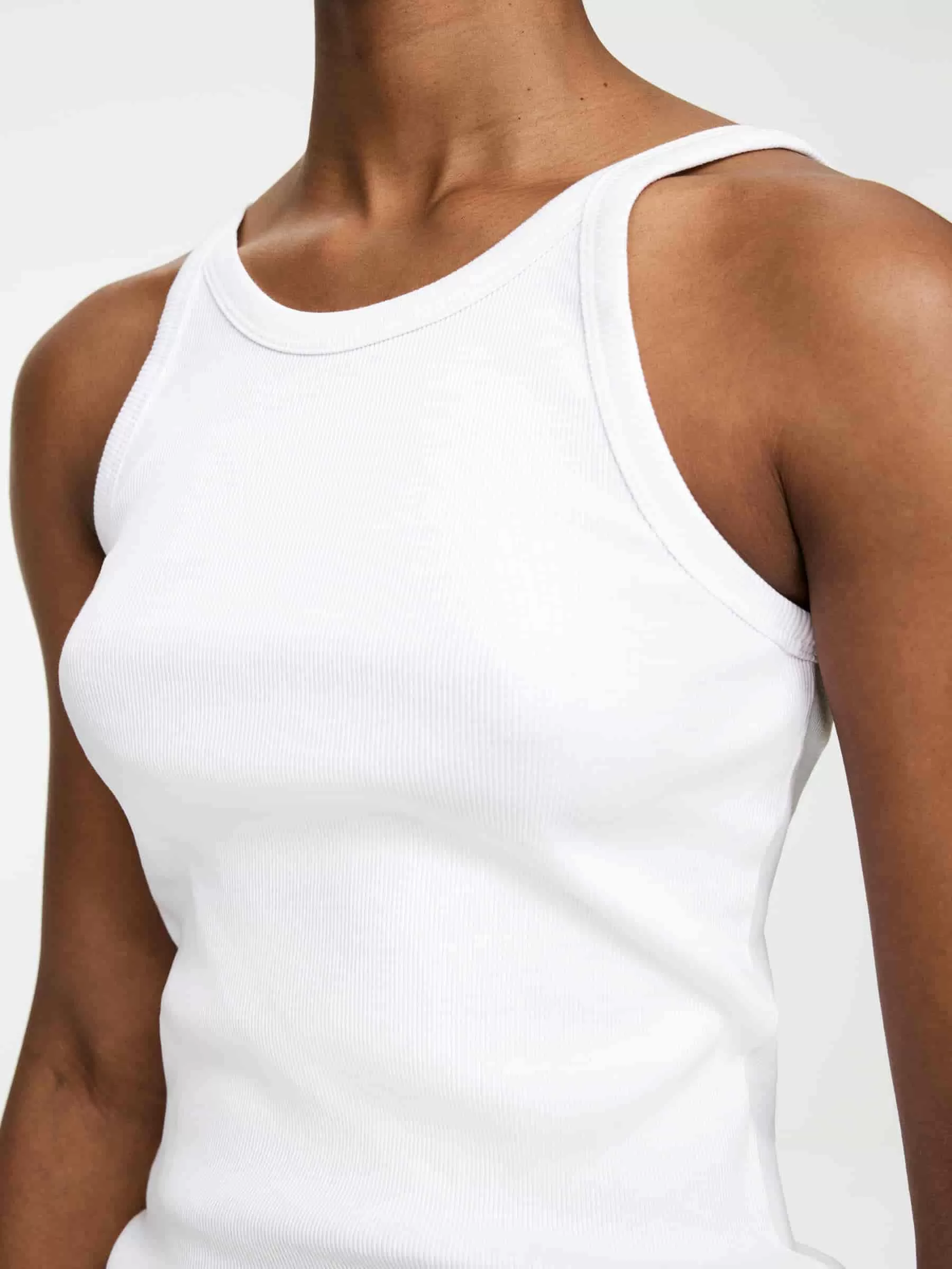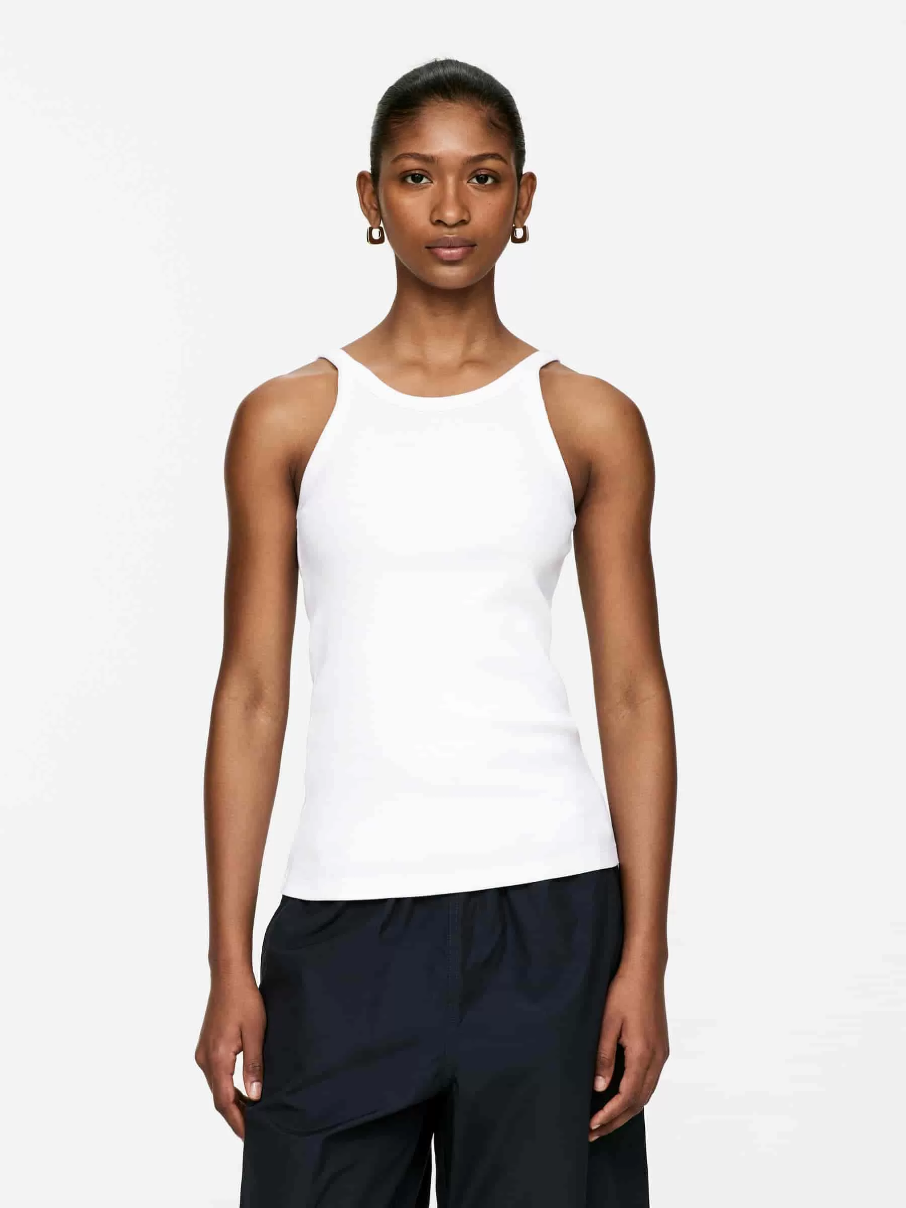 Ribbed tank top made of cotton. A slim-fit style with slender straps and a rounded neckline.