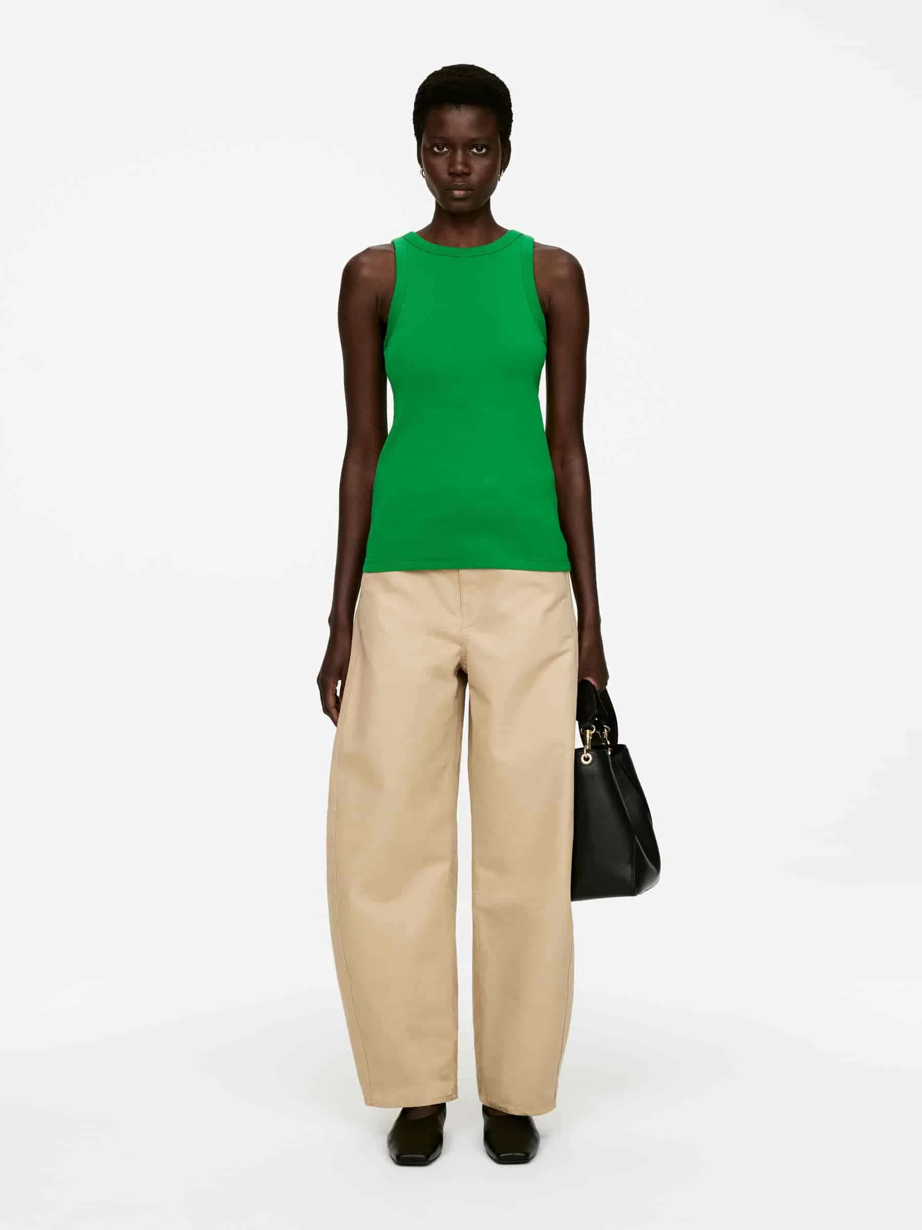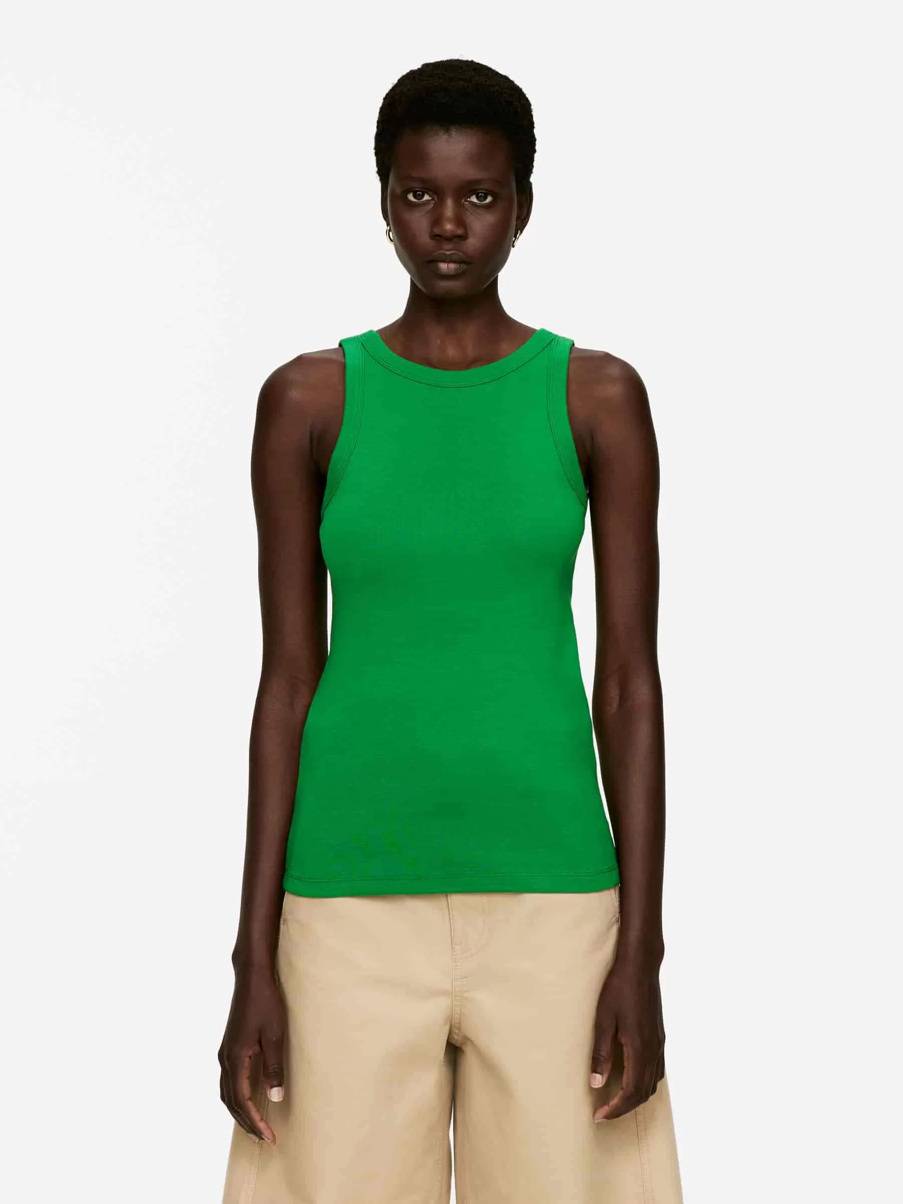 Wide trimmings add a sporty touch to this tank top. Made from a ribbed cotton jersey.