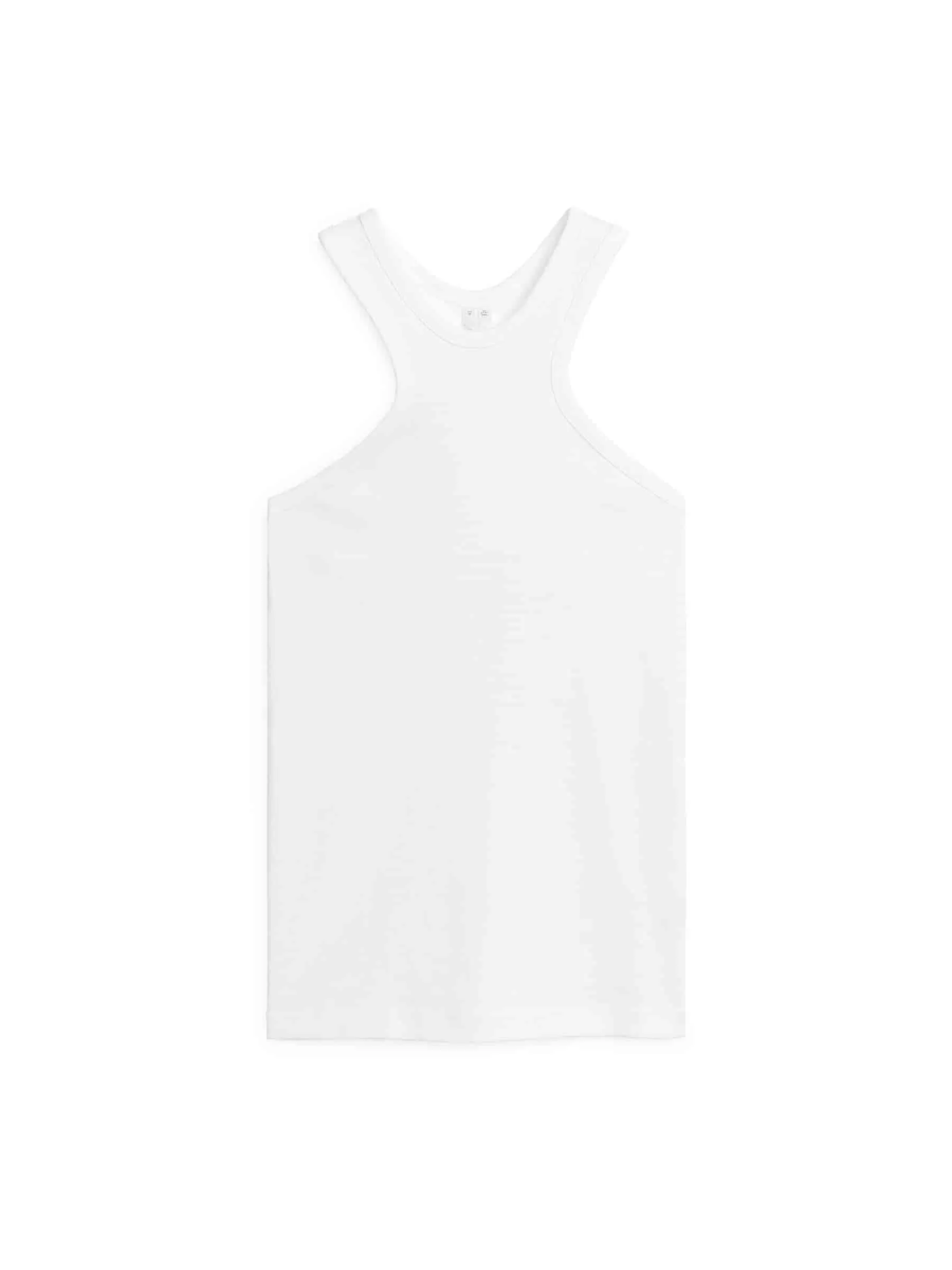 Rib-knitted tank top featuring a cut-away style at the front and a racer shape at the back.