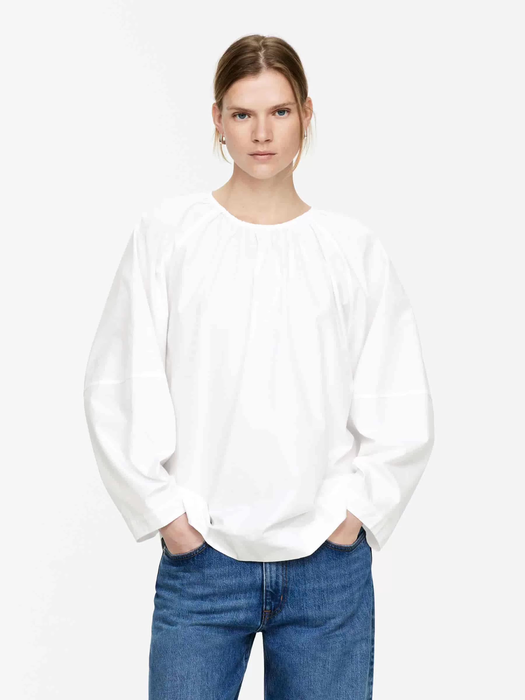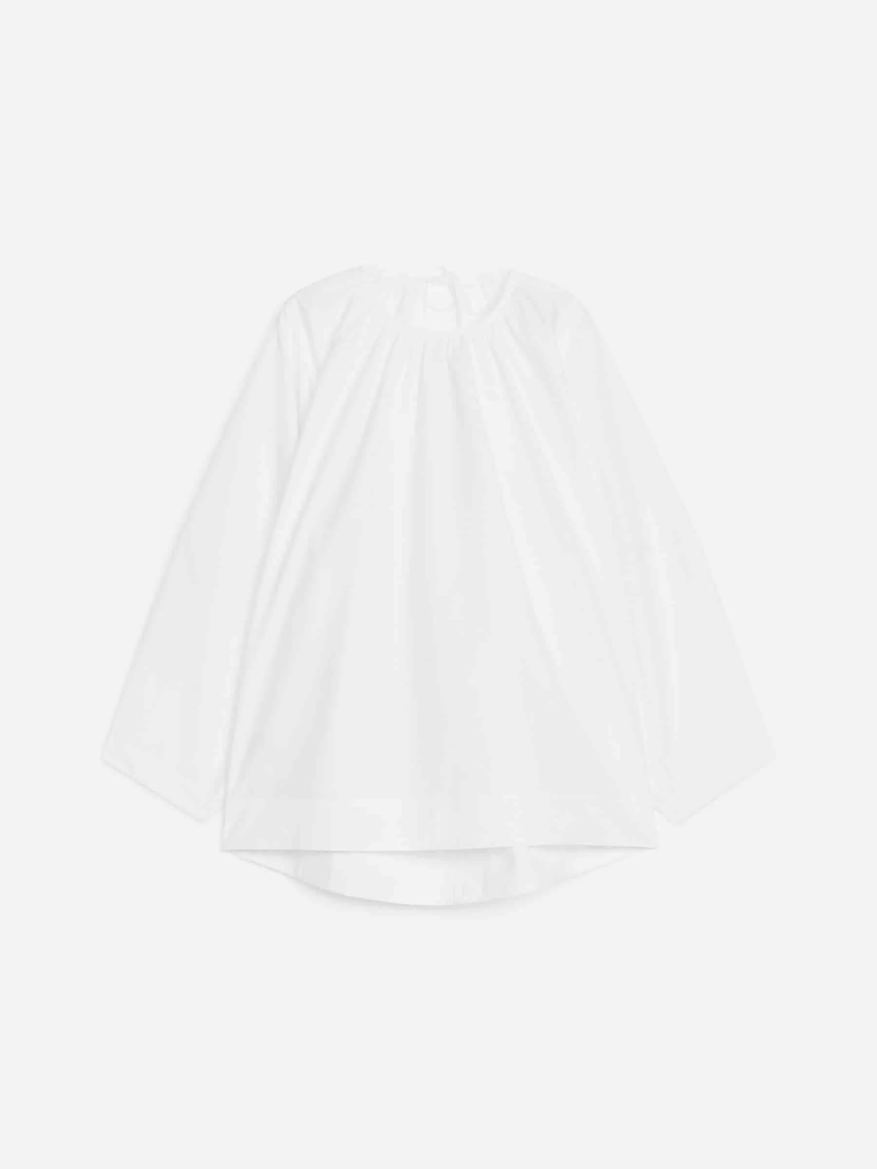 Cotton blouse styled with an open back, gathers at neck and self-ties at centre back. Loose fit.