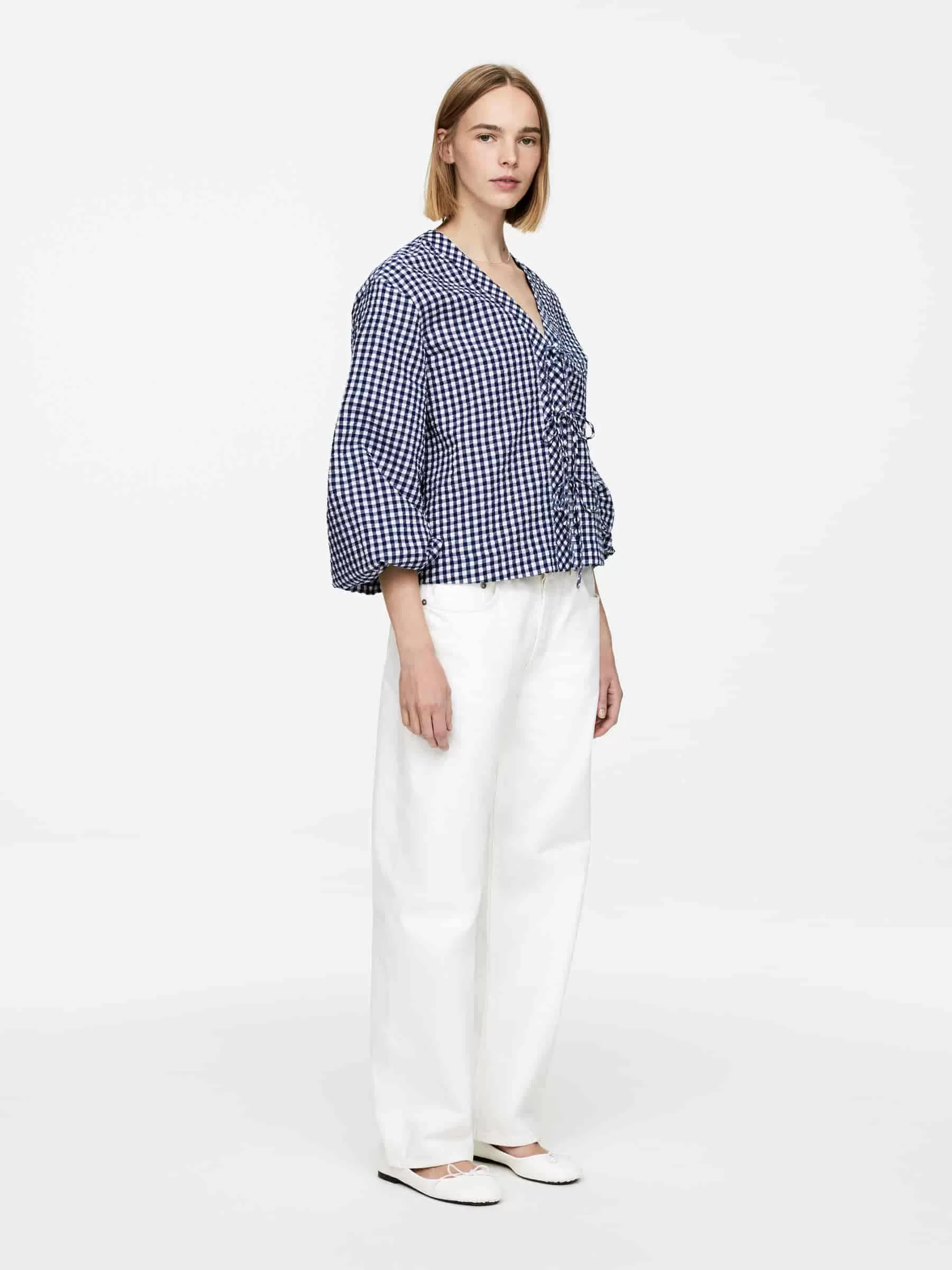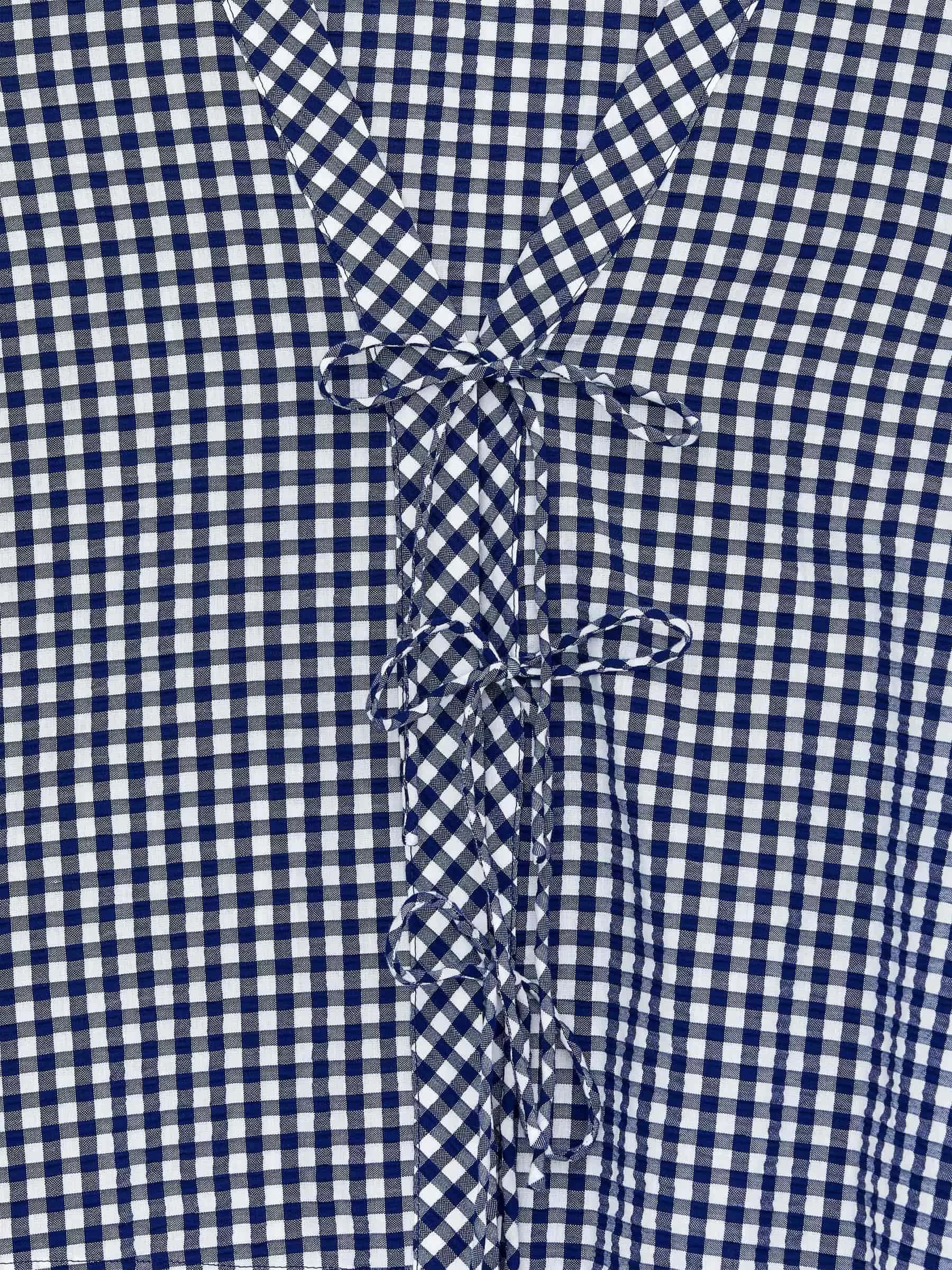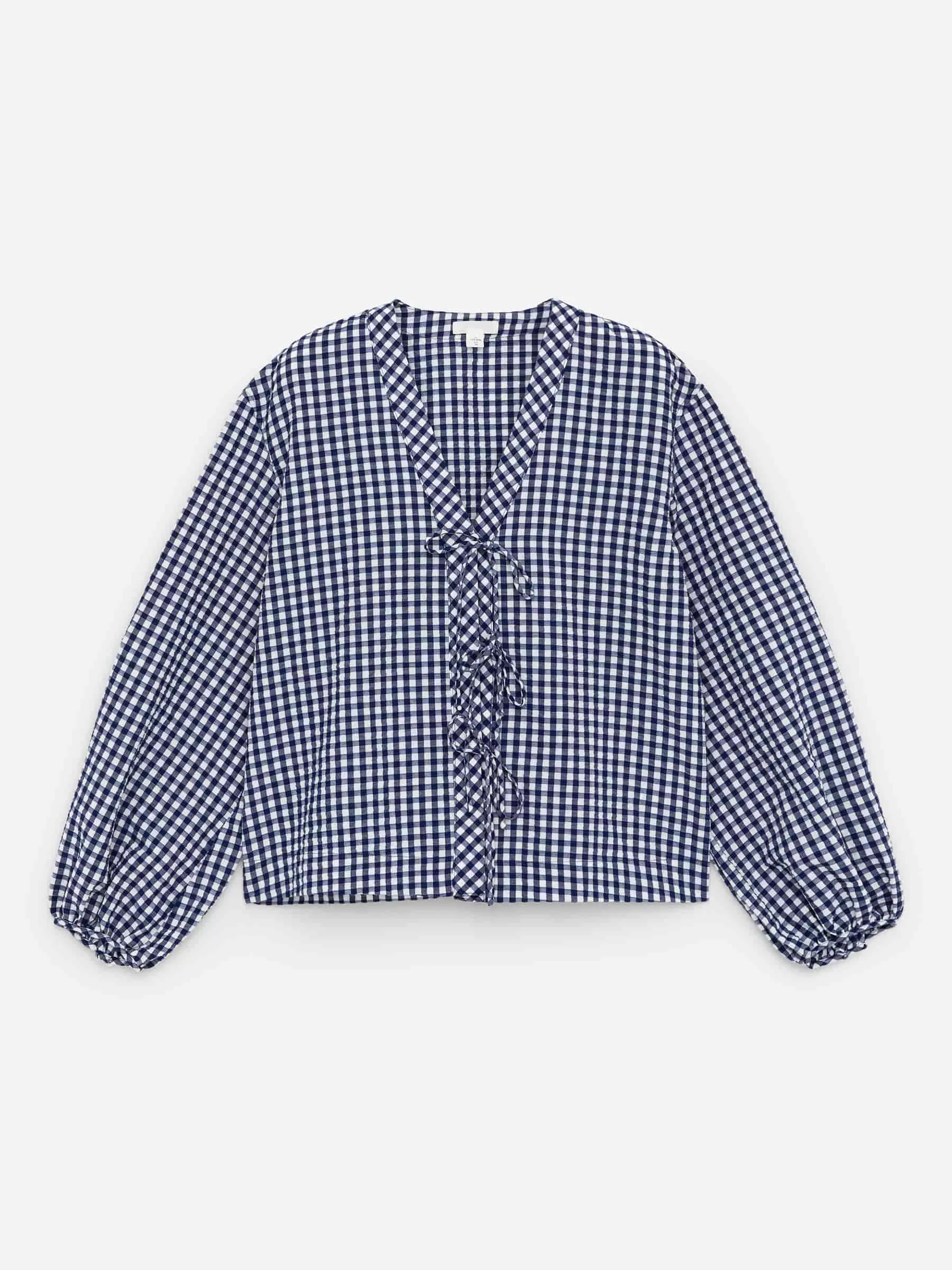 Blouse crafted from a seersucker fabric featuring a gingham checked pattern. A V-neck style with puffy sleeves and tiebands at front. Regular fit.
