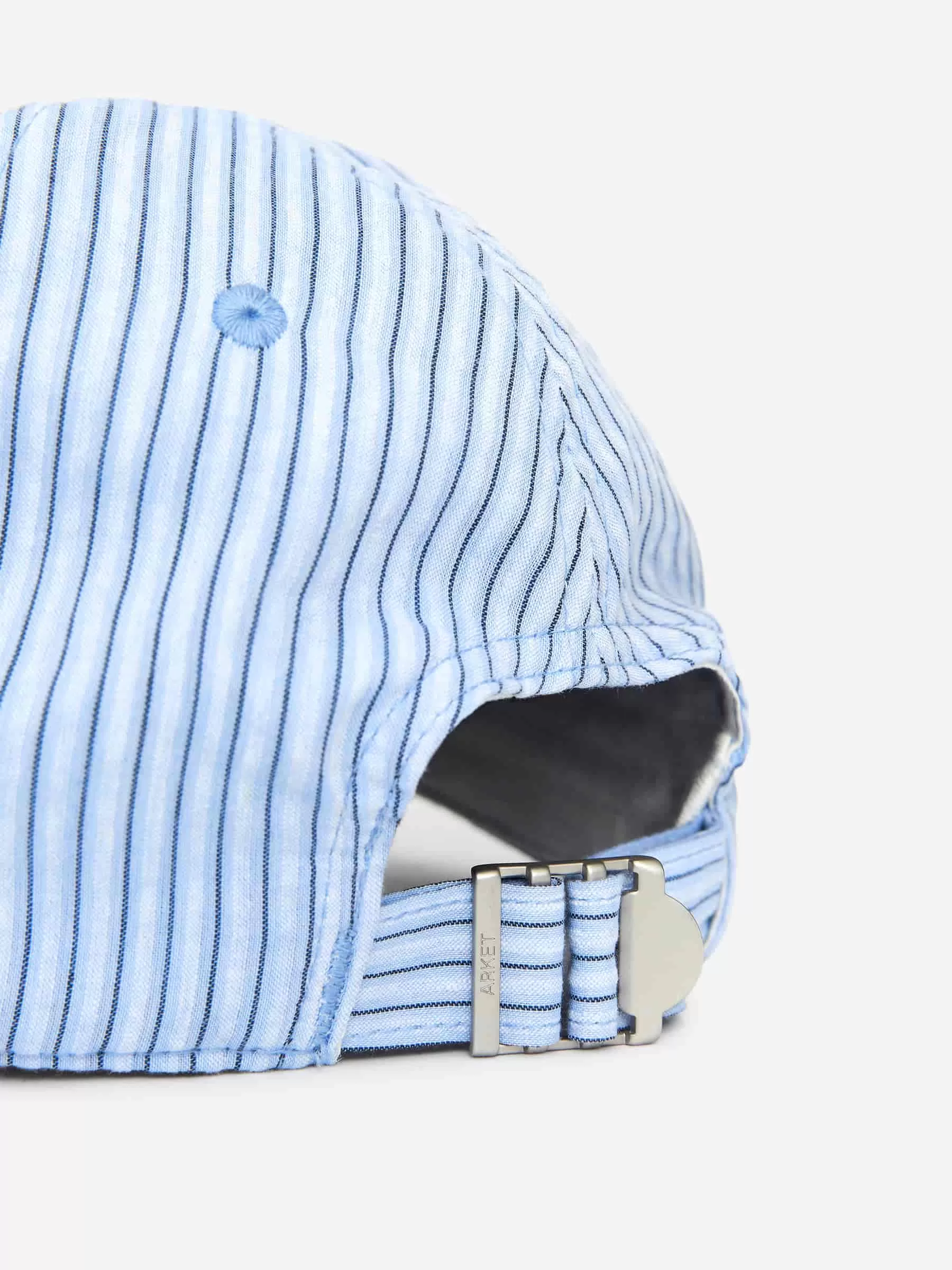 Cap crafted from a seersucker weave made of cotton and linen. Strap with a metal buckle at the back, to adjust size.