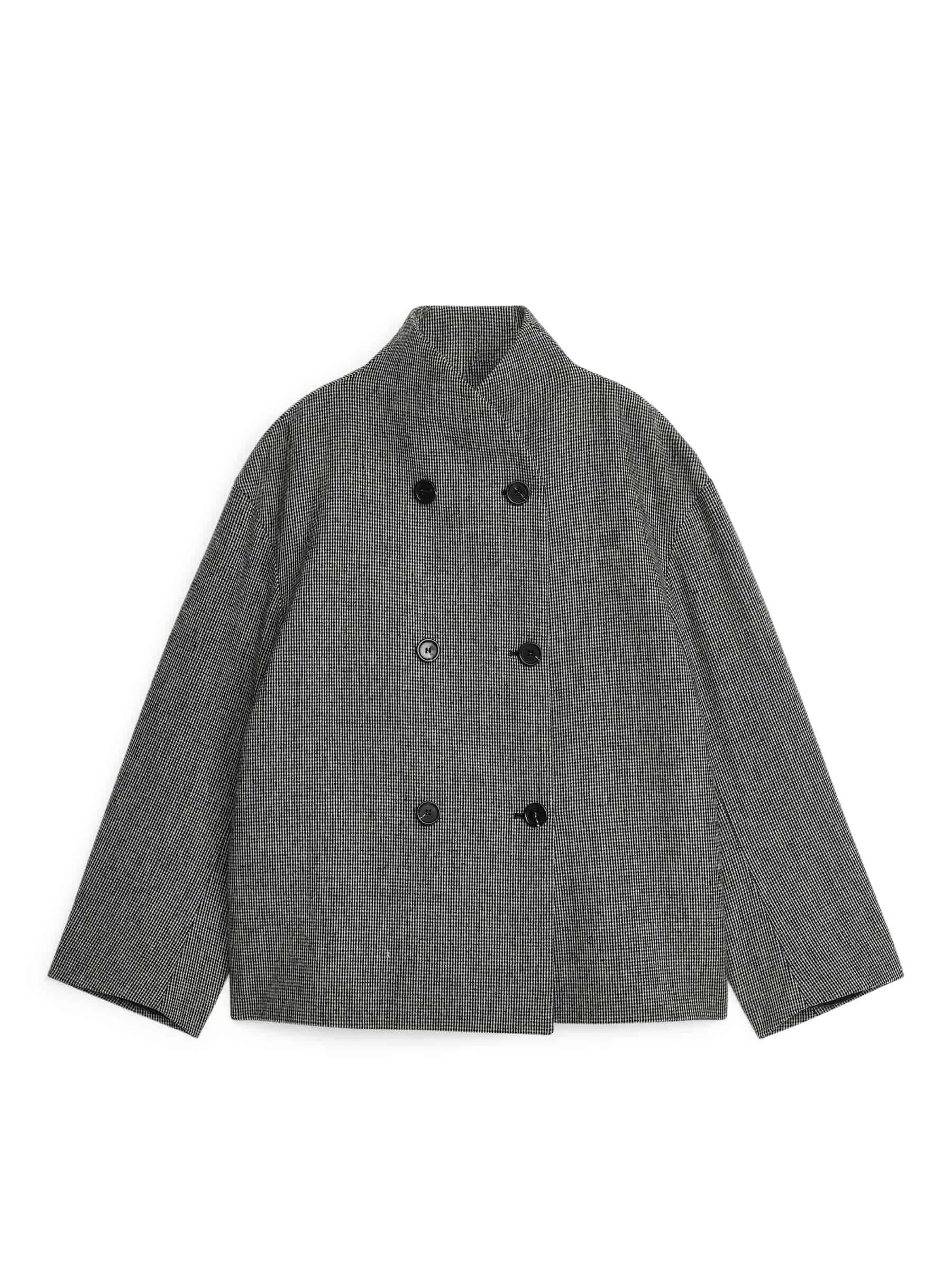Double-breasted jacket crafted from a wool blend. Cut for a slightly rounded, oversized silhouette and detailed with a shawl collar. Hidden pockets at side seams. Fully lined.