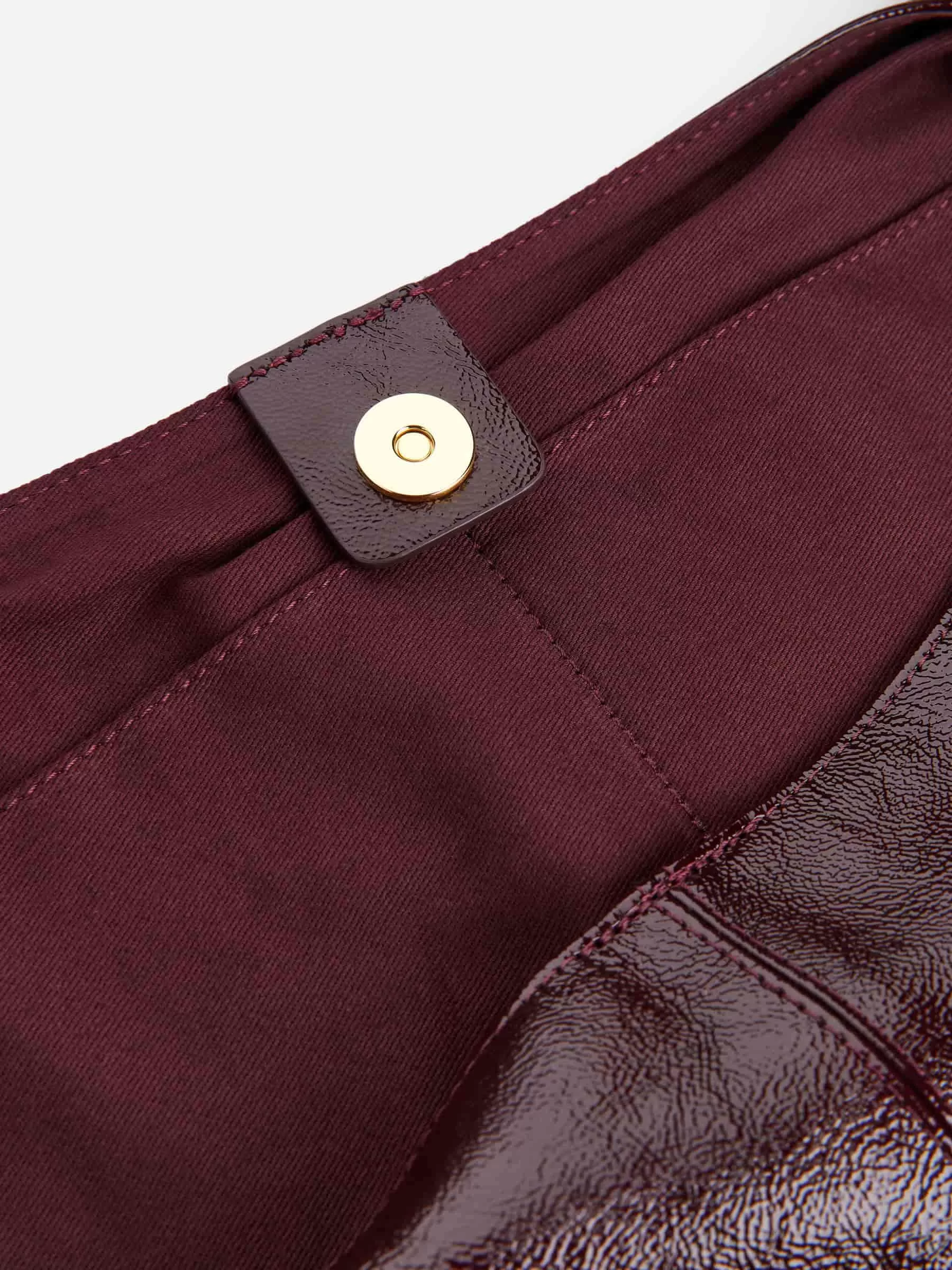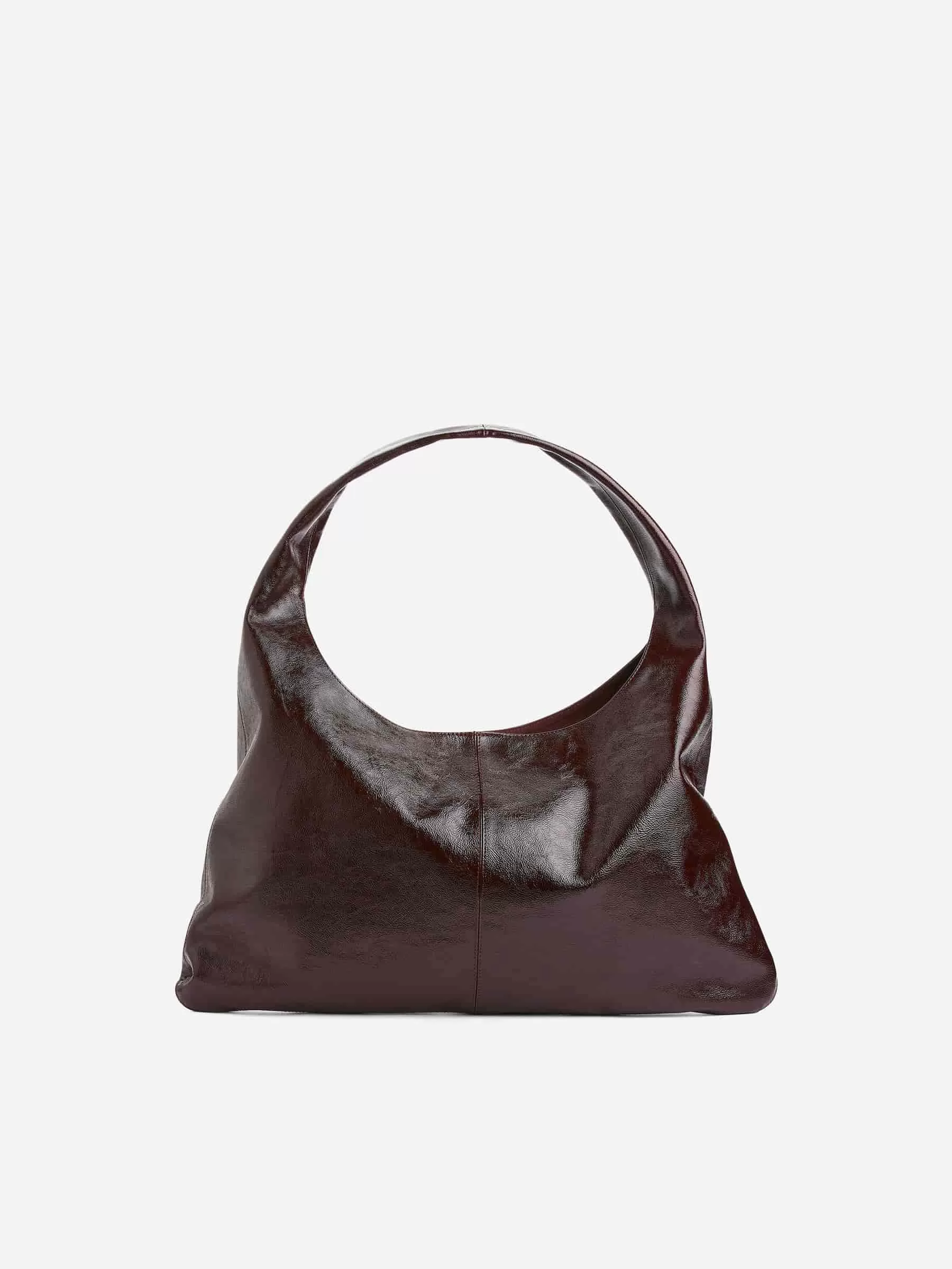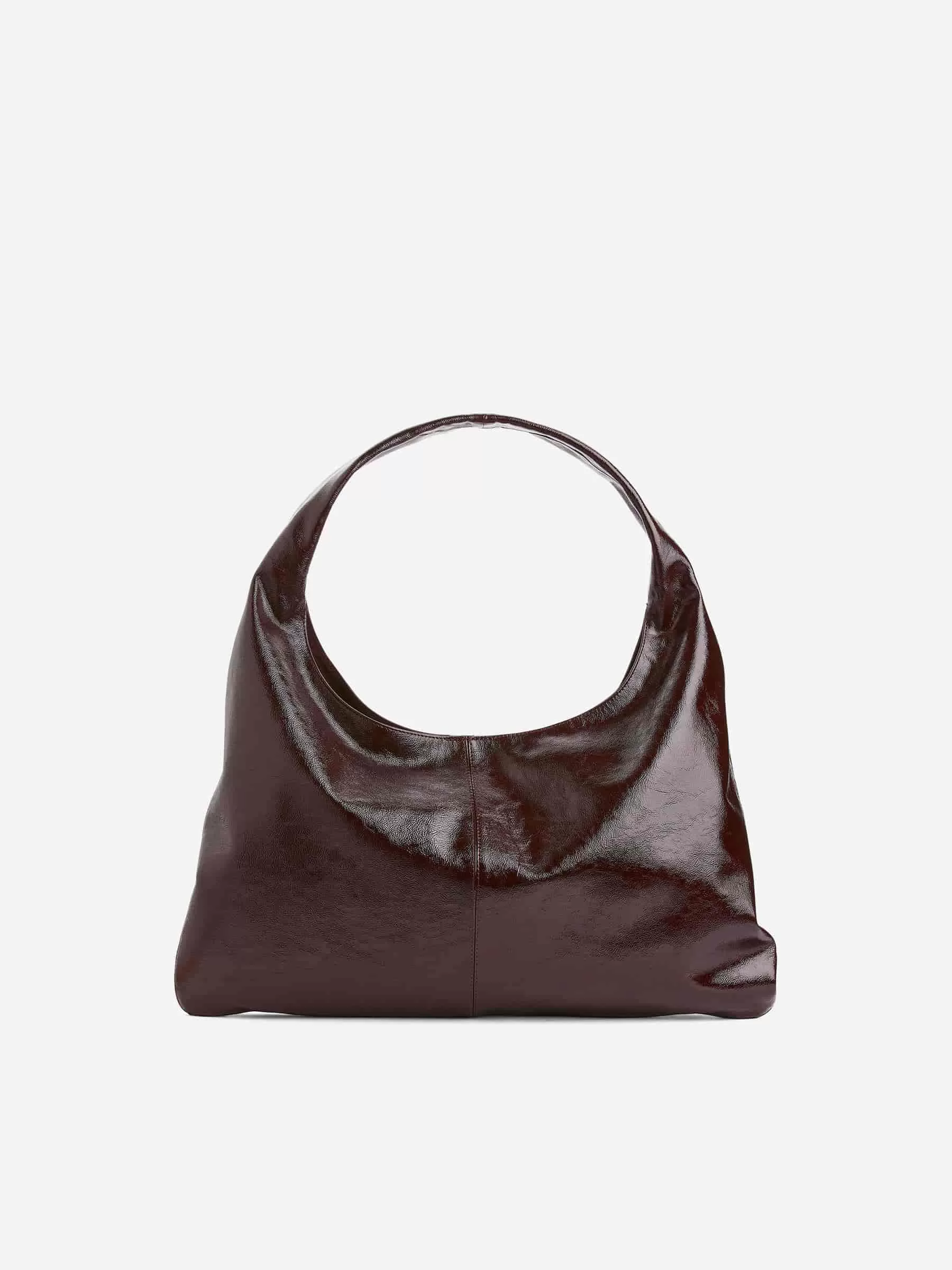 Leather bag with a shiny finish. A flat style with a slouchy appearance when worn on shoulder. Decorative stitch down the middle. Magnetic closure and inside pocket without zip. Width 54 cm, height 31 cm, drop 17 cm.