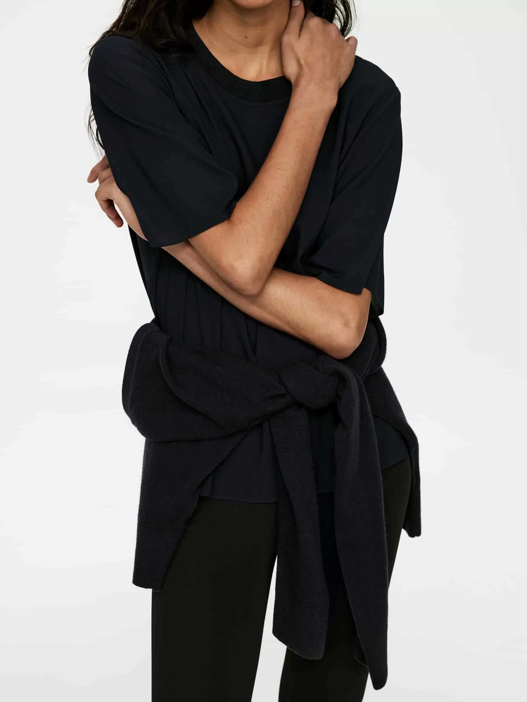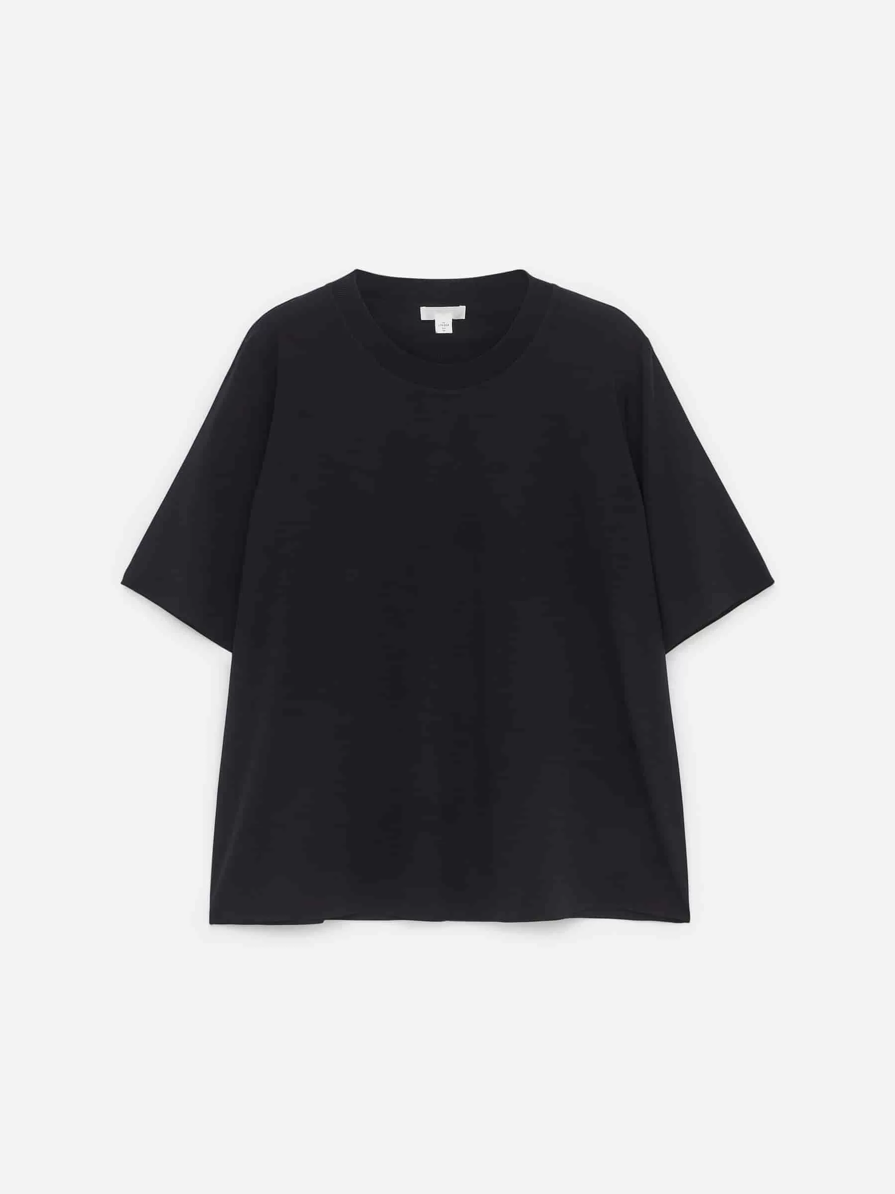 Loungewear T-shirt crafted from a premium stretch silk crepe. Styled with rib at neck.