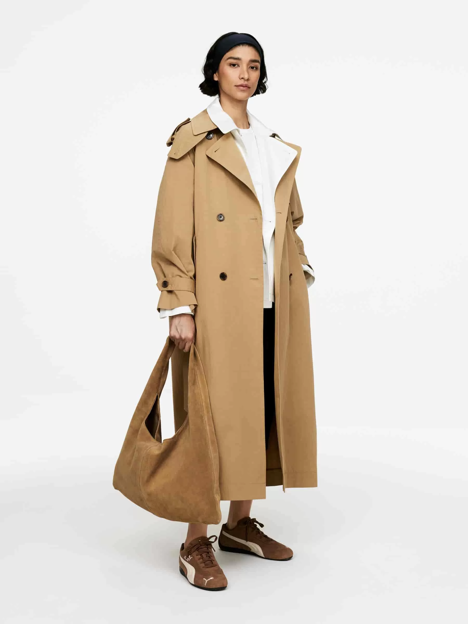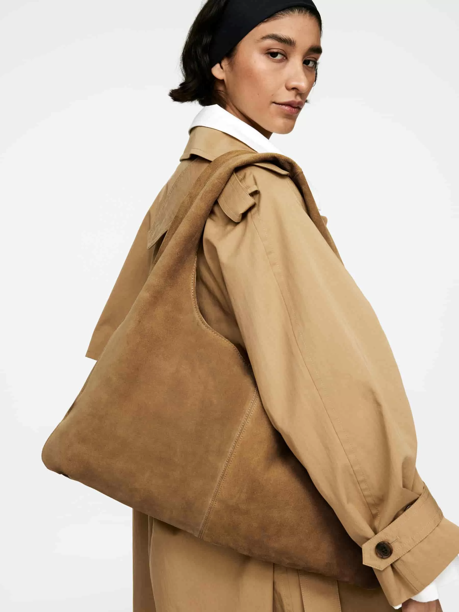 Bag crafted from suede. A flat style with a slouchy appearance when worn on shoulder. Decorative stitch down the middle. Magnetic closure and inside pocket without zip. Width 54 cm, height 31 cm, drop 17 cm.