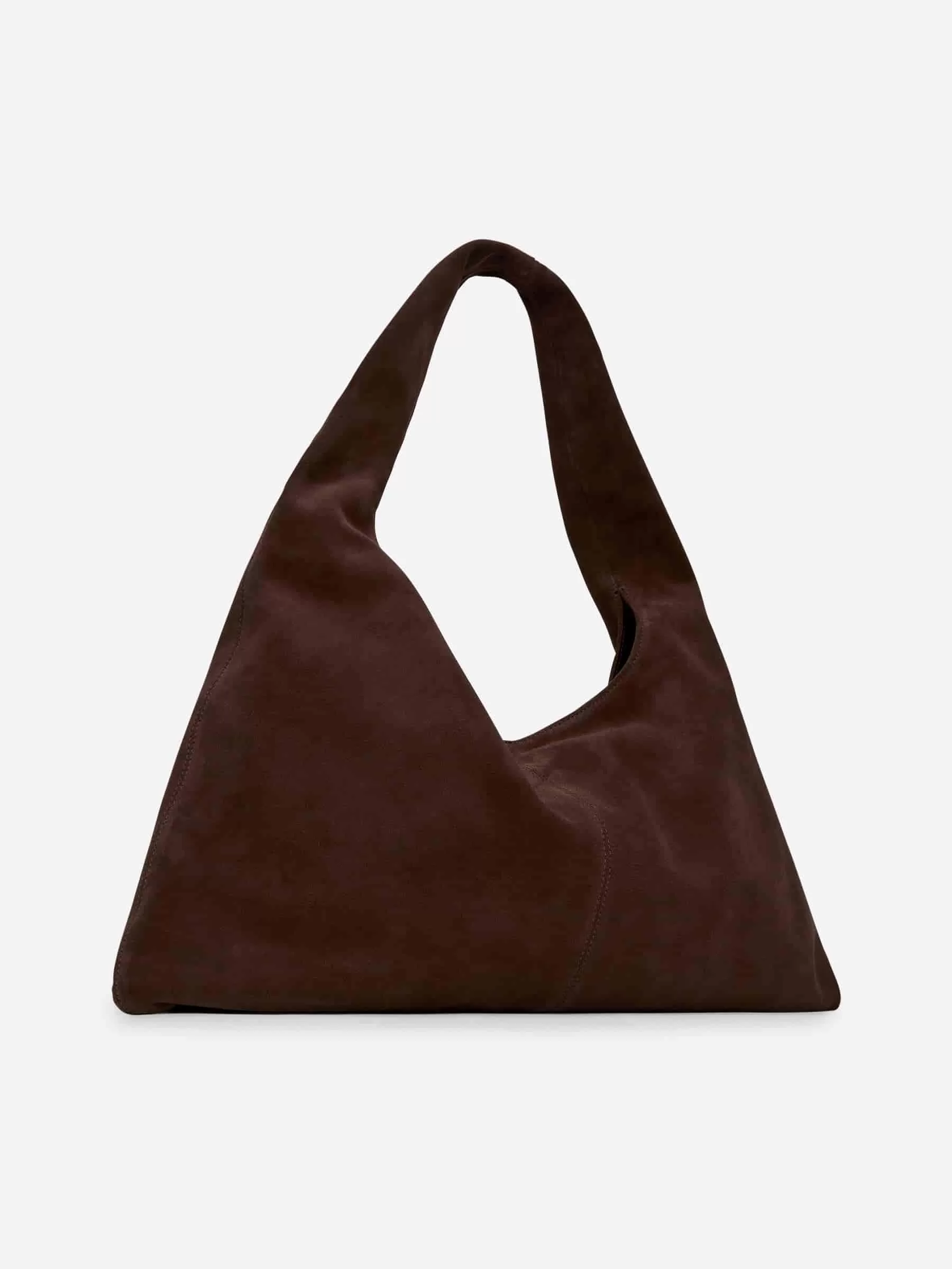 Bag crafted from chrome-free suede. A flat style with a slouchy appearance when worn on shoulder. Decorative stitch down the middle. Magnetic closure and inside pocket without zip. Width 54 cm, height 31 cm, drop 17 cm.