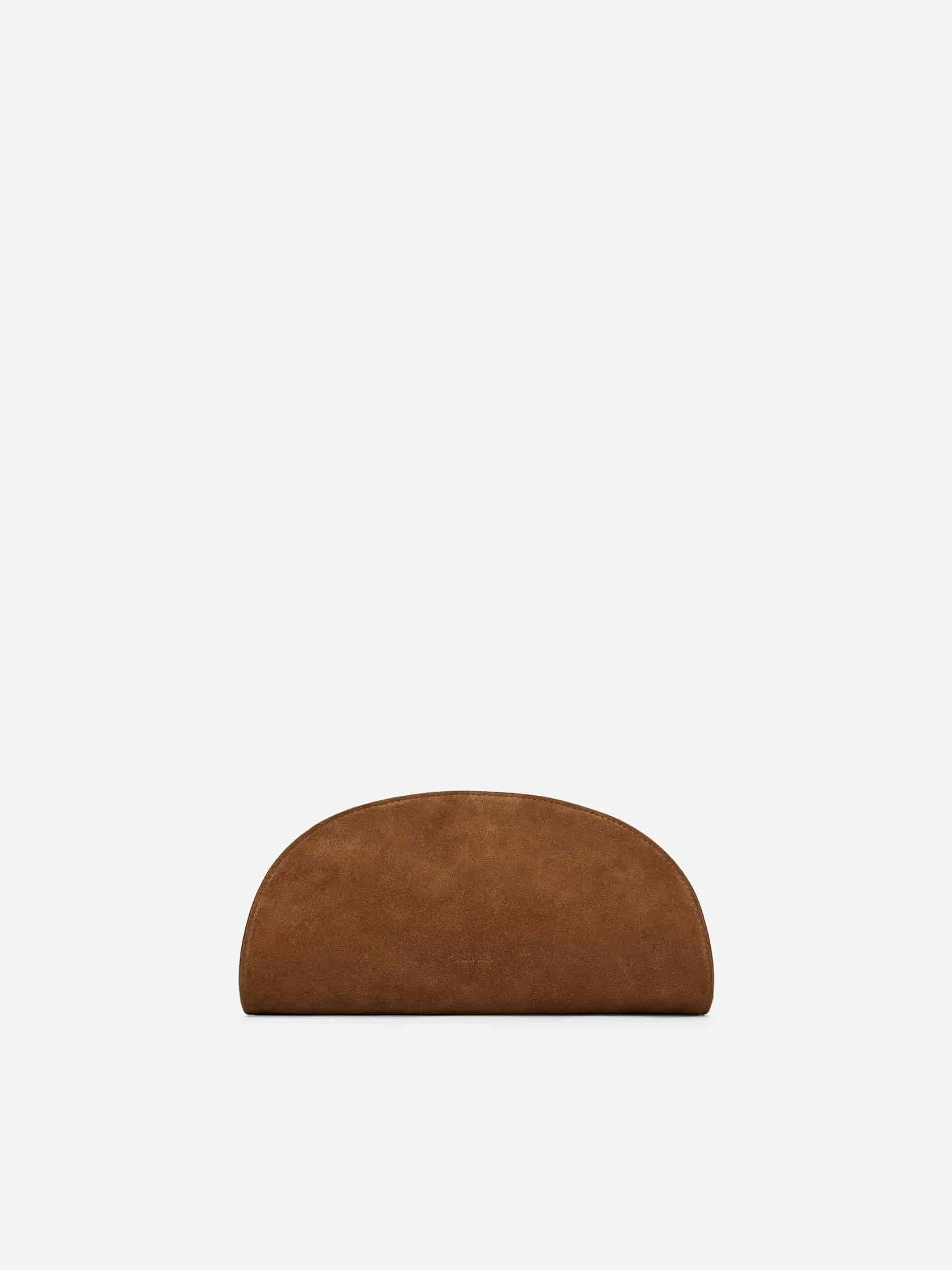 Half-moon-shaped clutch made from suede. By adding the adjustable strap, the bag can also be worn as a crossbody. Zip closure and gold-coloured trims. One inner pocket. Measurements 27 cm x 12 cm x 10 cm.