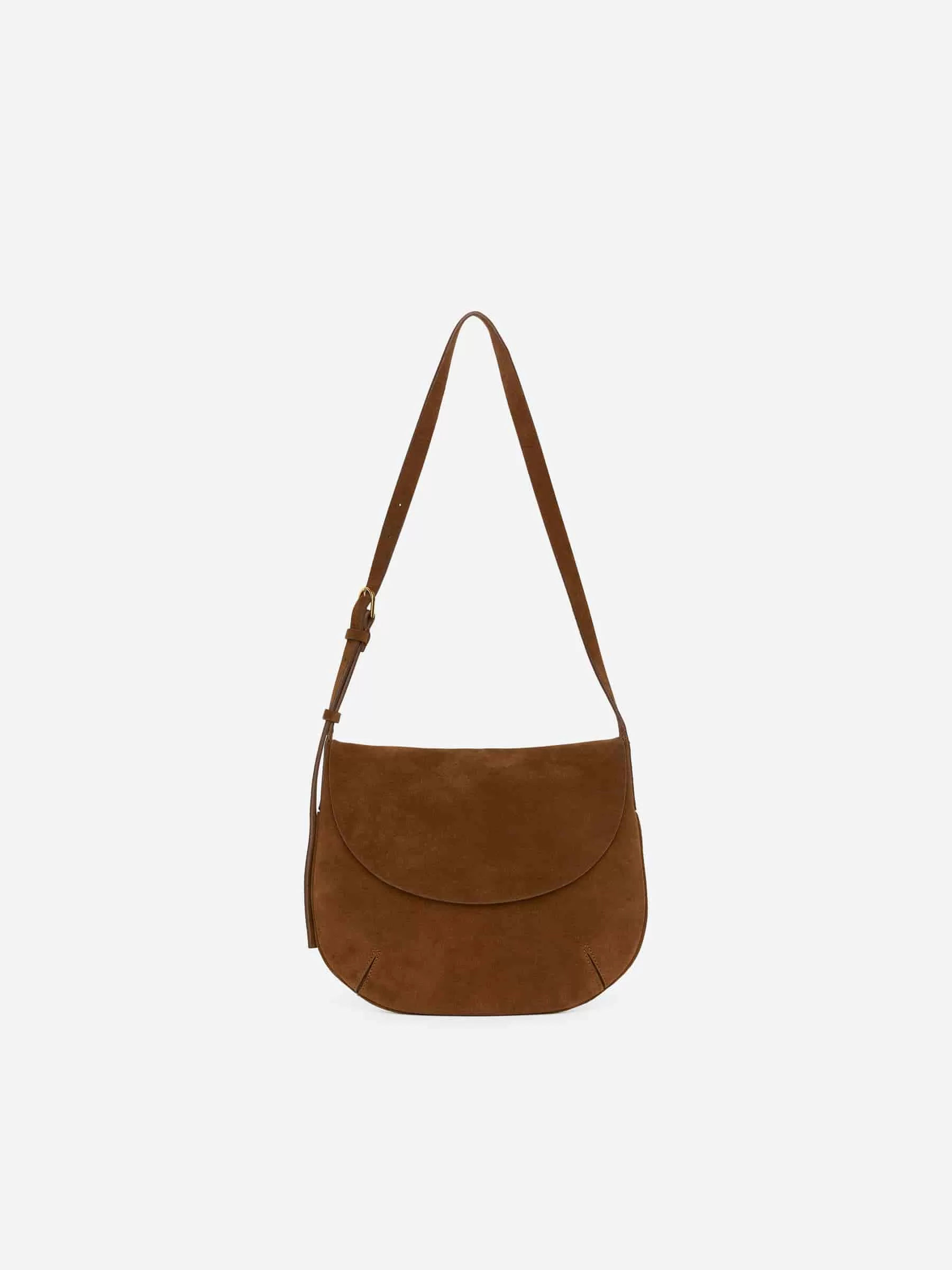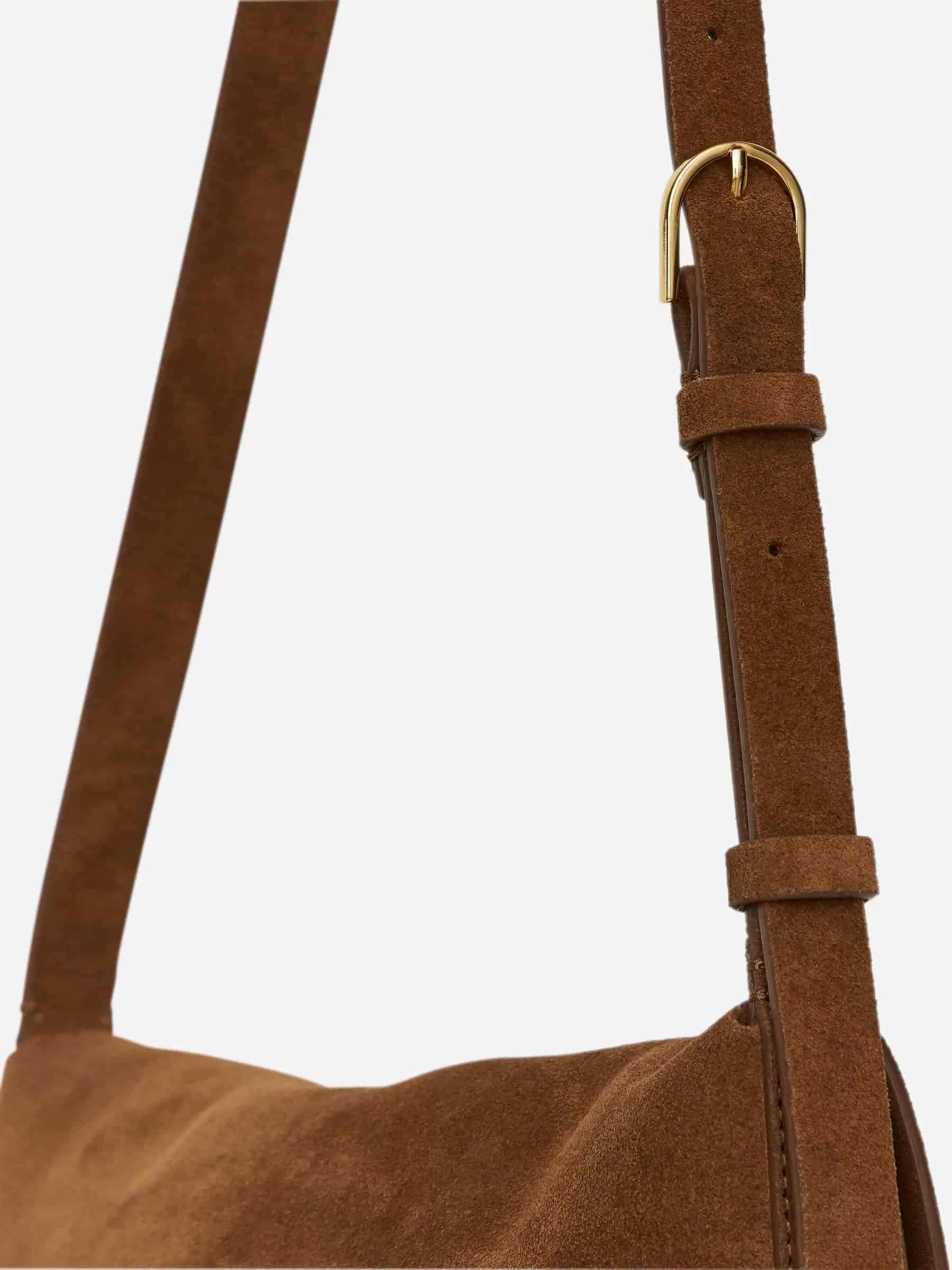 Crossbody bag crafted from chrome-free suede. Features a tab with a magnetic closure and an internal pocket. Adjustable strap with multiple holes. Width 31 cm, height 25.5 cm. Strap drop 40 cm (when buckled in the middle hole).