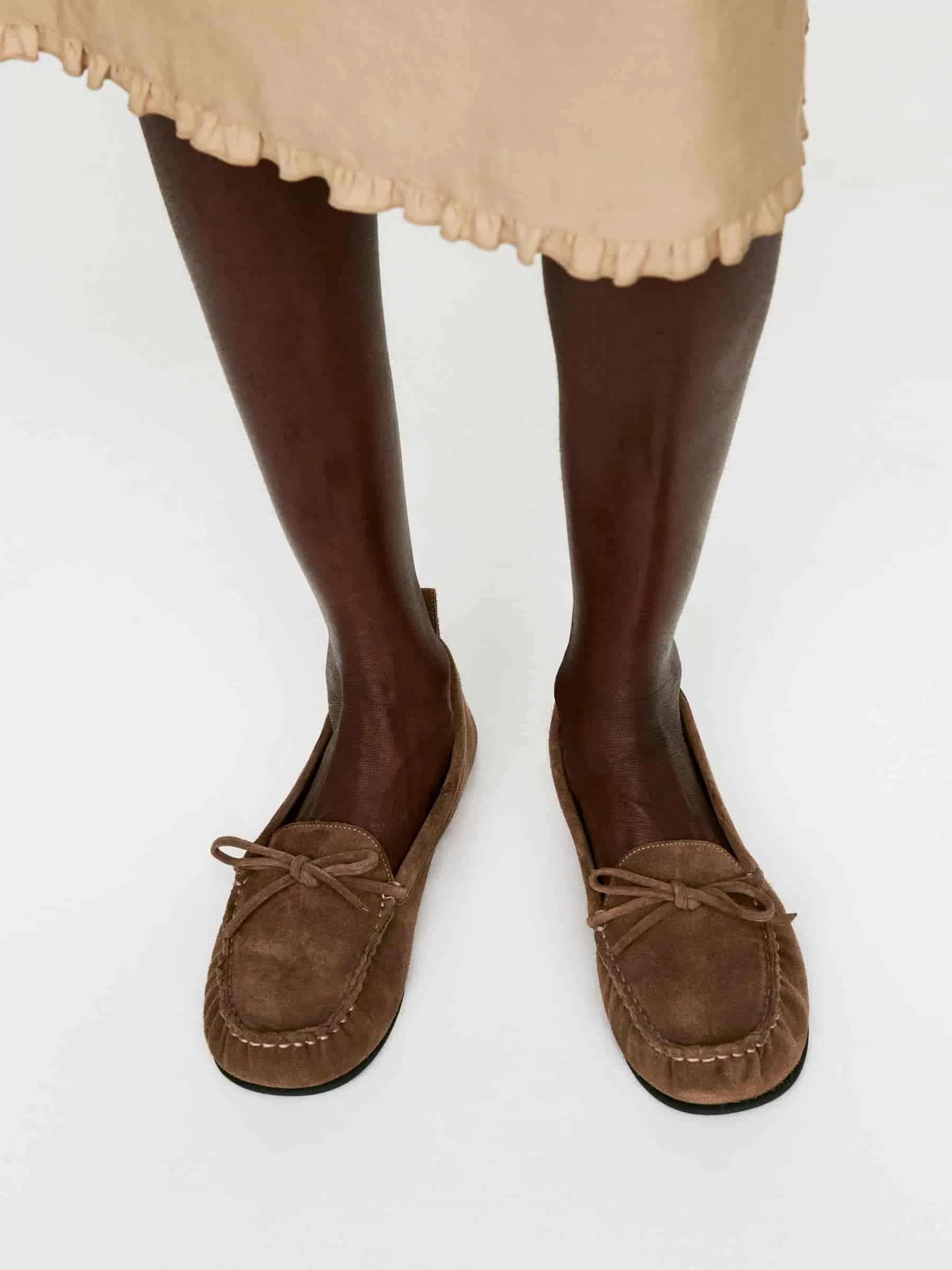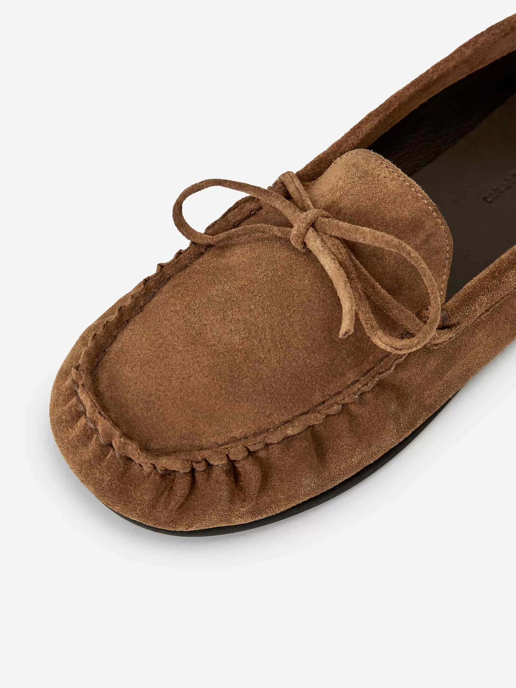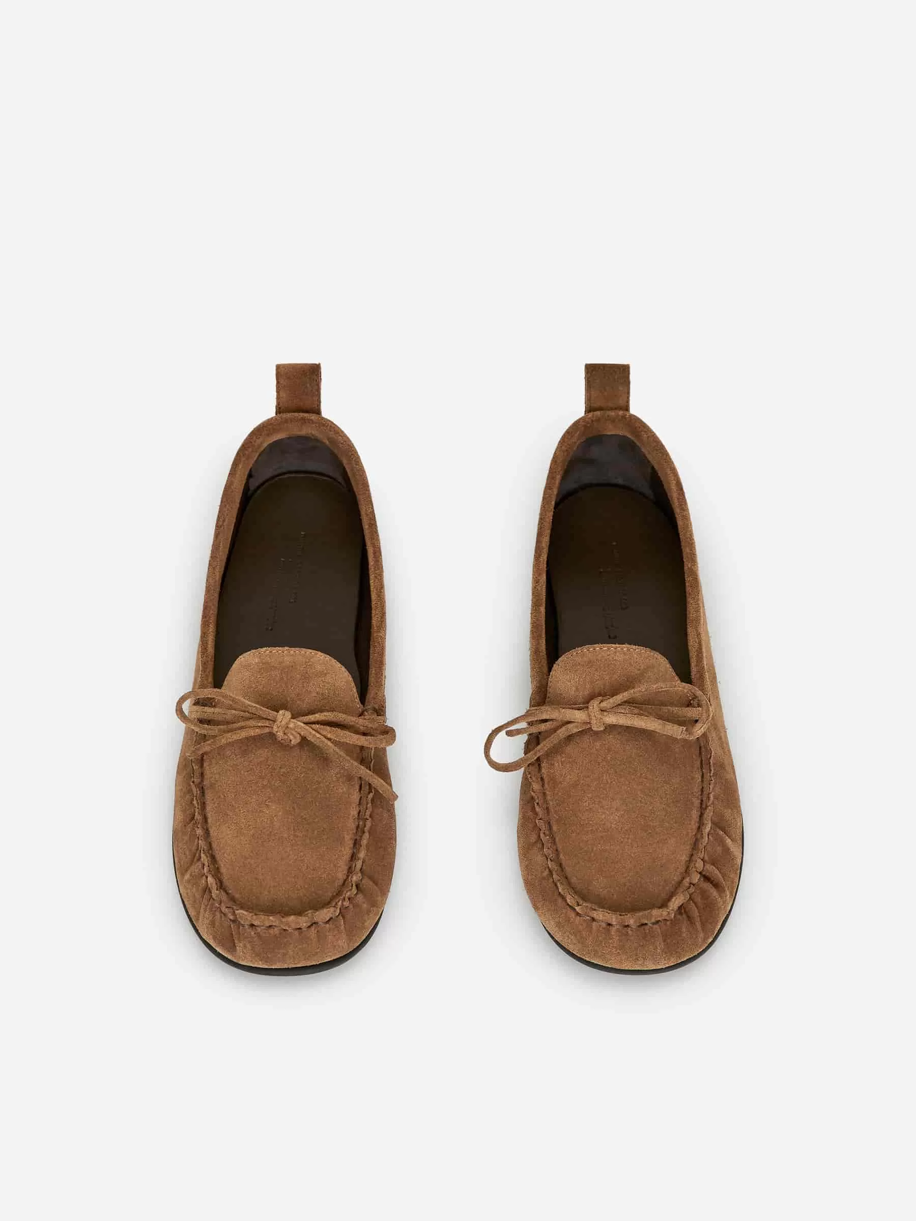 Suede moccasin loafers featuring a decorative upper seam, flat soles and tie closure.