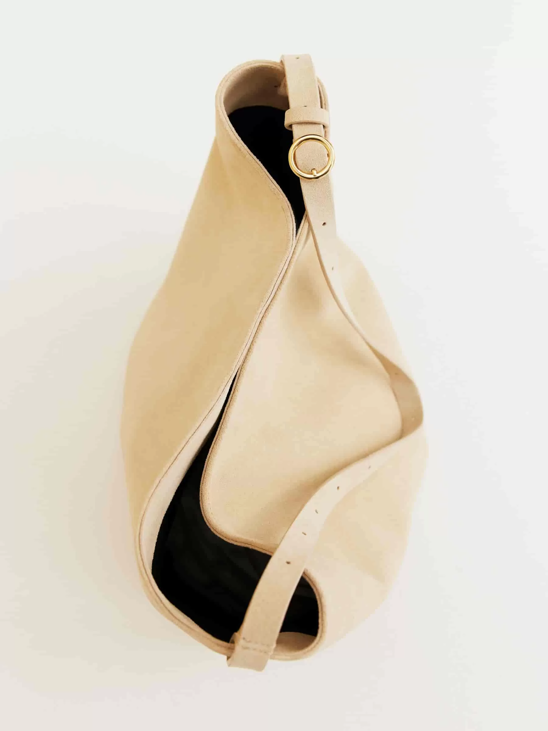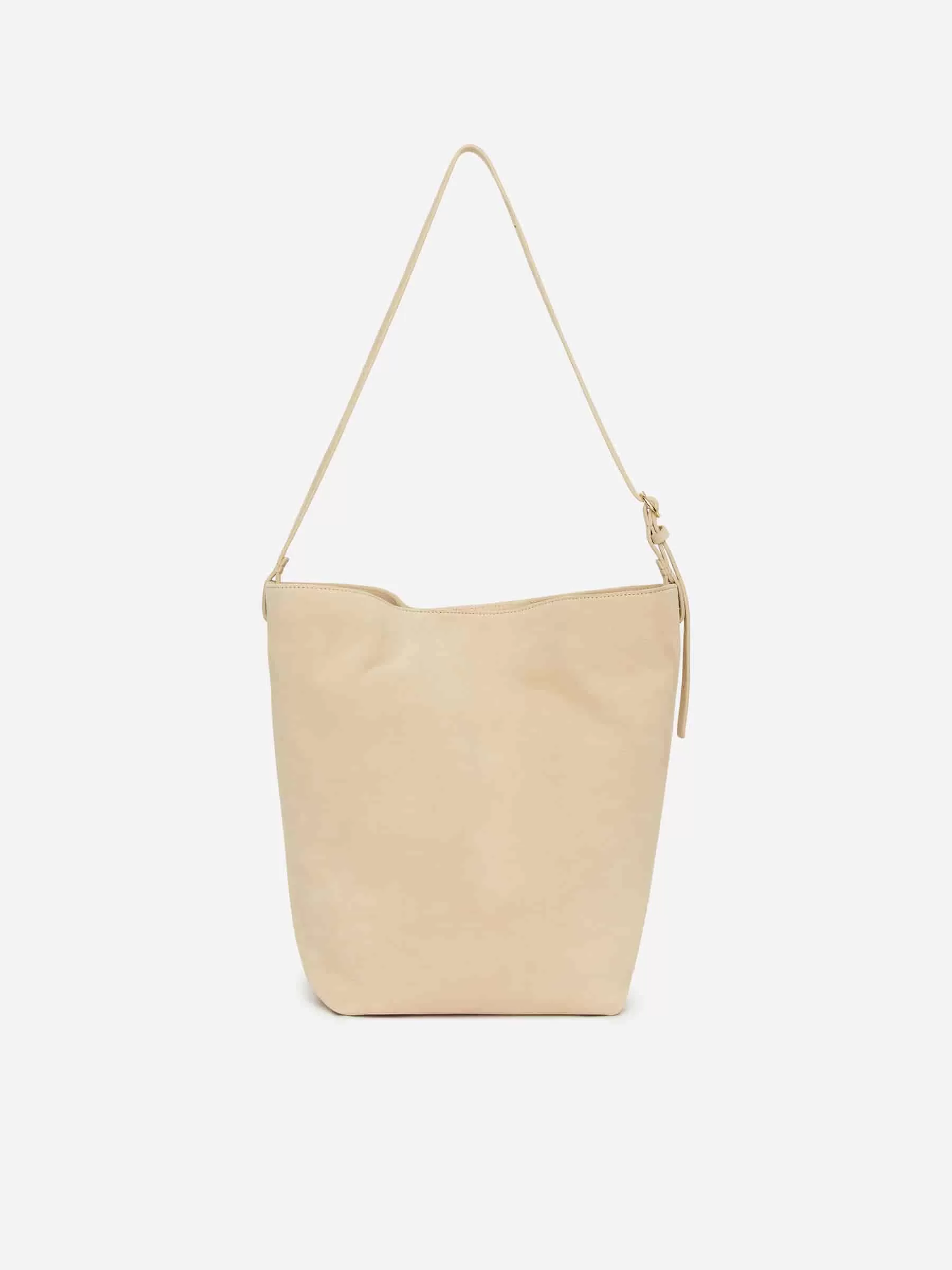 Tote bag in suede with cotton lining. Styled with a long, slim strap with holes all the way for adjustability and a small decorative round gold-toned buckle. The bag can be worn on the shoulder or as a crossbody. Magnet closure. Inside pocket with zip closure. Height 37 cm, width (top) 46 cm, width (bottom) 22.5 cm, depth 20 cm.