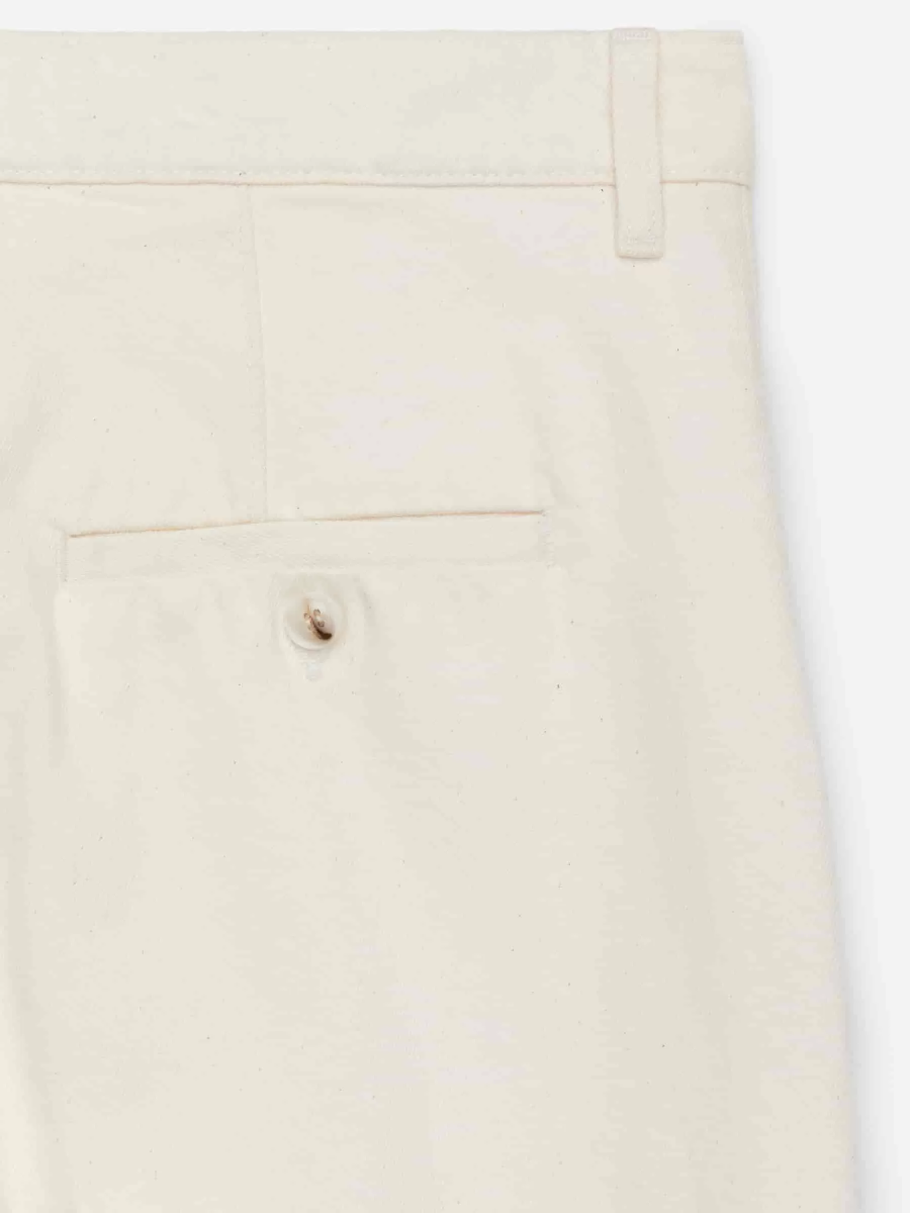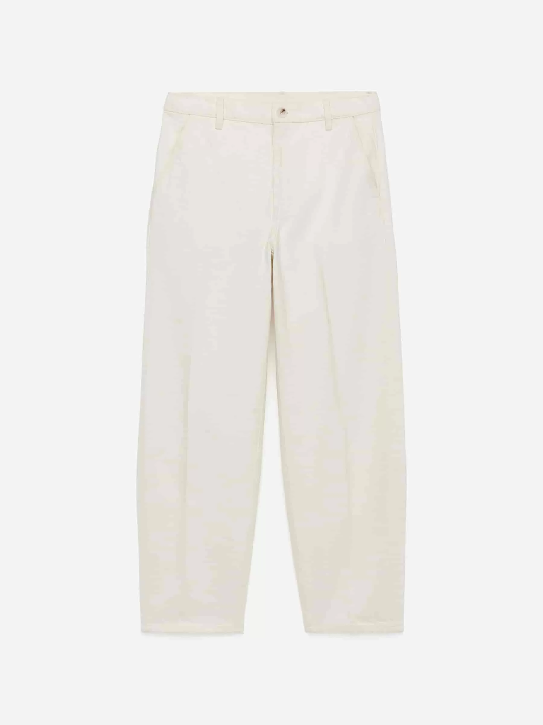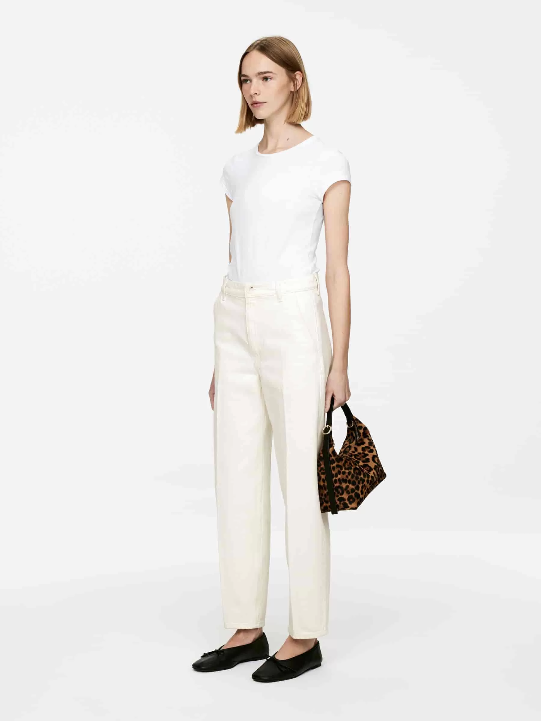 Tailored denim trousers with press creases at the front and back, a zip fly with button fastening, and slanted side pockets. Cut to fall at ankle length.