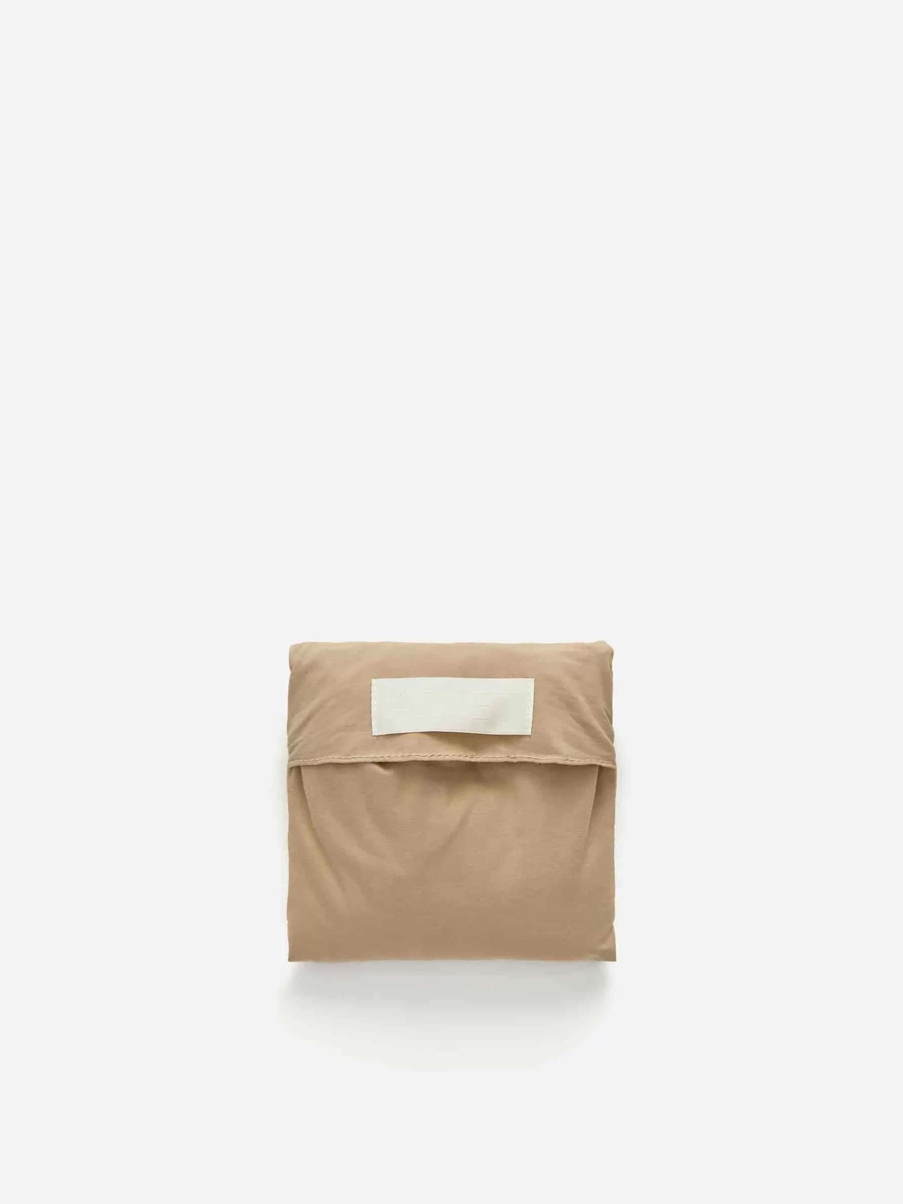 Rounded nylon tote bag with an inside pocket for packing the bag into. Body measurements: width 54 cm, height 31 cm. Handle drop 17 cm.