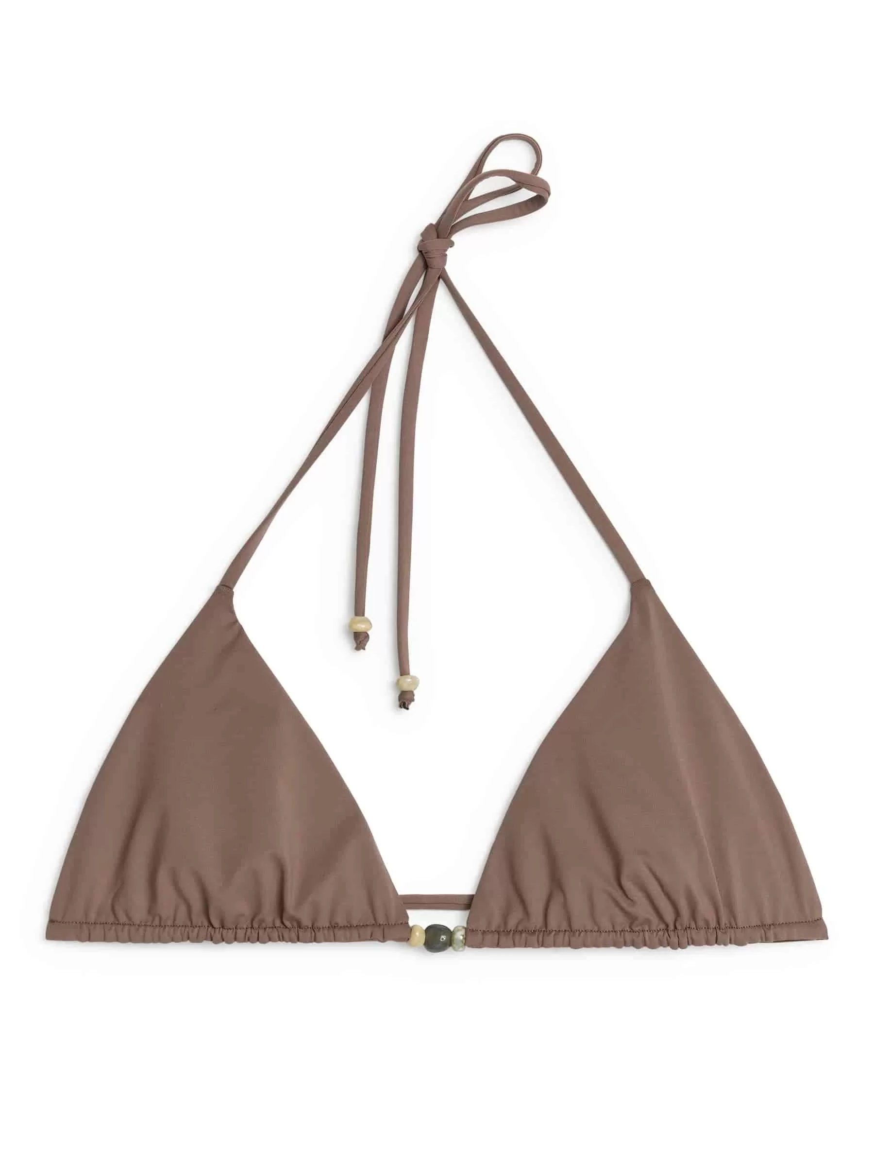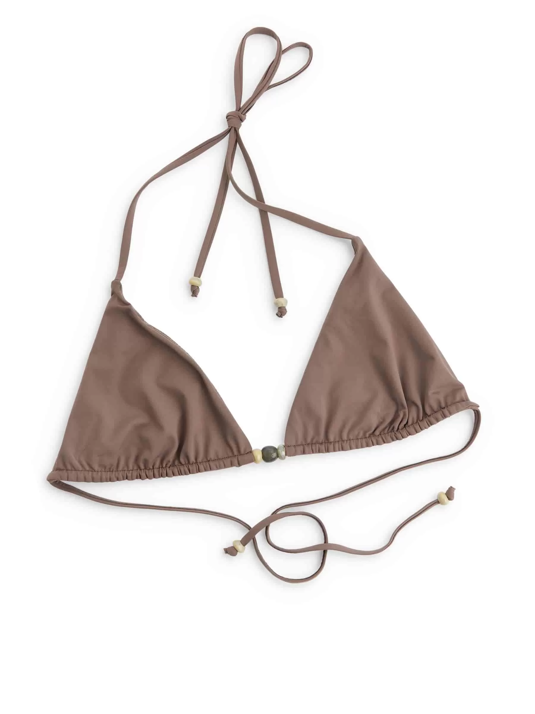 Triangle bikini top styled with decorative beads at front and thin tie straps. Low support. Tie closure at the back.