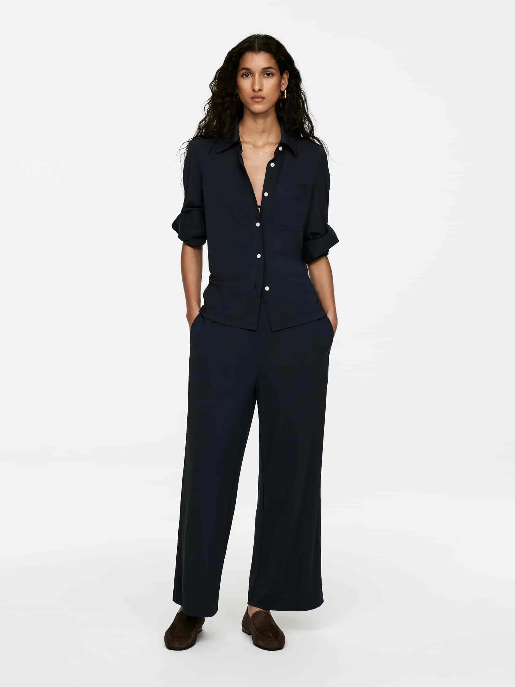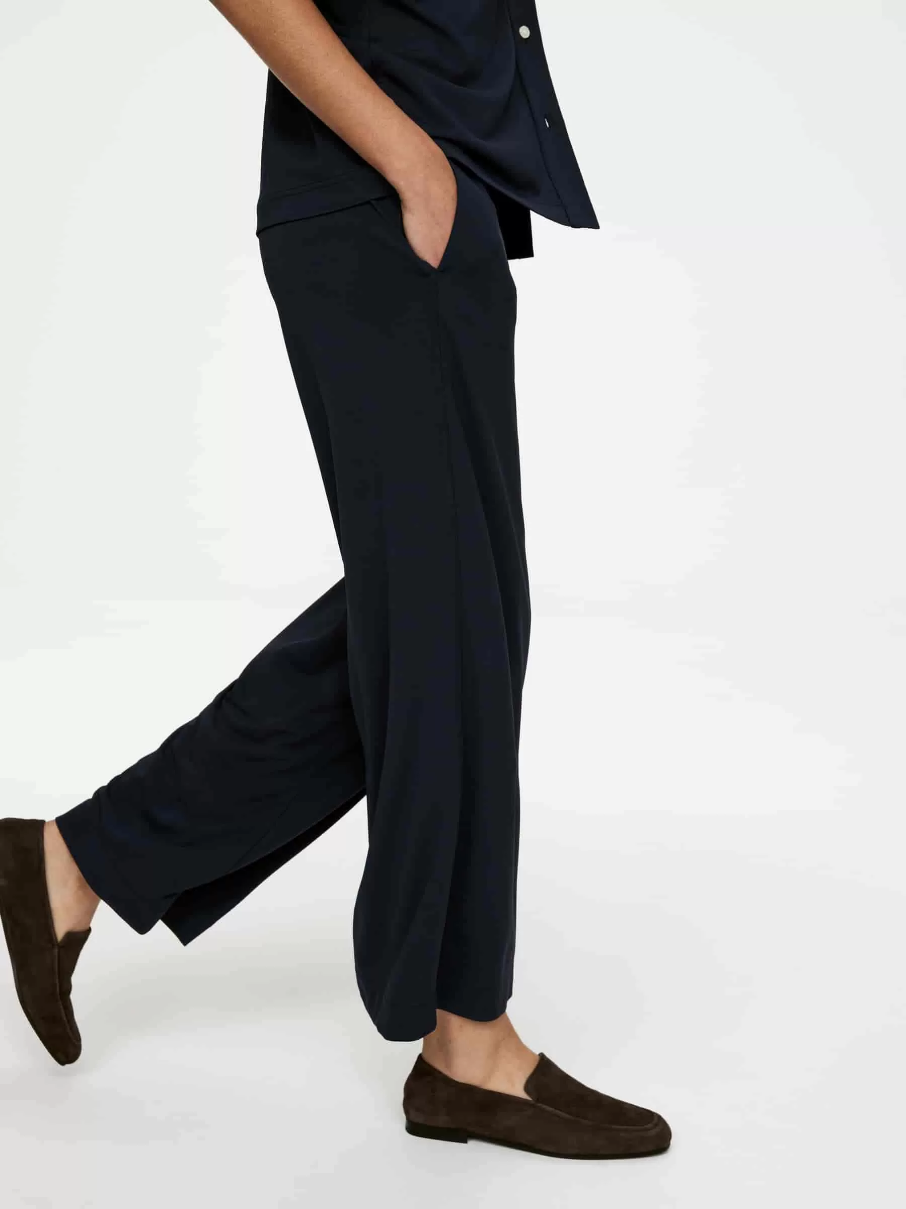 Trousers with a beautiful drape crafted from a jersey fabric made of viscose and a hint of elastane for stretch. A high-waisted, cropped style with side pockets and gathers at the back of the waistband.